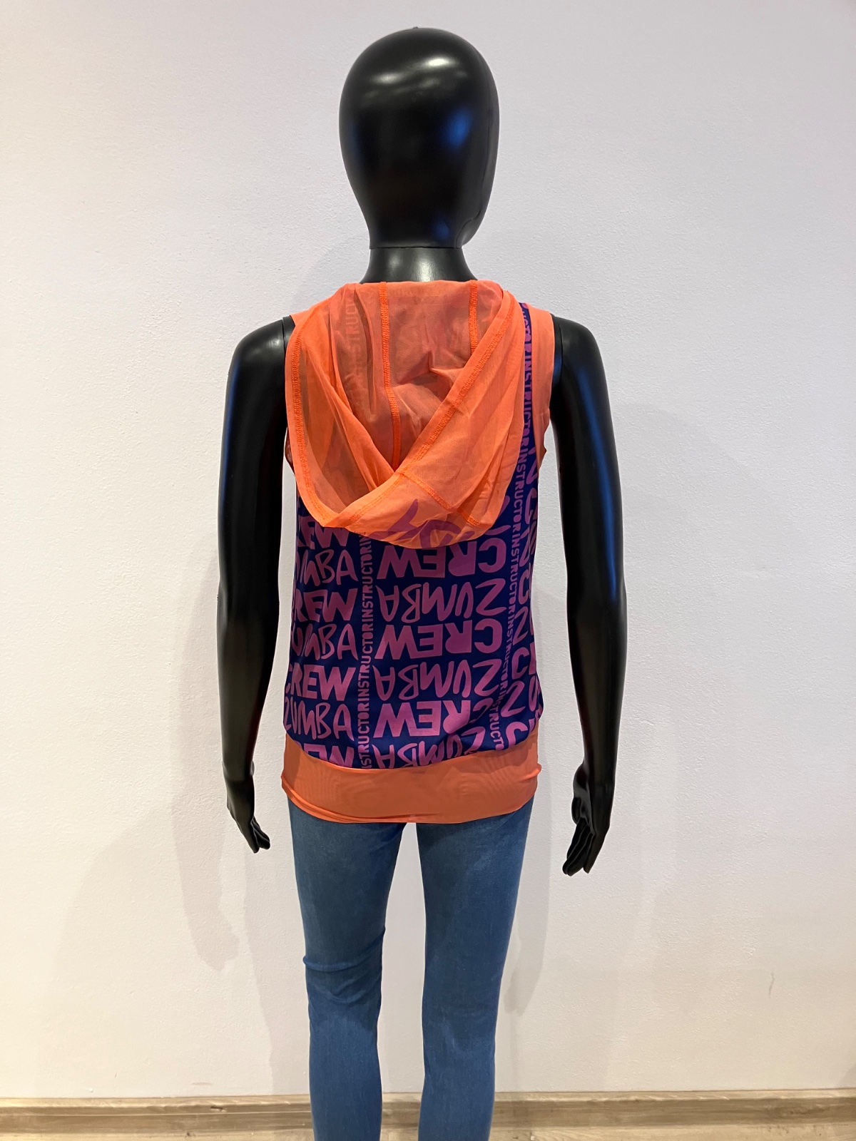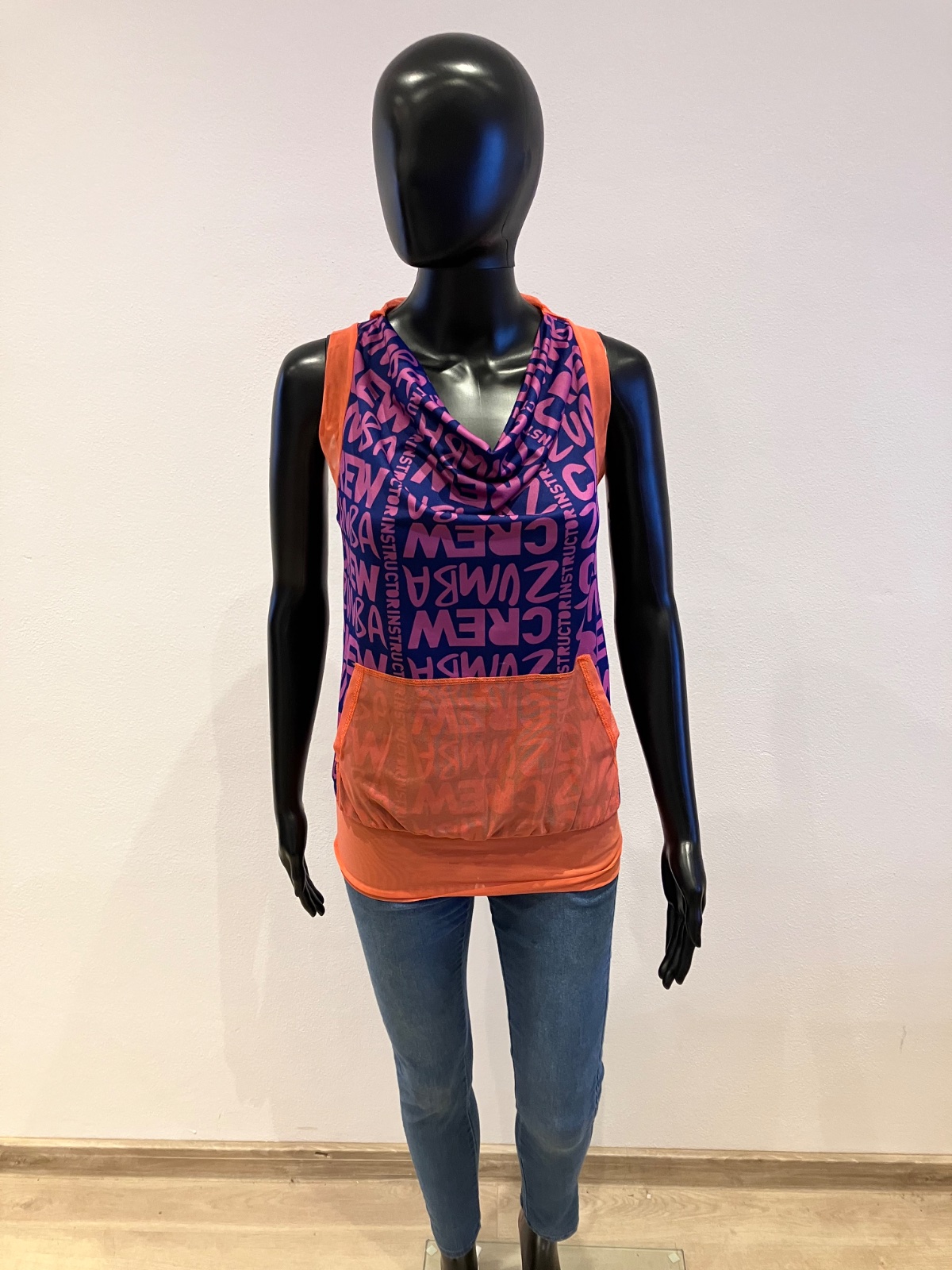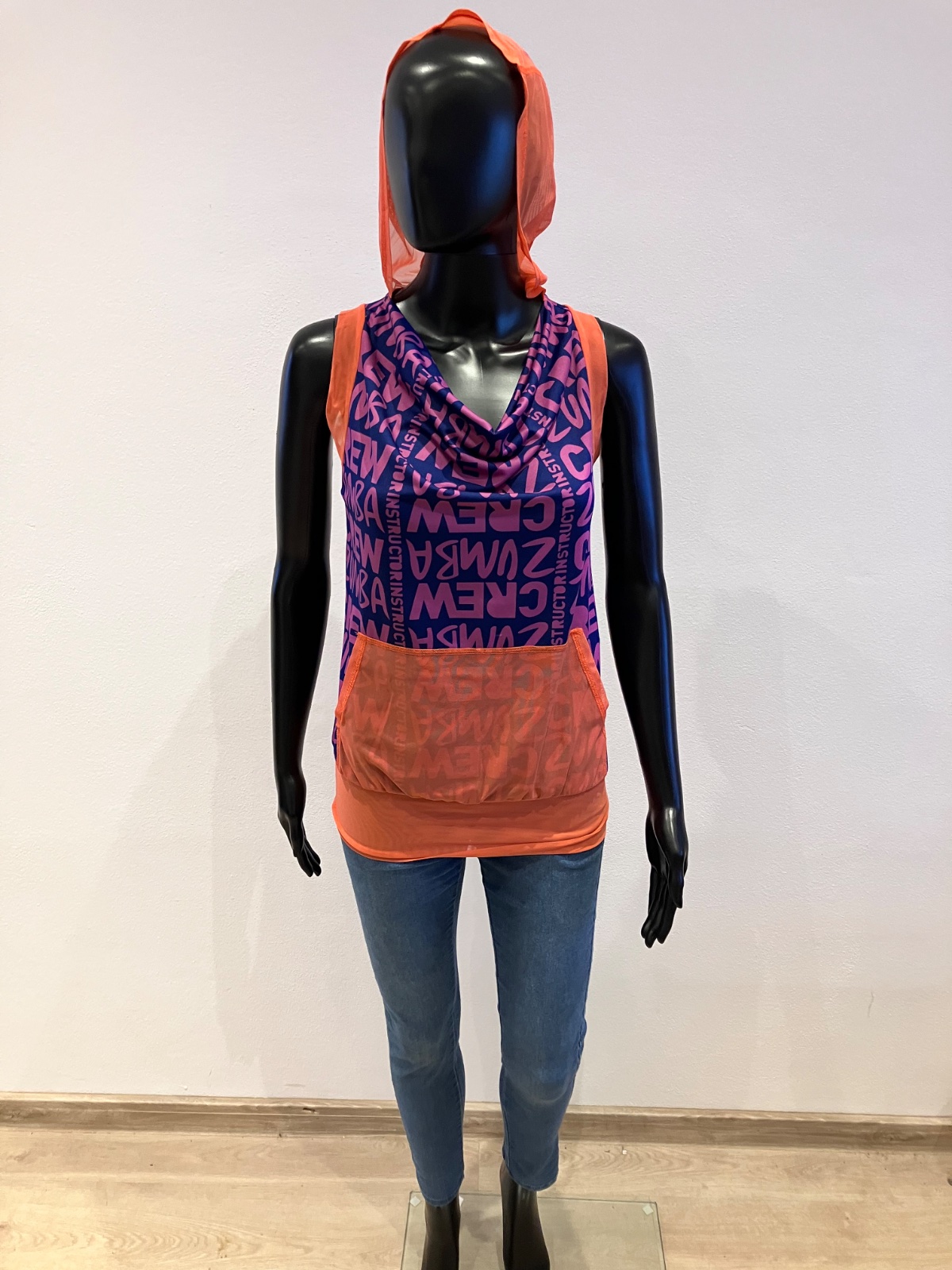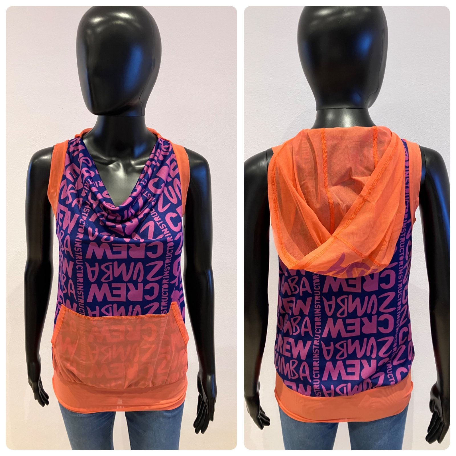 Dámske zumba fitness tričko bez rukávov s kapucňou a nápisom, elastické, tenké, na spodku široký patent, klokanie vrecko, farba fialová,tmavomodrá,oranžová, materiál: 69%polyester,24%polyamid,7%elastan.