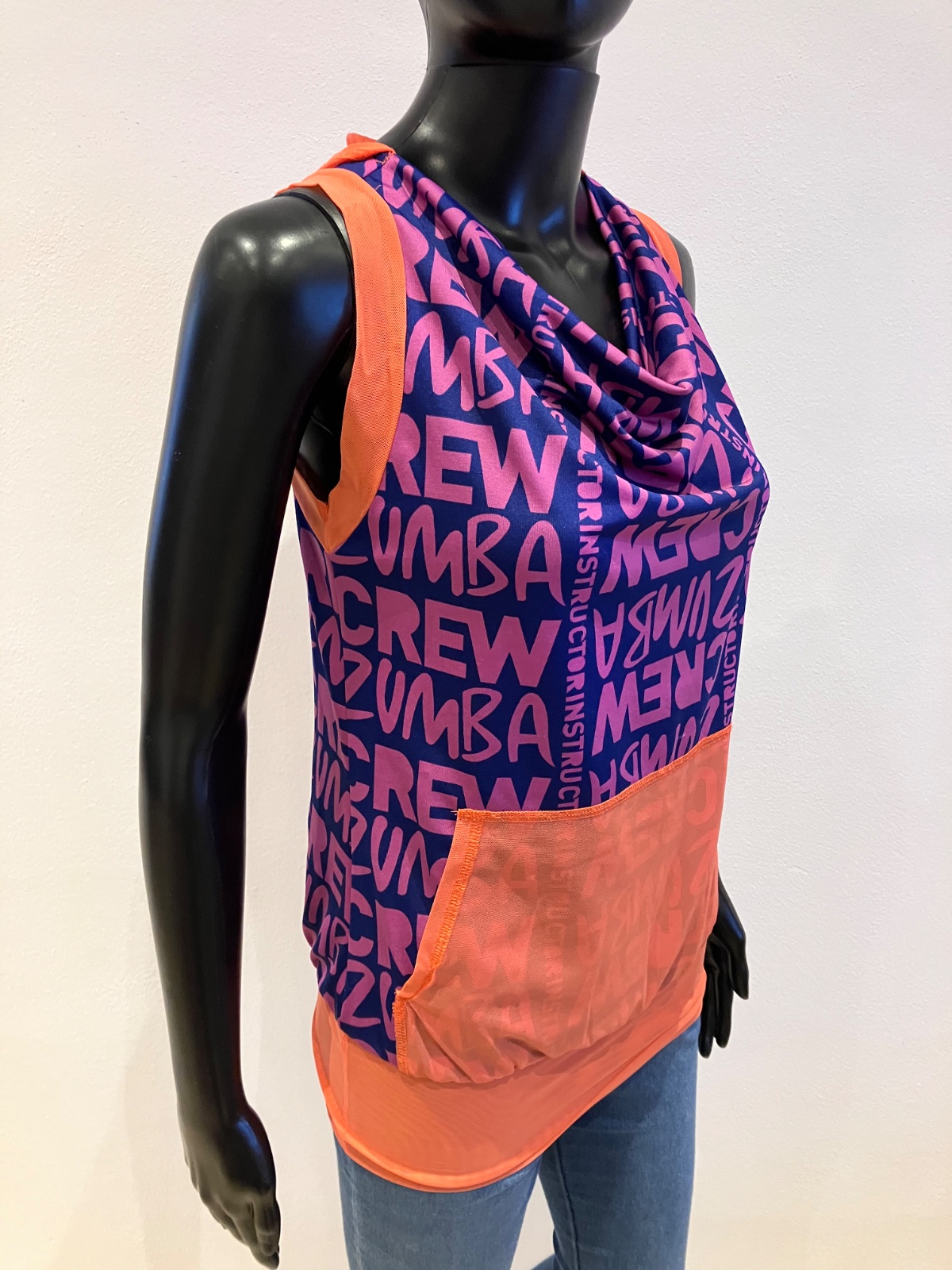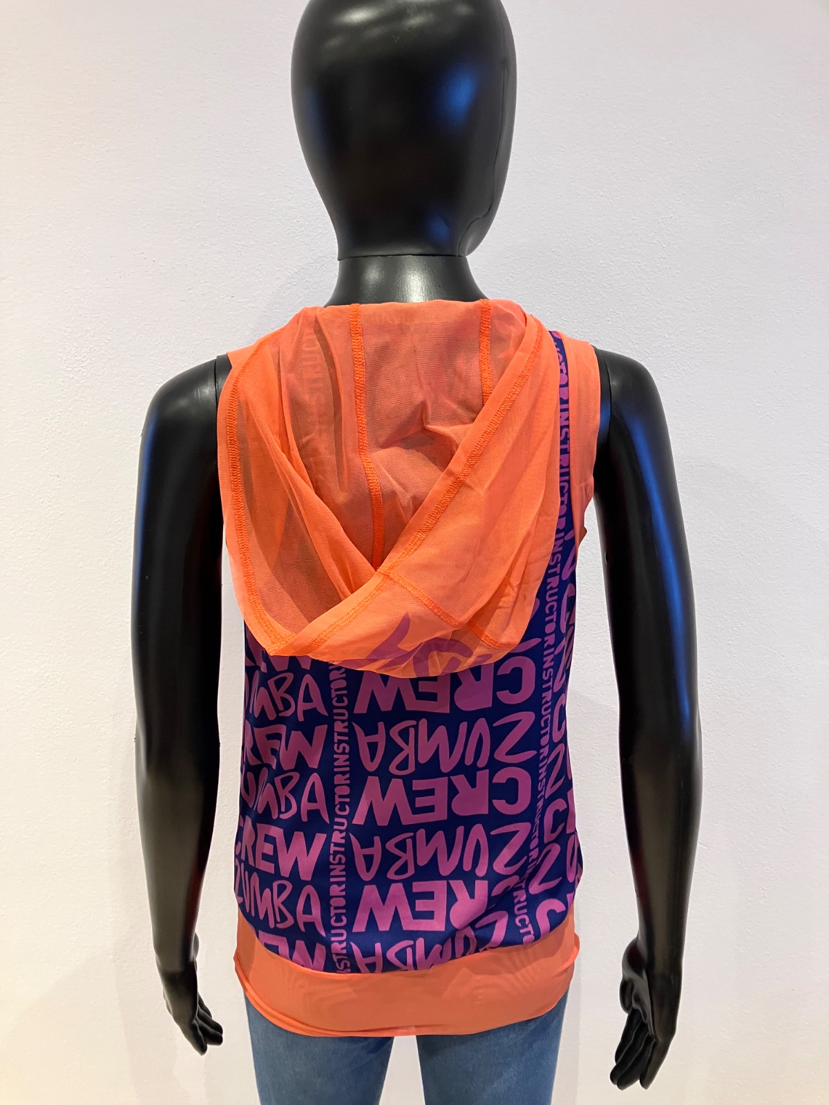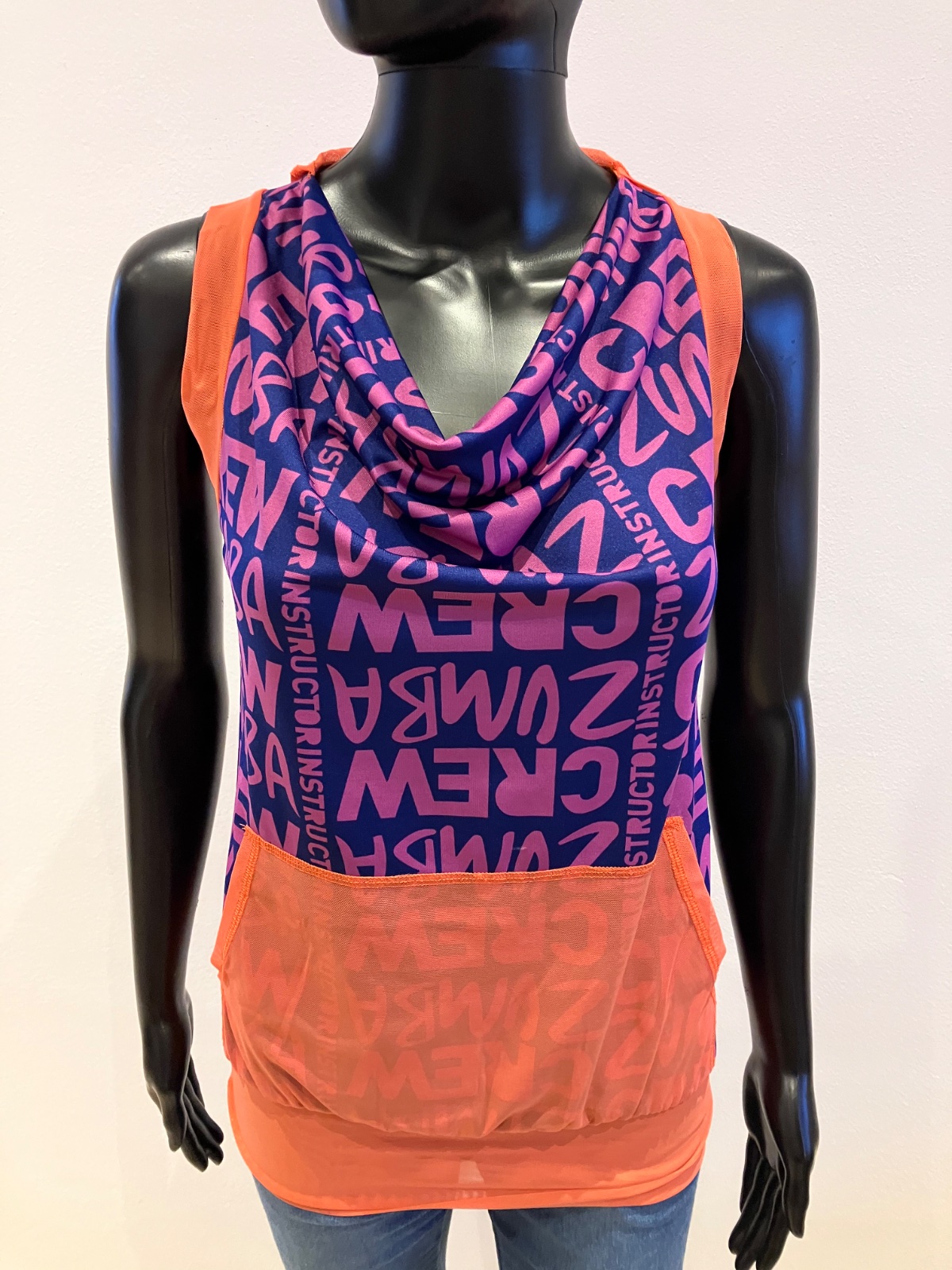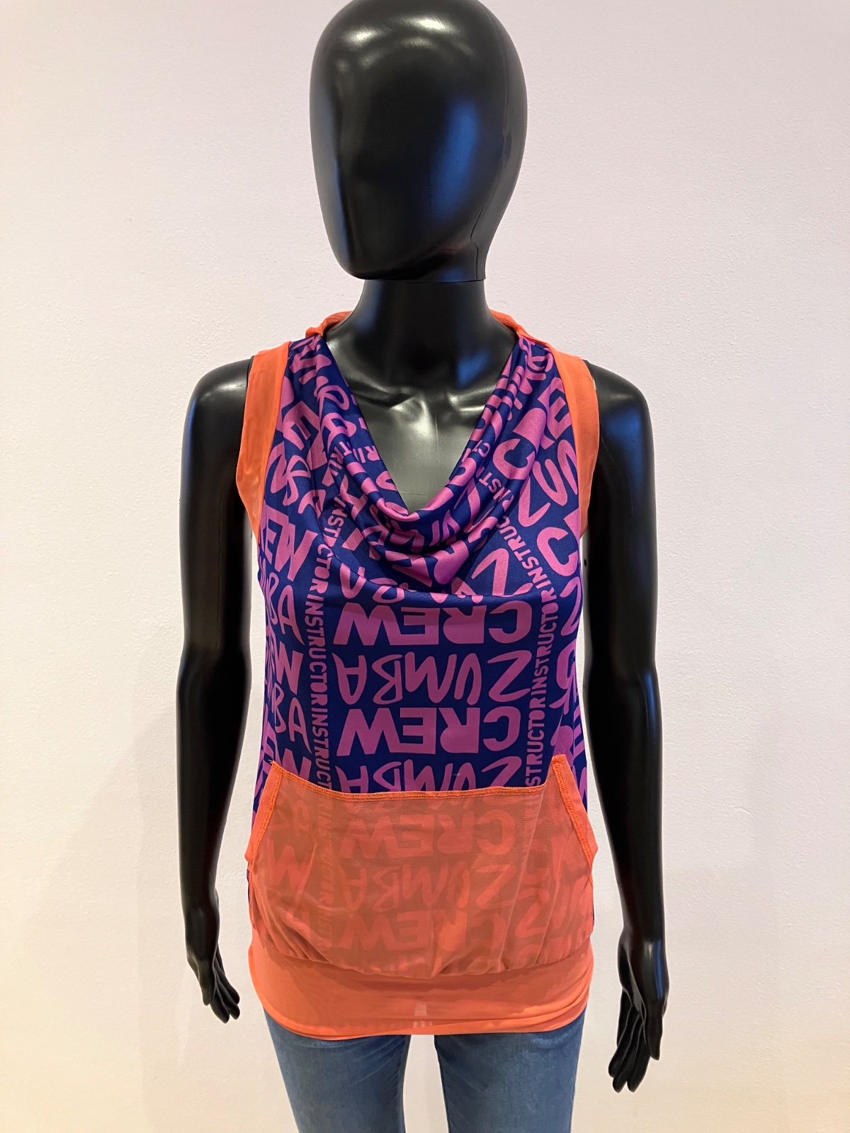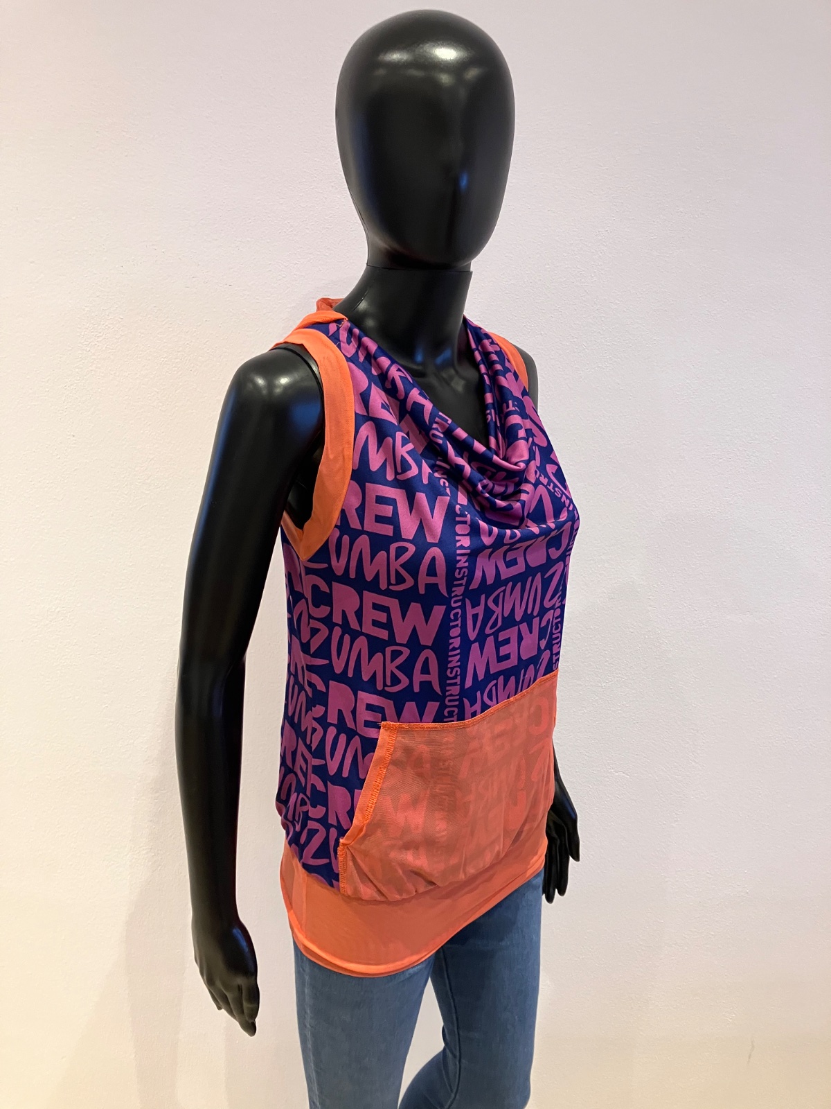 Dámske zumba fitness tričko bez rukávov s kapucňou a nápisom, elastické, tenké, na spodku široký patent, klokanie vrecko, farba fialová,tmavomodrá,oranžová, materiál: 69%polyester,24%polyamid,7%elastan.