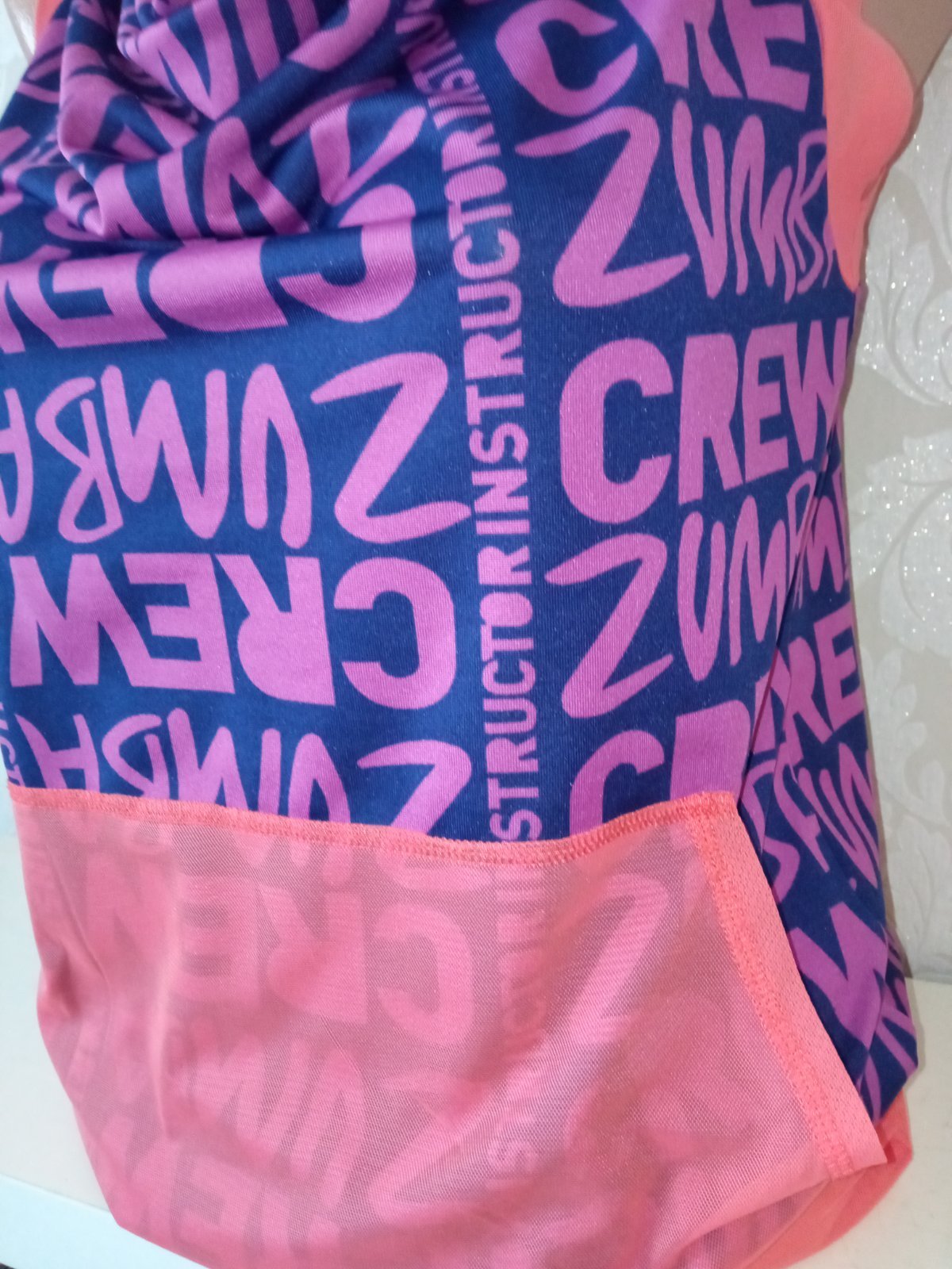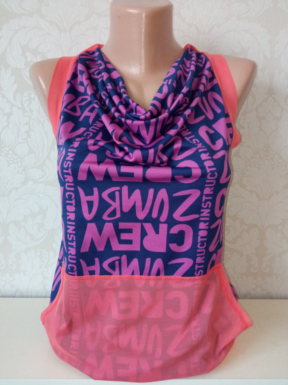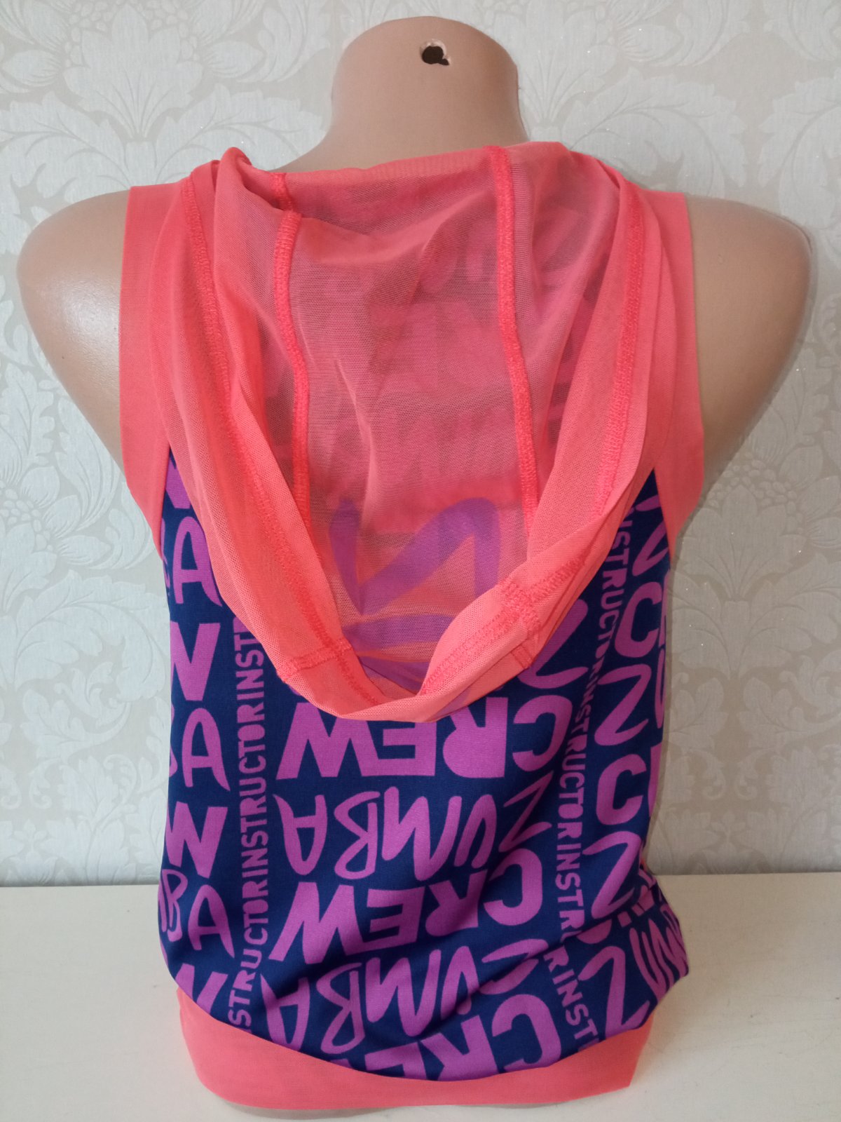 Zumba fitness tričko bez rukávov s kapucňou a nápisom, elastické, tenké, na spodku široký patent, klokanie vrecko, farba fialová,tmavomodrá,oranžová, materiál:69%polyester,24%polyamid,7%elastan.