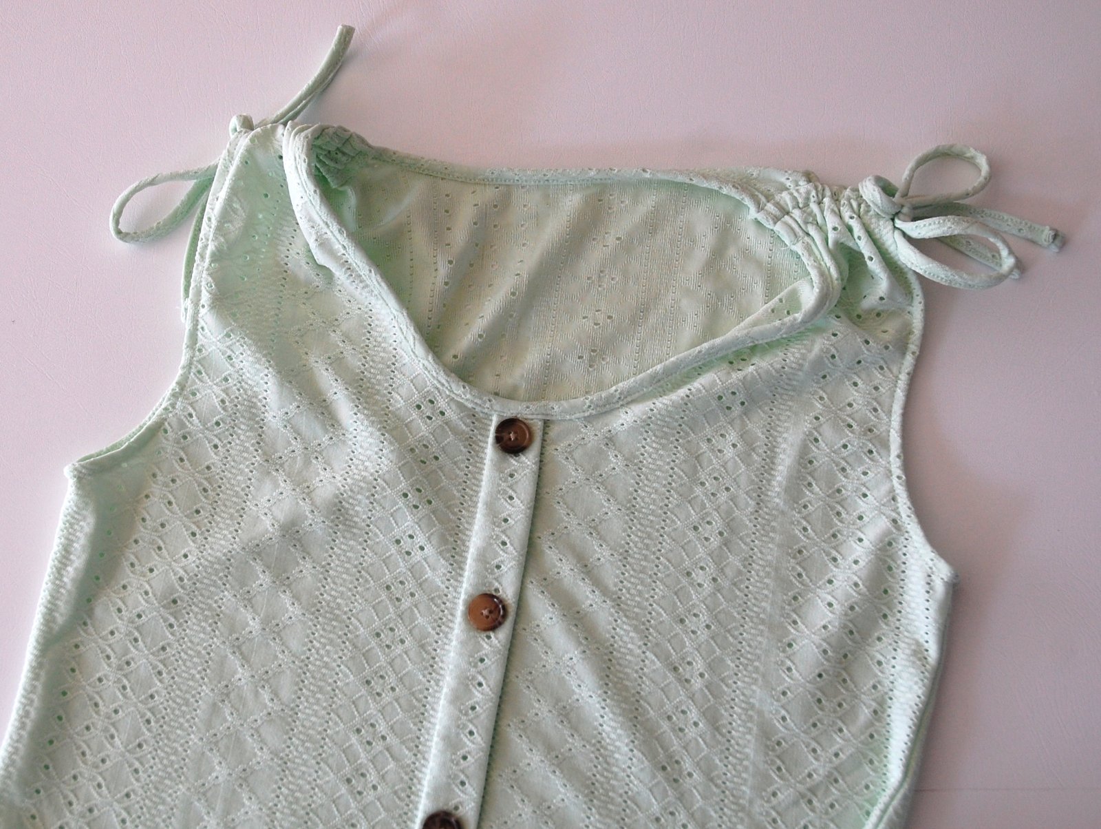 Predám krásne dámske tielko v jemnej mentolovo zelenej farbe. Tielko má romantický nádych vďaka jemnému dierovanému vzoru (eyelet embroidery) a ozdobným hnedým gombíkom na prednej strane.