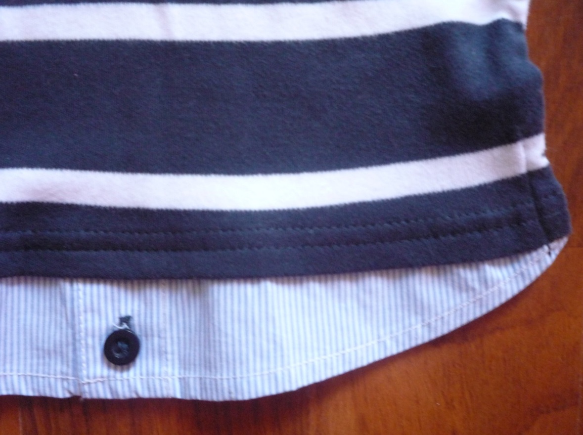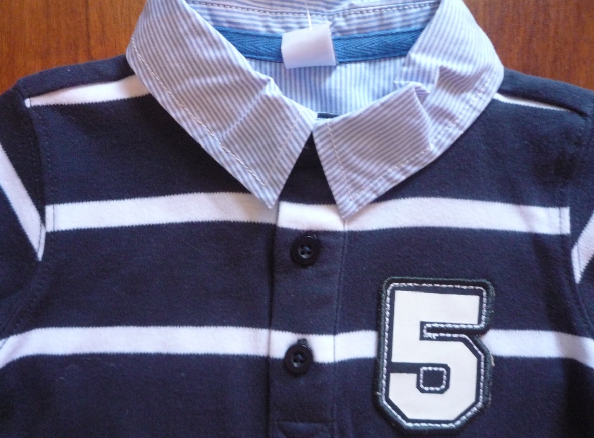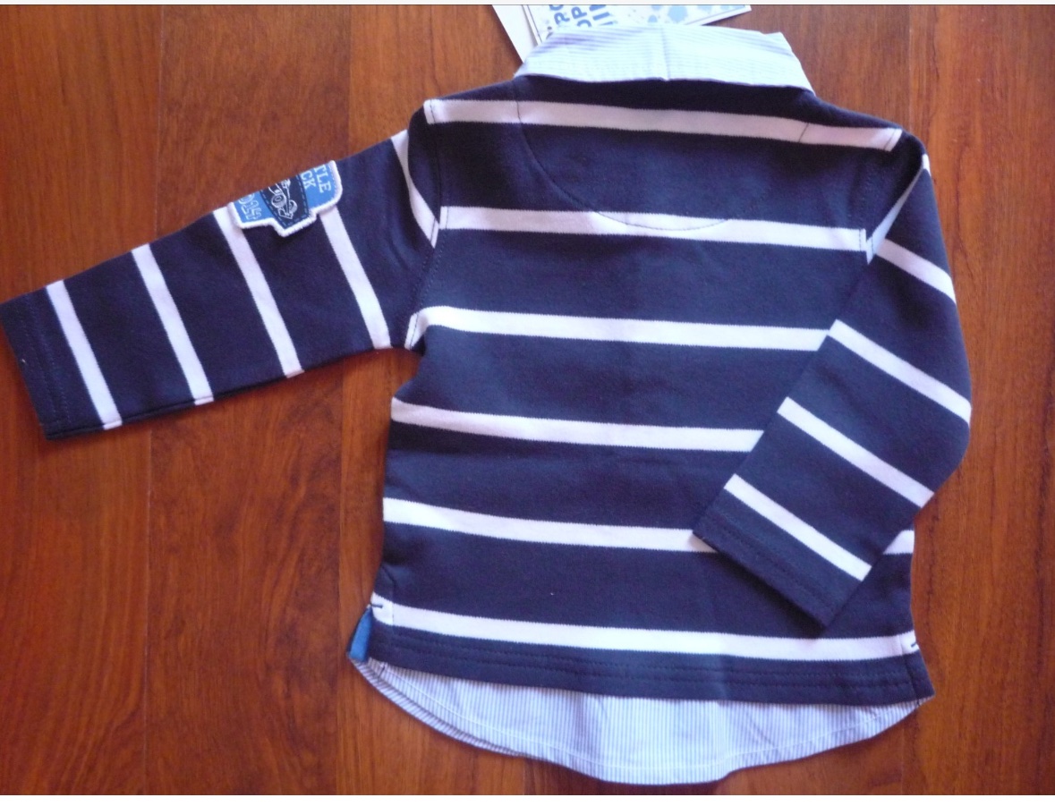 Tričko je tmavo modré s bielymi pásikmi.