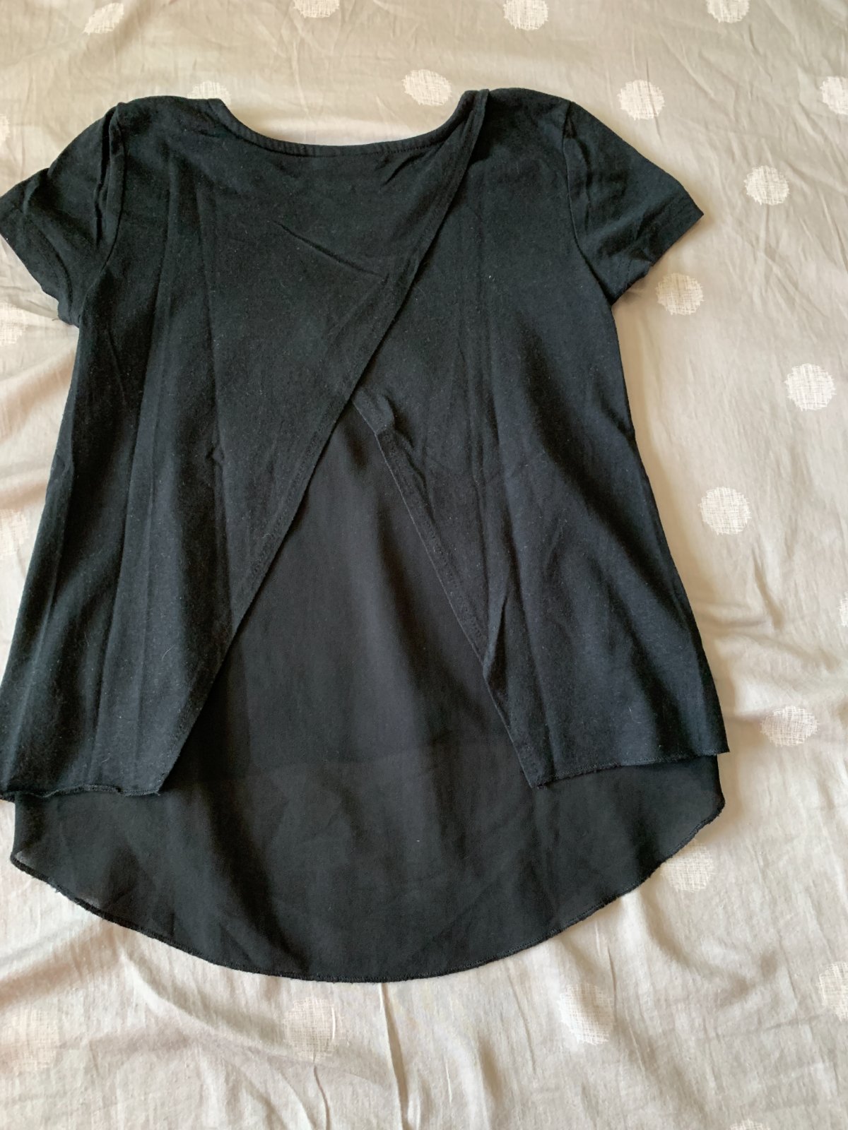 Zaujímavé tričko s predĺženou a zdvojenou chrbtovou časťou a vpredu s flitrami.