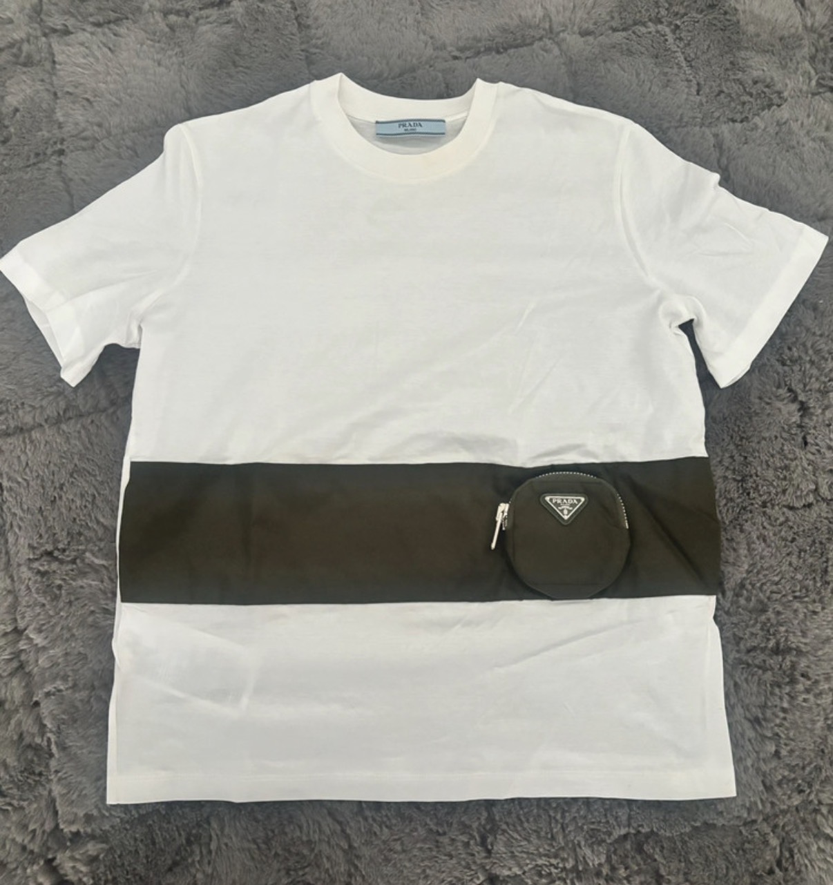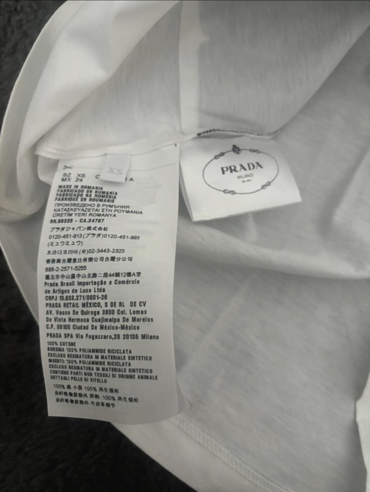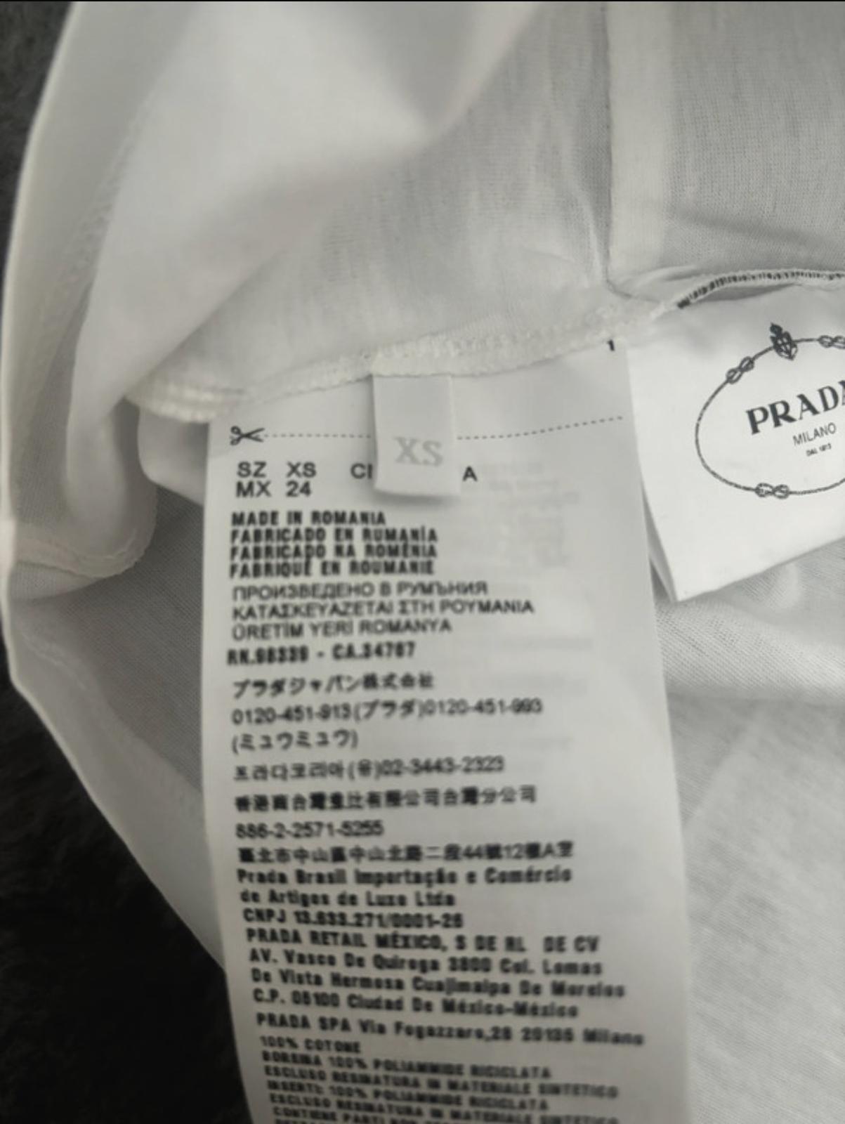 Krásne dámske tričko Prada. Materiál 100% bavlna s prvkami z recyklovaného nylonu (Re-Nylon) a kože. Biele tričko s krátkym rukávom a okrúhlym výstrihom, doplnené kontrastným khaki horizontálnym pásom. Na páse sa nachádza okrúhle vrecúško so zipsom a ikonickým trojuholníkovým logom Prada. Nové, raz vyprané a skladované. Nikdy nenosené. Velkost XS, sedí aj na S. PC:690,-€