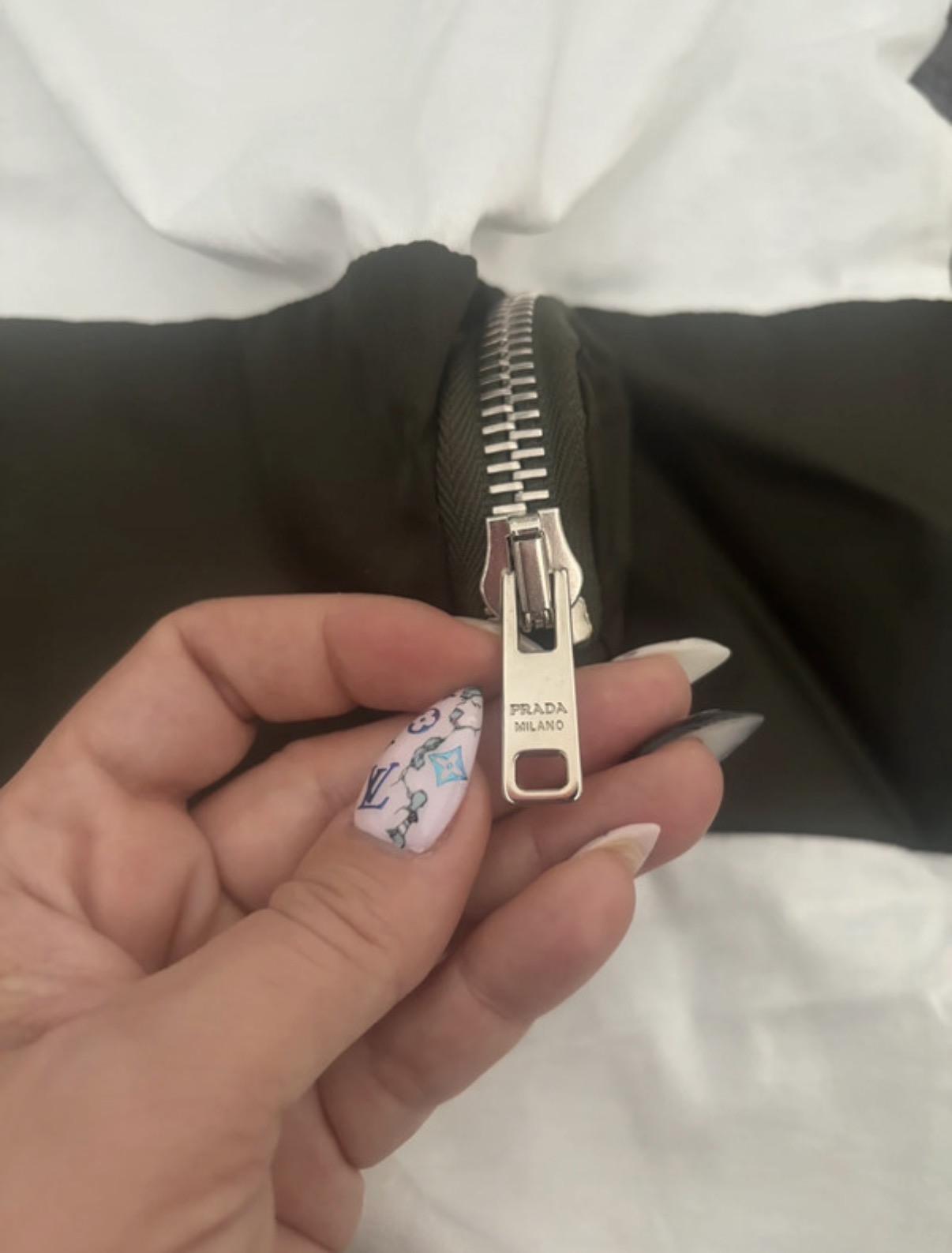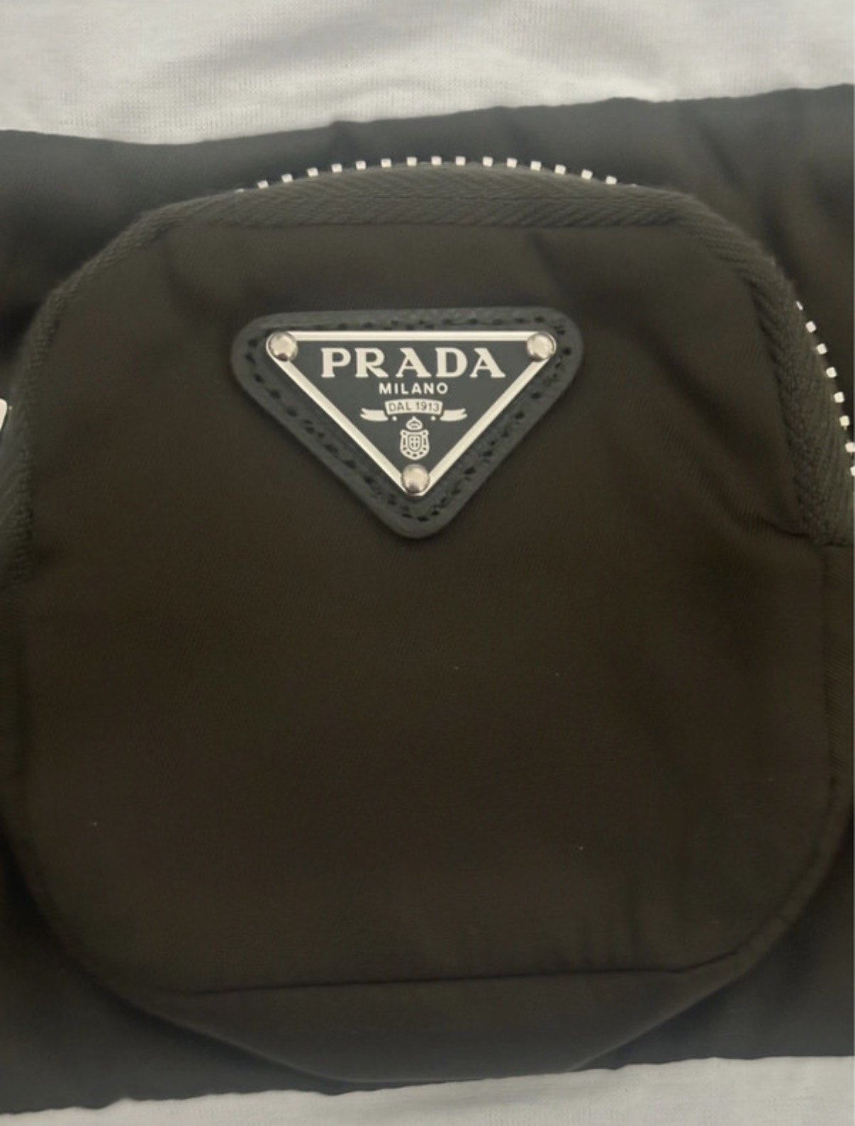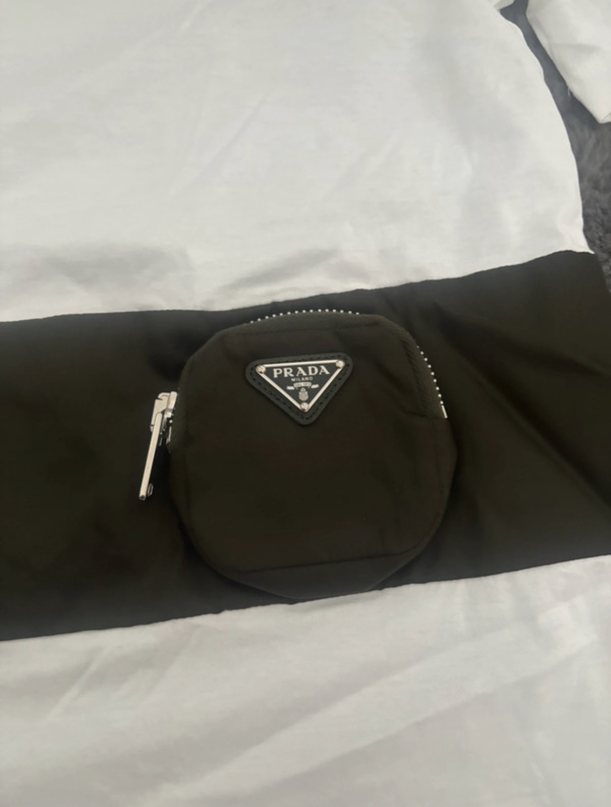 Krásne dámske tričko Prada. Materiál 100% bavlna s prvkami z recyklovaného nylonu (Re-Nylon) a kože. Biele tričko s krátkym rukávom a okrúhlym výstrihom, doplnené kontrastným khaki horizontálnym pásom. Na páse sa nachádza okrúhle vrecúško so zipsom a ikonickým trojuholníkovým logom Prada. Nové, raz vyprané a skladované. Nikdy nenosené. Velkost XS, sedí aj na S. PC:690,-€