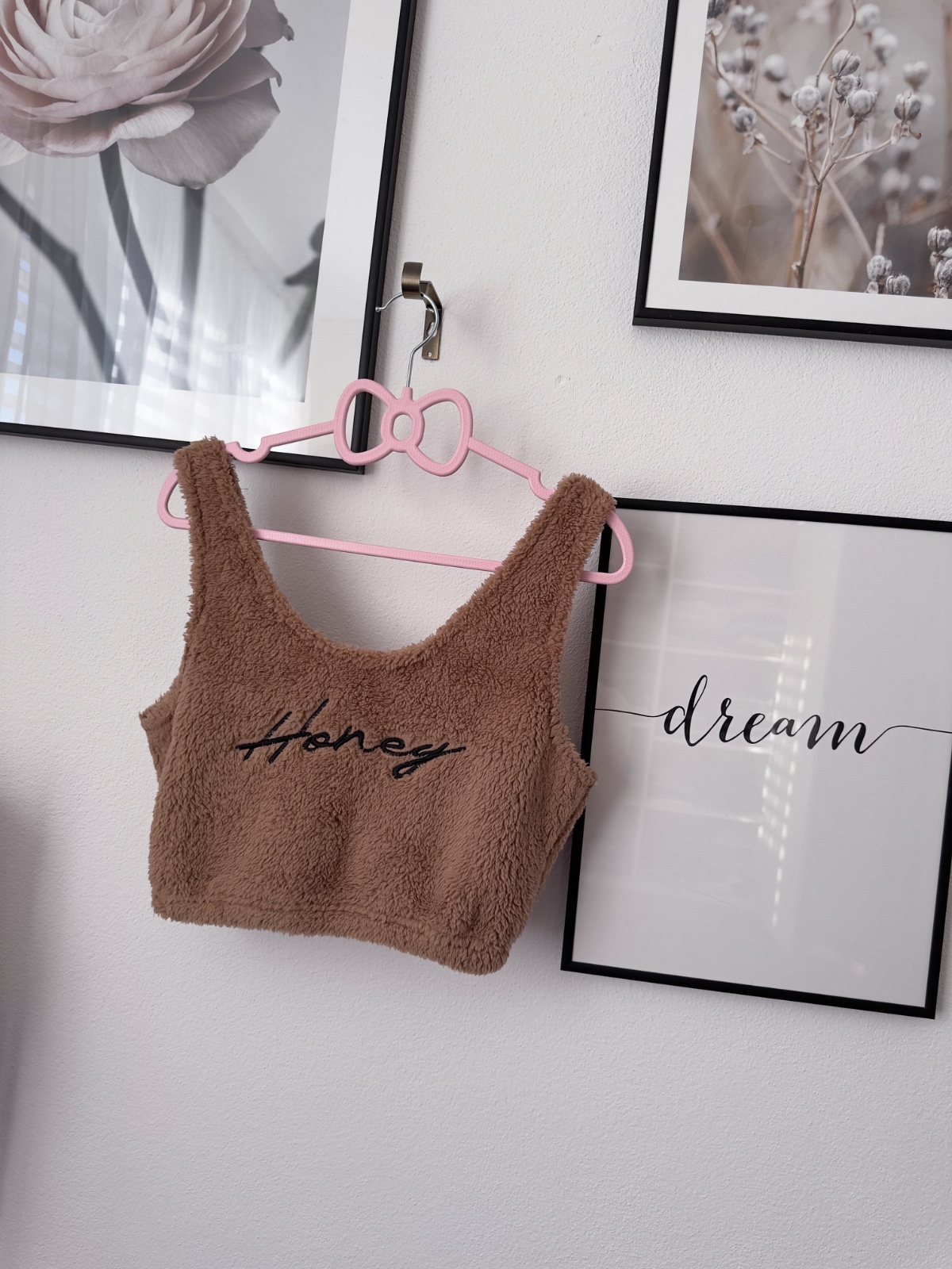 Mäkučký teddy topík, plyšový, bezchybný top stav. Nápis je vyšitý.