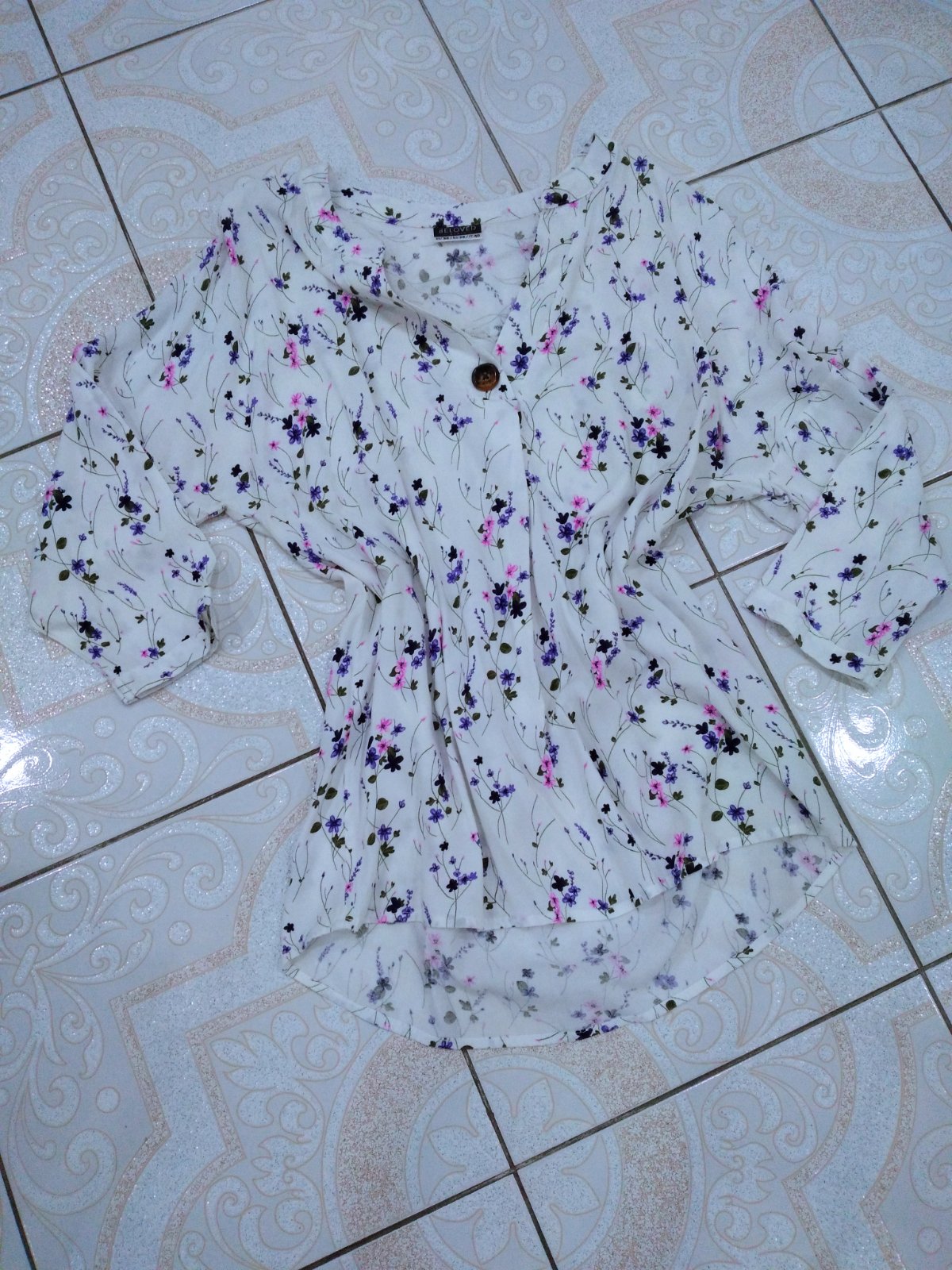 Tunika s kvietkovanou potlačou, celková dĺžka predná čast 66 cm, zadná časť 75 cm, po bokoch strihaná do oblúka, šírka cez prsia v kľude 51 cm ×2, natiahne sa do 56 cm ×2.