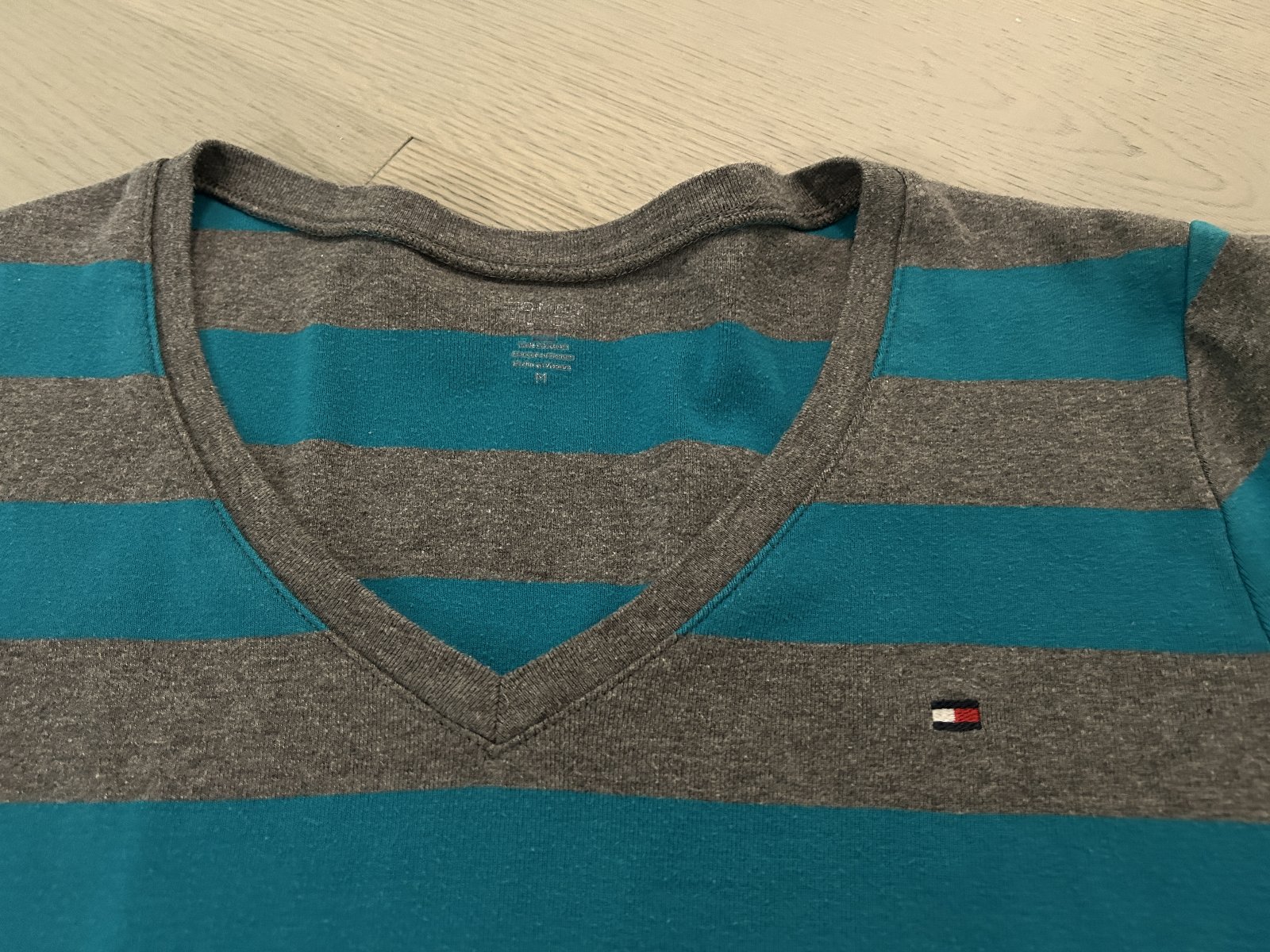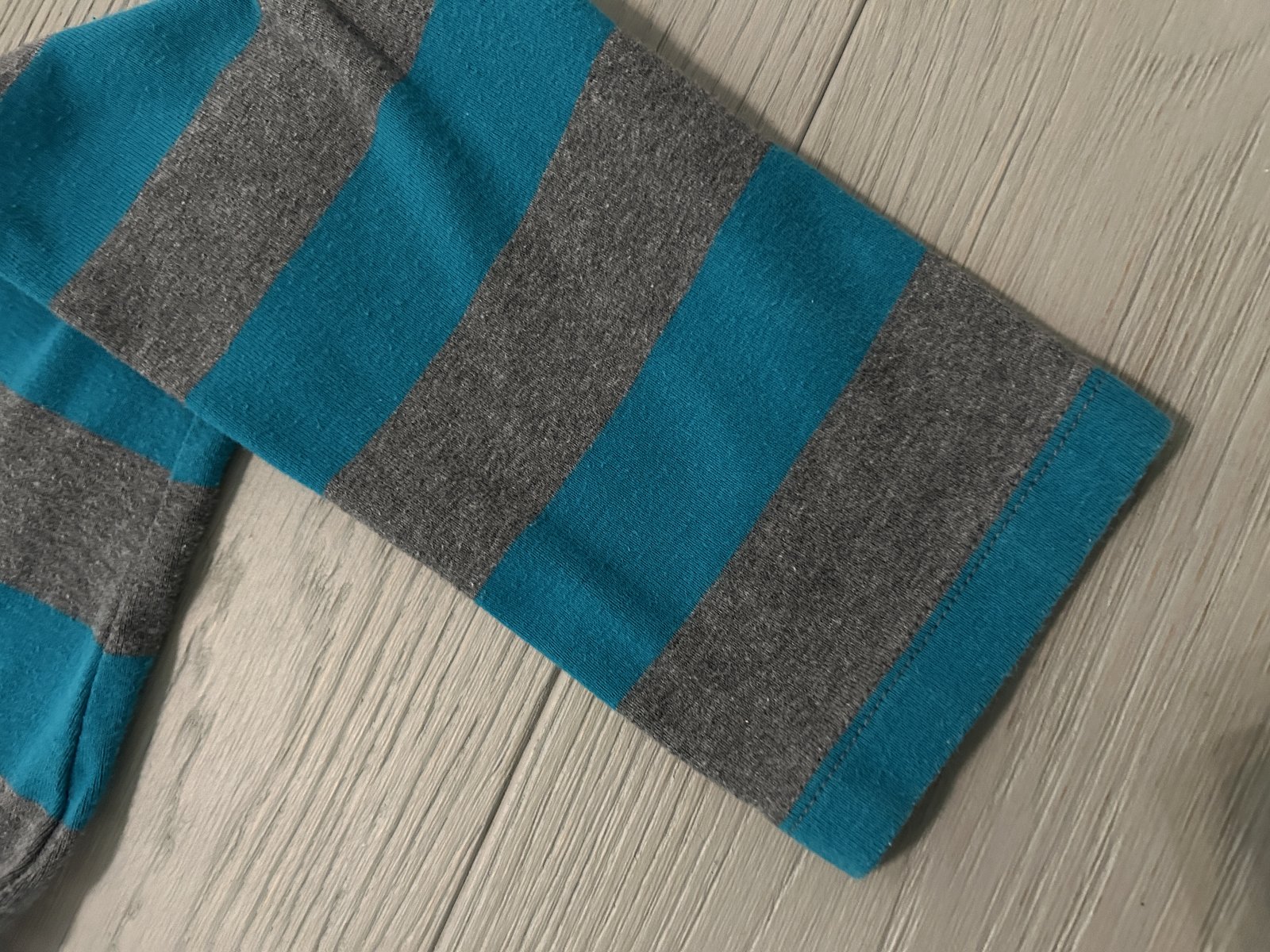 prúžkované tričko, kombinácia tyrkysovej a šedej melírovanej farby. Kupované v USA, nové, nenosené. Výstrih do V, drobný vyšívaný znak. Materiál 100% bavlna- hrubšia, elastická.