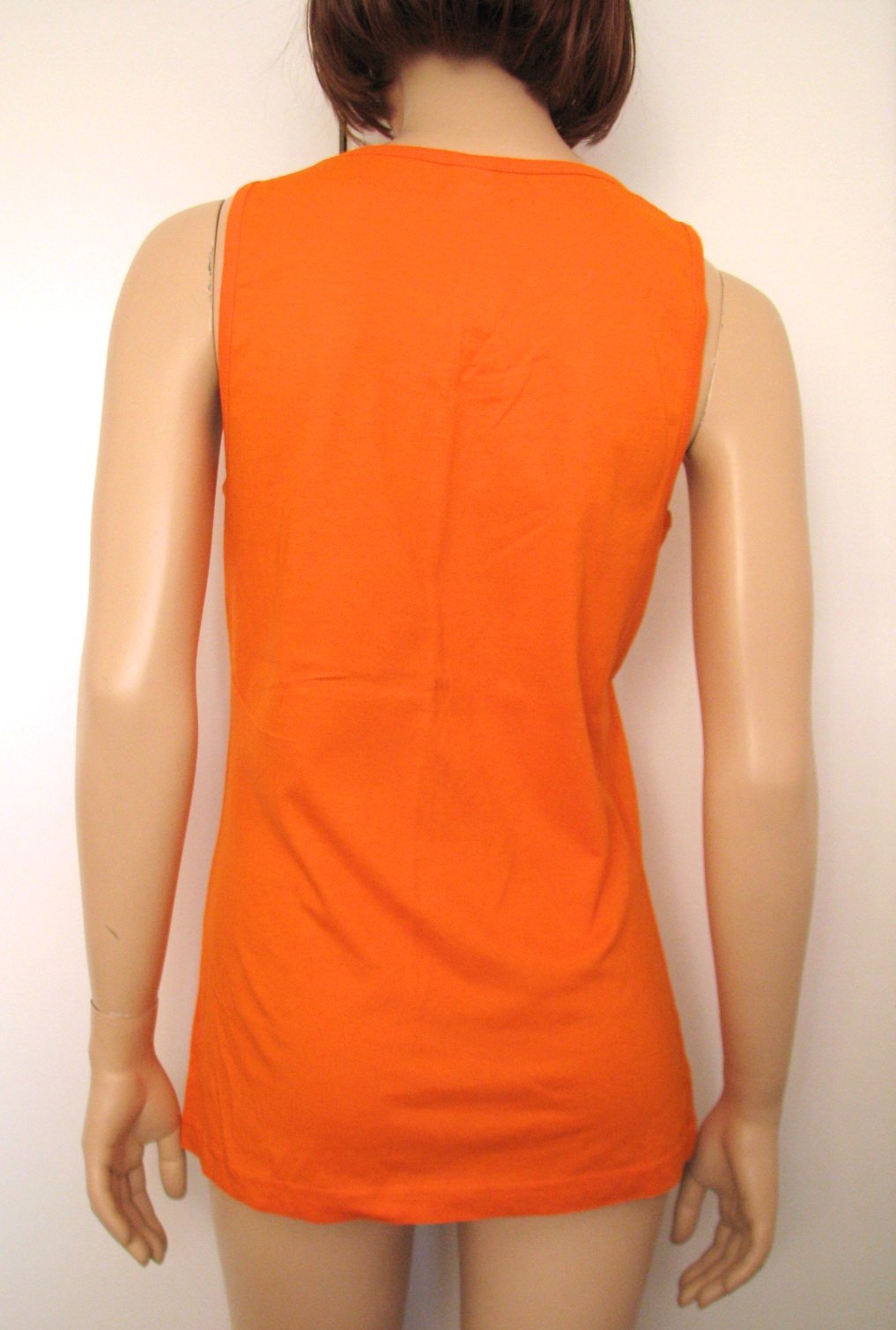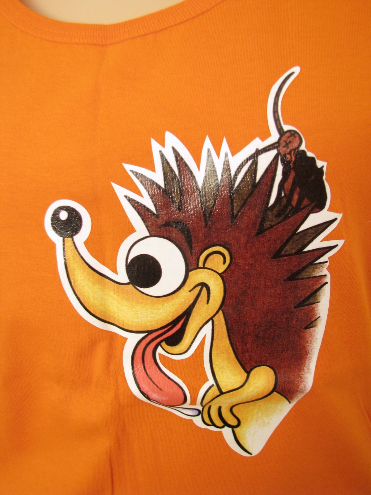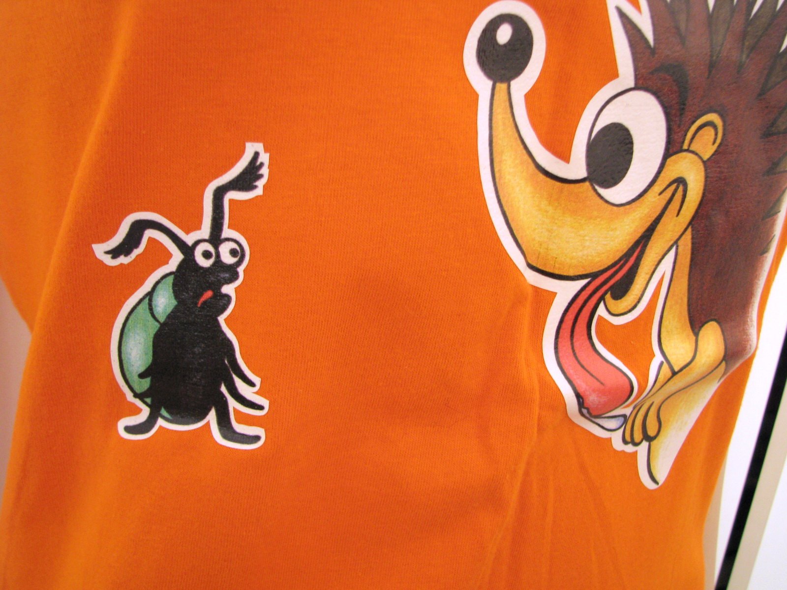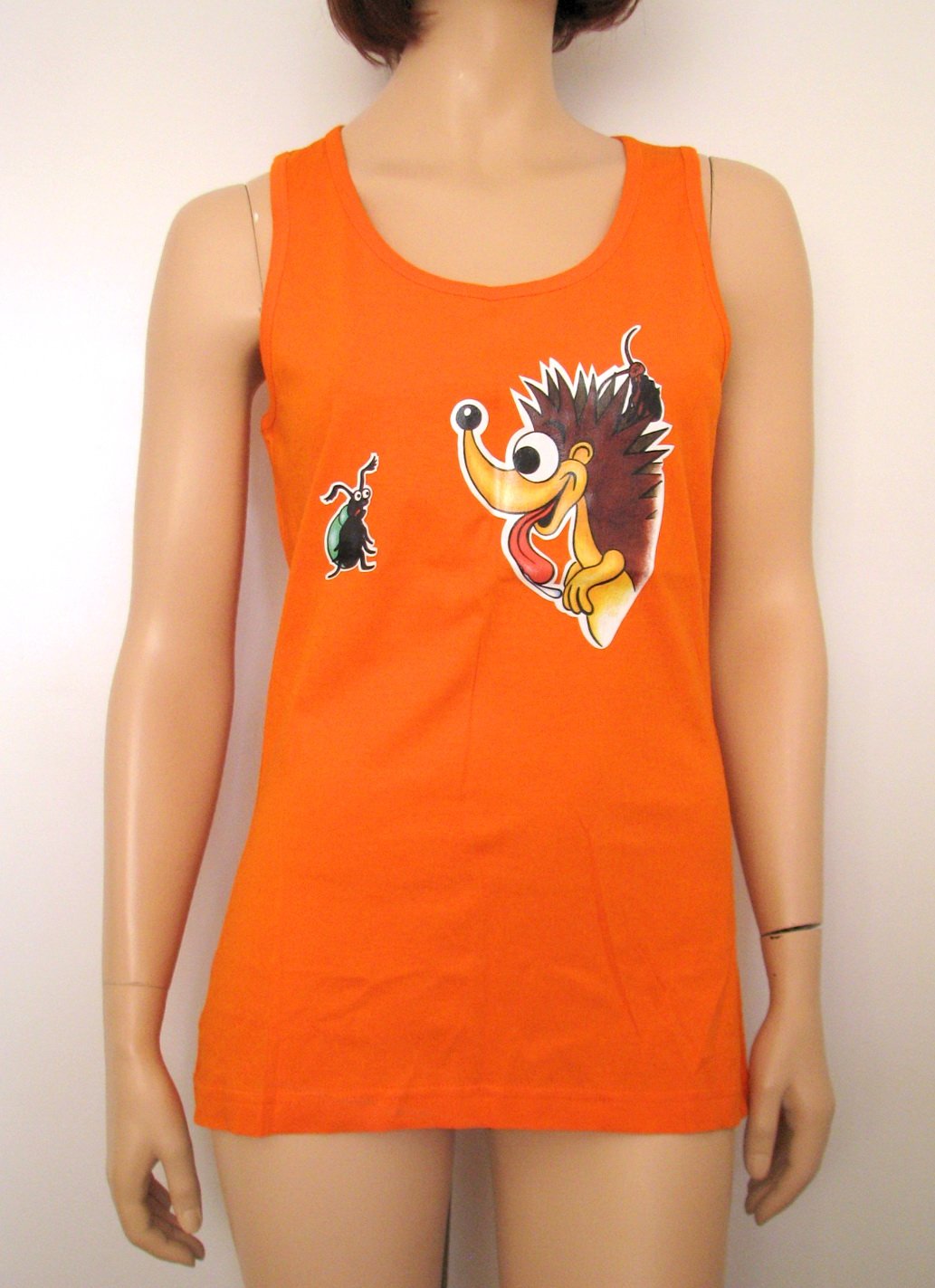 Sýto oranžové bavlnené tielko dlhšieho strihu značky Sol's, na ktorom je mnou navrhnutá potlač s názvom "Ježko nepojedá jabĺčka" zo série "Čisté pravdy o zvieratkách", s mlsným ježom a nešťastným hmyzom. Jediný originál.