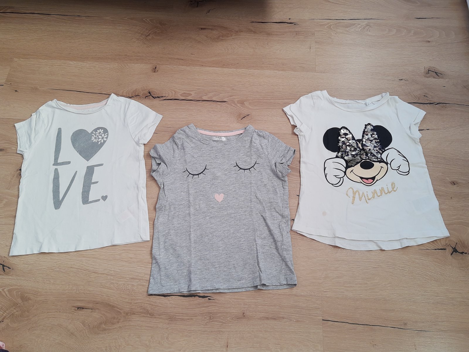 V dobrom nosenom stave nepoškodené len na Minnie H&M tričku je kaz kuk foto. Love tričko je Zn.F&F a sivé tričko je z Pepco.