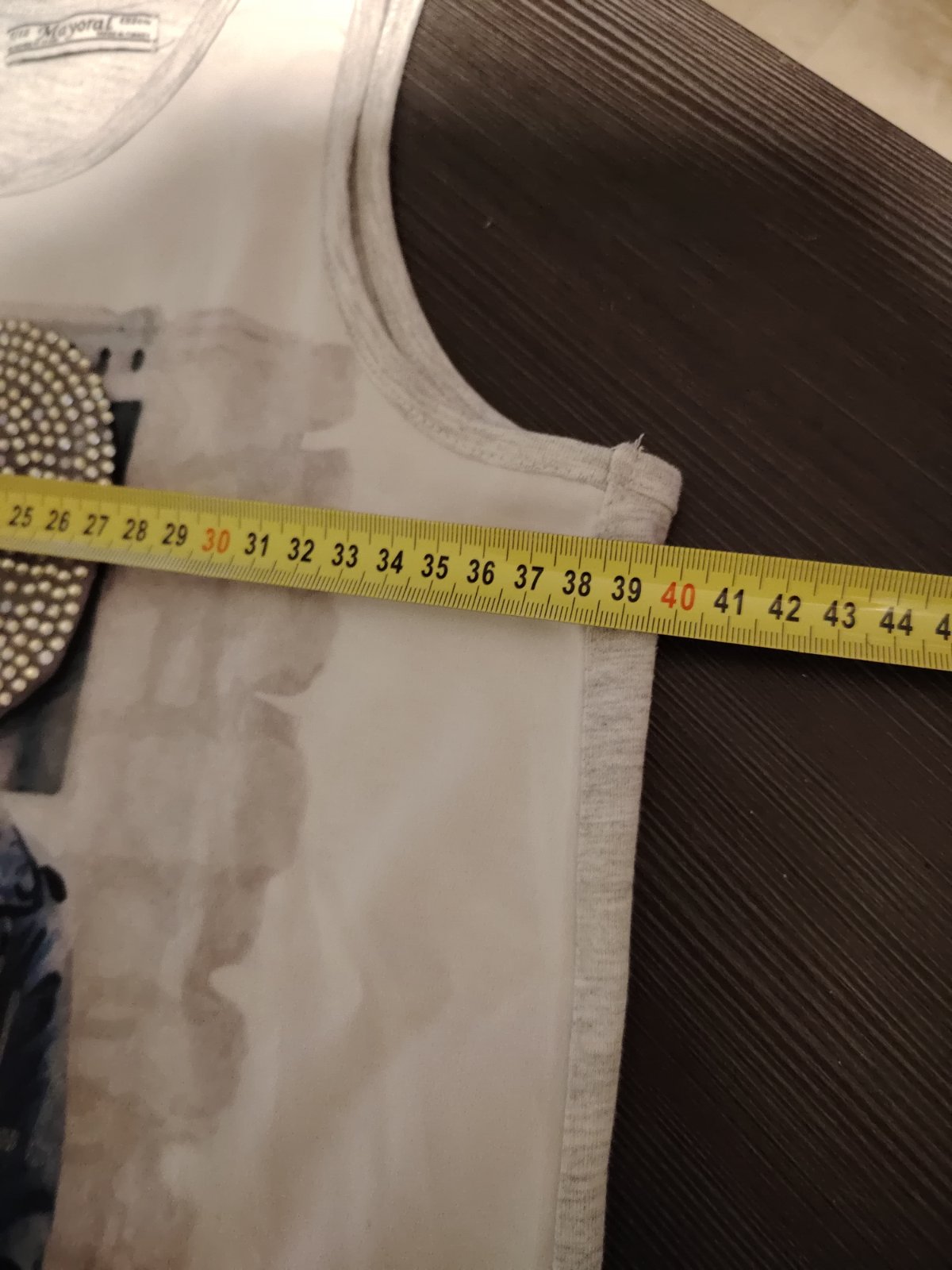 Predam krasny top s volanmi, trosku, zn. Mayoral, velkost 152, zapinanie vzadu na gombik. Rozmery: sirka pod pazuchami: 41cm, celkova dlzka: 64 cm. Top stav, super na bezne nosenie aj na prilezitost.