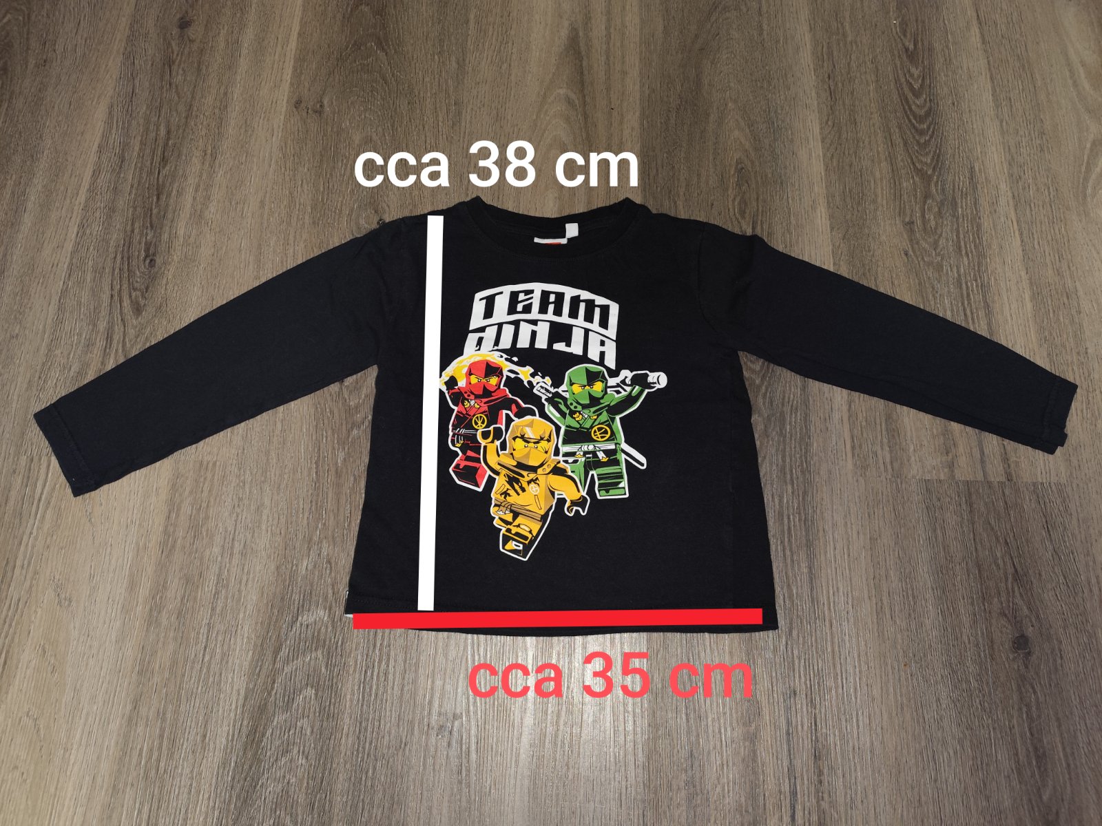 Pekné čierne tričko Ninjago s dlhým rukávom po 1 dieťati, veľkosť na štítku uvedená 116, rozmery sú na poslednej fotke.