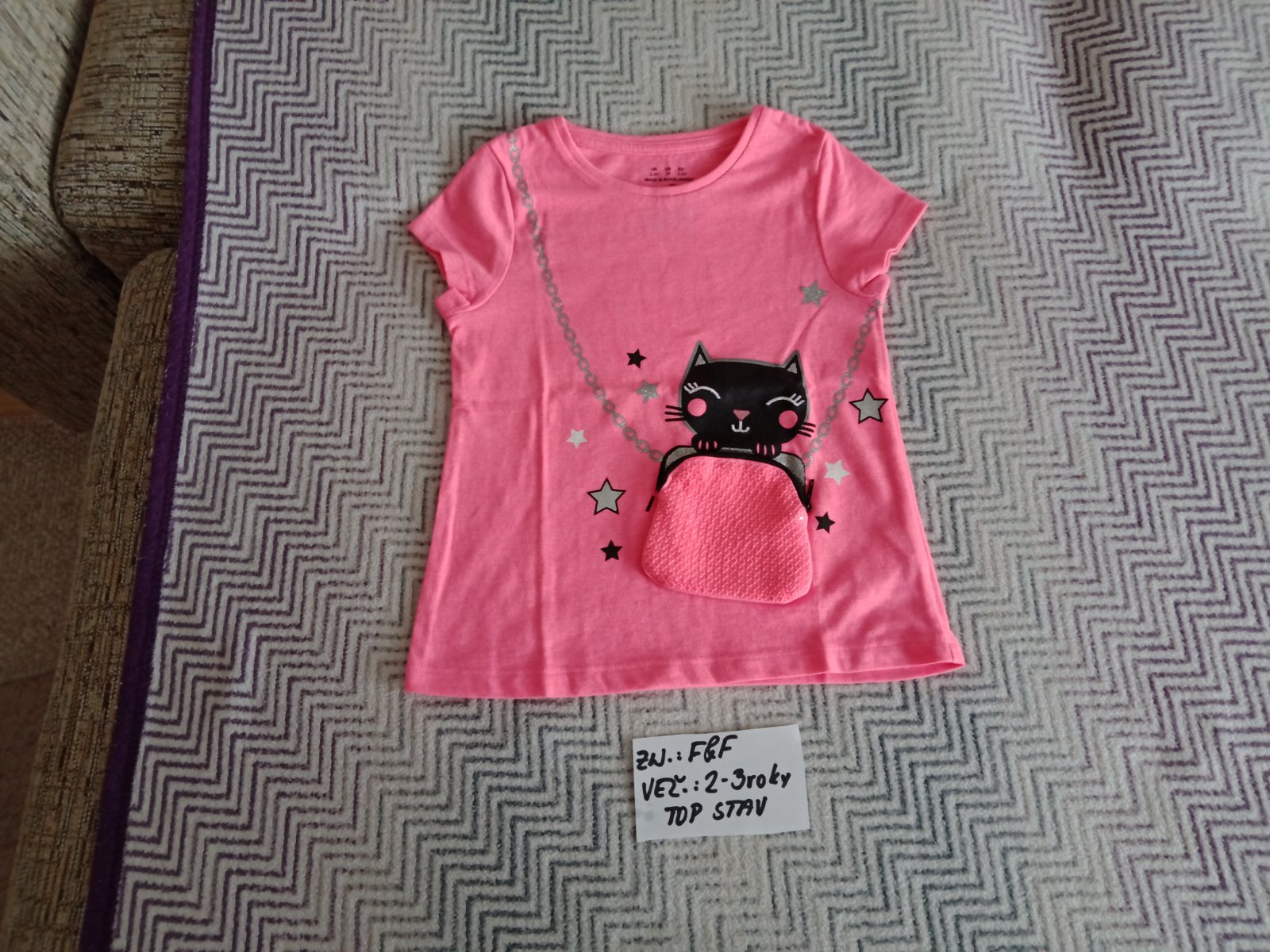 Dievčenské tričko s krátkym rukávom zn.F&F veľ.2-3roky,neonovej farby a s kapsickou,v top stave,cena 3eur.
