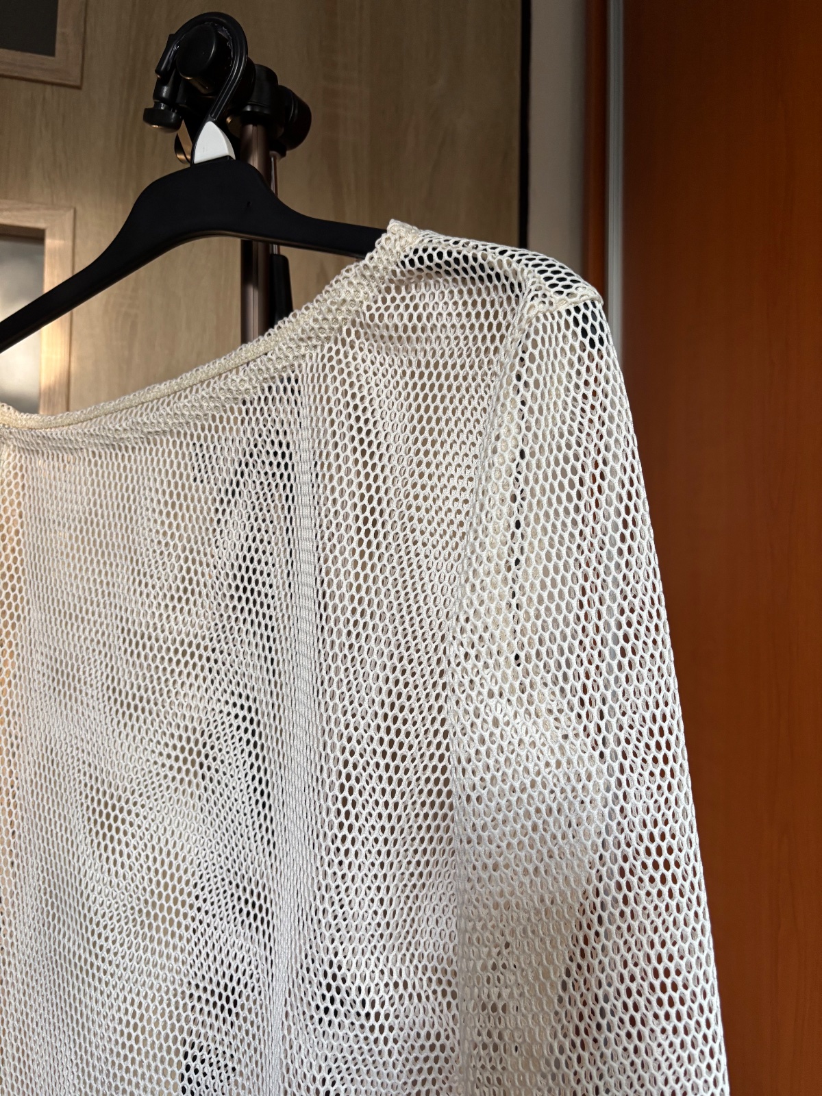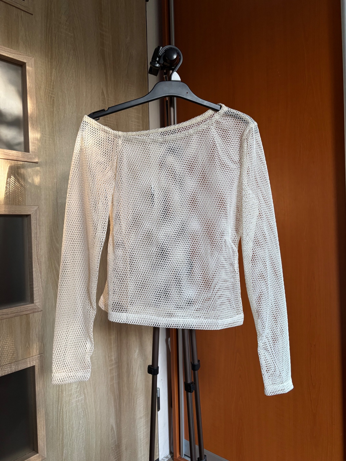 Bielo krémové sieťované svetrové tričko / top s dlhým rukávom, jedno odhalené rameno. Výborný stav, takmer nenosené. Veľkosť S.