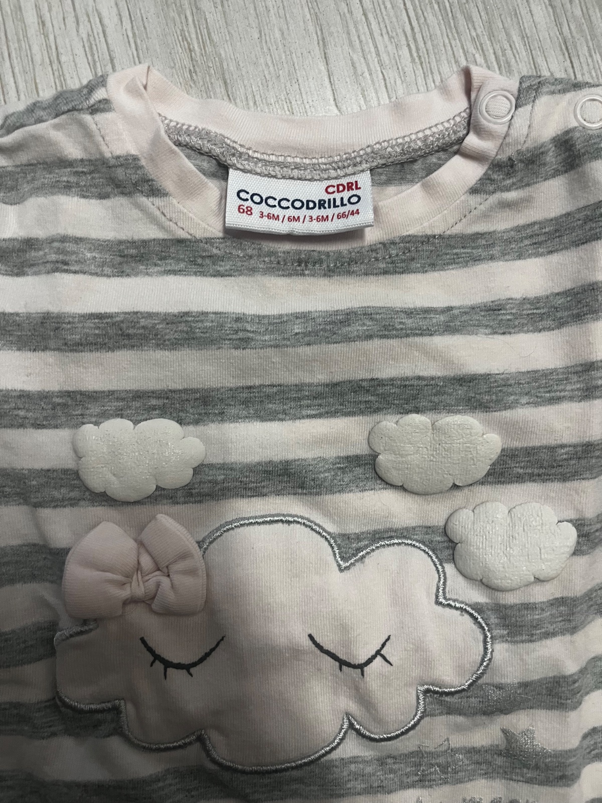 Predám vo výbornom stave ružovo-sivý pásikavý dlhorukavovy top s obrazkom obláčika s maličkou značky Coccodrillo, veľkosť: 68 (3-6 mesiacov)