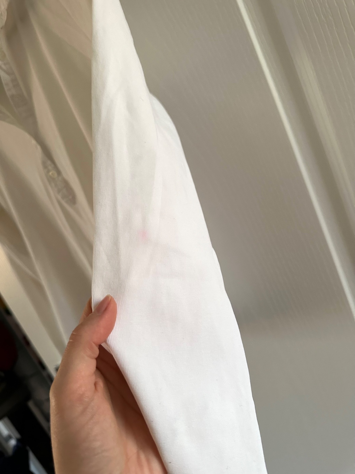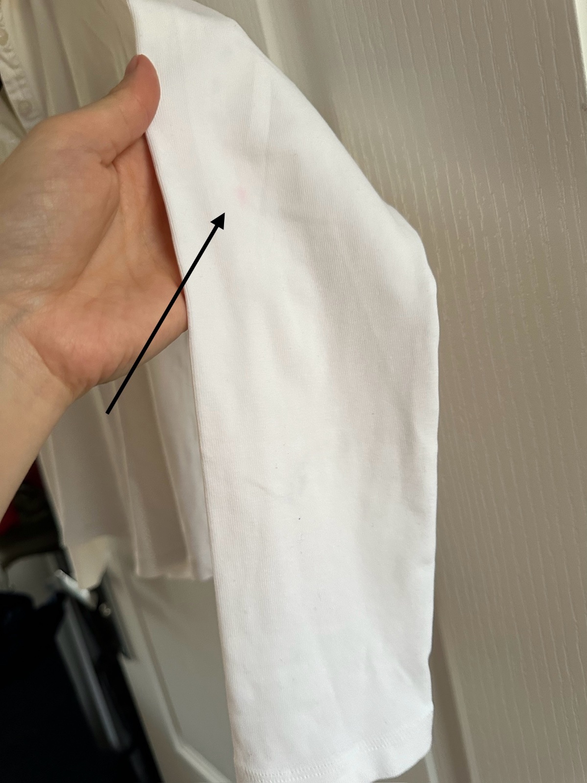 Blúzka je v dobrom stave, materiál je zachovalý, avšak na rukáve má malý, bledoružový fliačik (viditeľný na fotkách, označený šípkou). Pri nosení ho takmer nevidno, ale férovo naň upozorňujem.