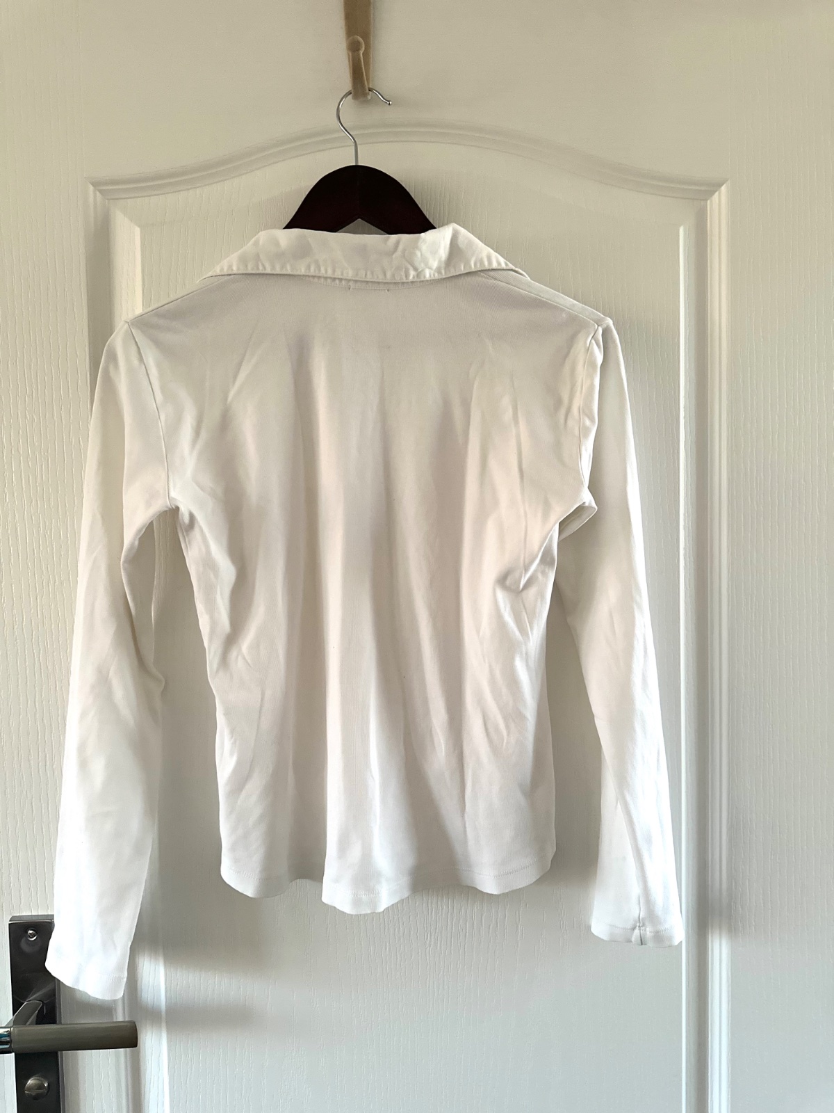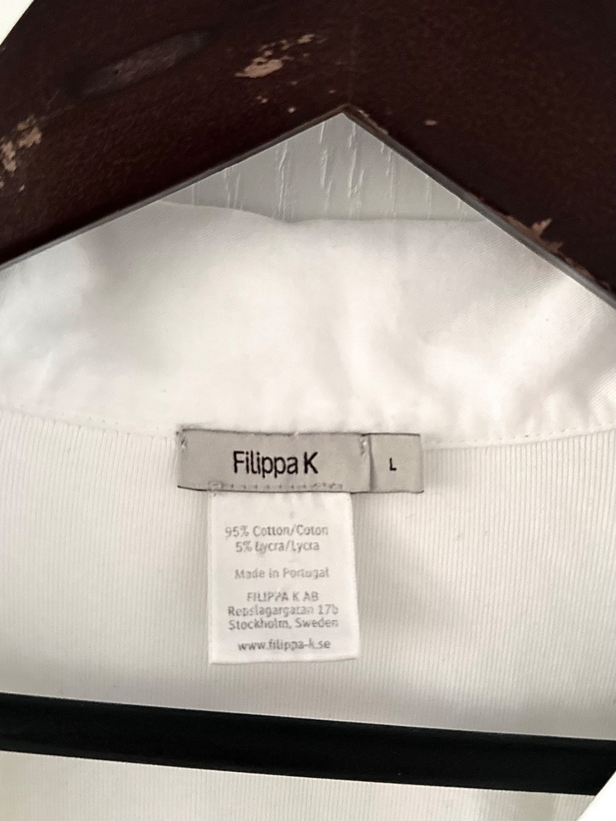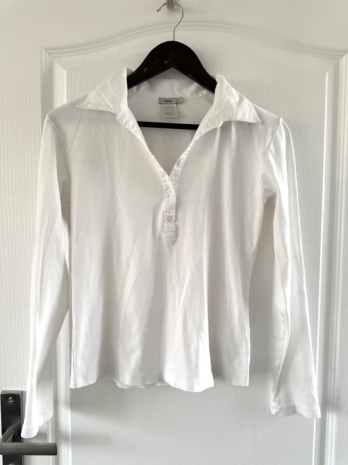 Klasický biely longsleeve prémiovej značky Filippa K. Blúzka je vyrobená z vysokokvalitnej rebrovanej bavlny s prímesou lycry, čo zabezpečuje dokonalé prispôsobenie postave a pohodlie pri nosení. Veľkosť: L (prosím, skontrolujte si rozmery na fotkách), zloženie: 95 % bavlna, 5 % lycra (elastický, rebrovaný materiál). Ide o priliehavý strih s elegantným golierikom a výstrihom typu henley (zapínanie na gombíky).