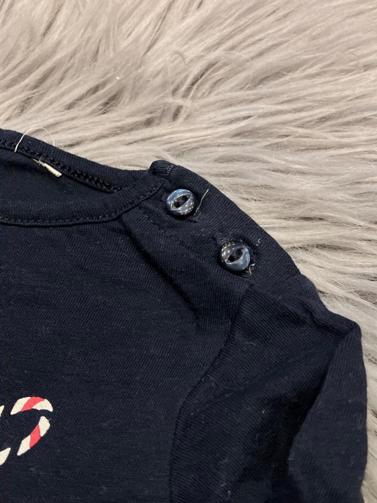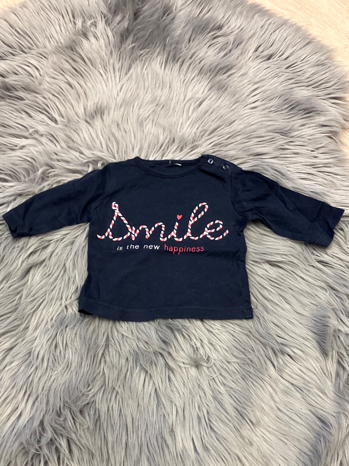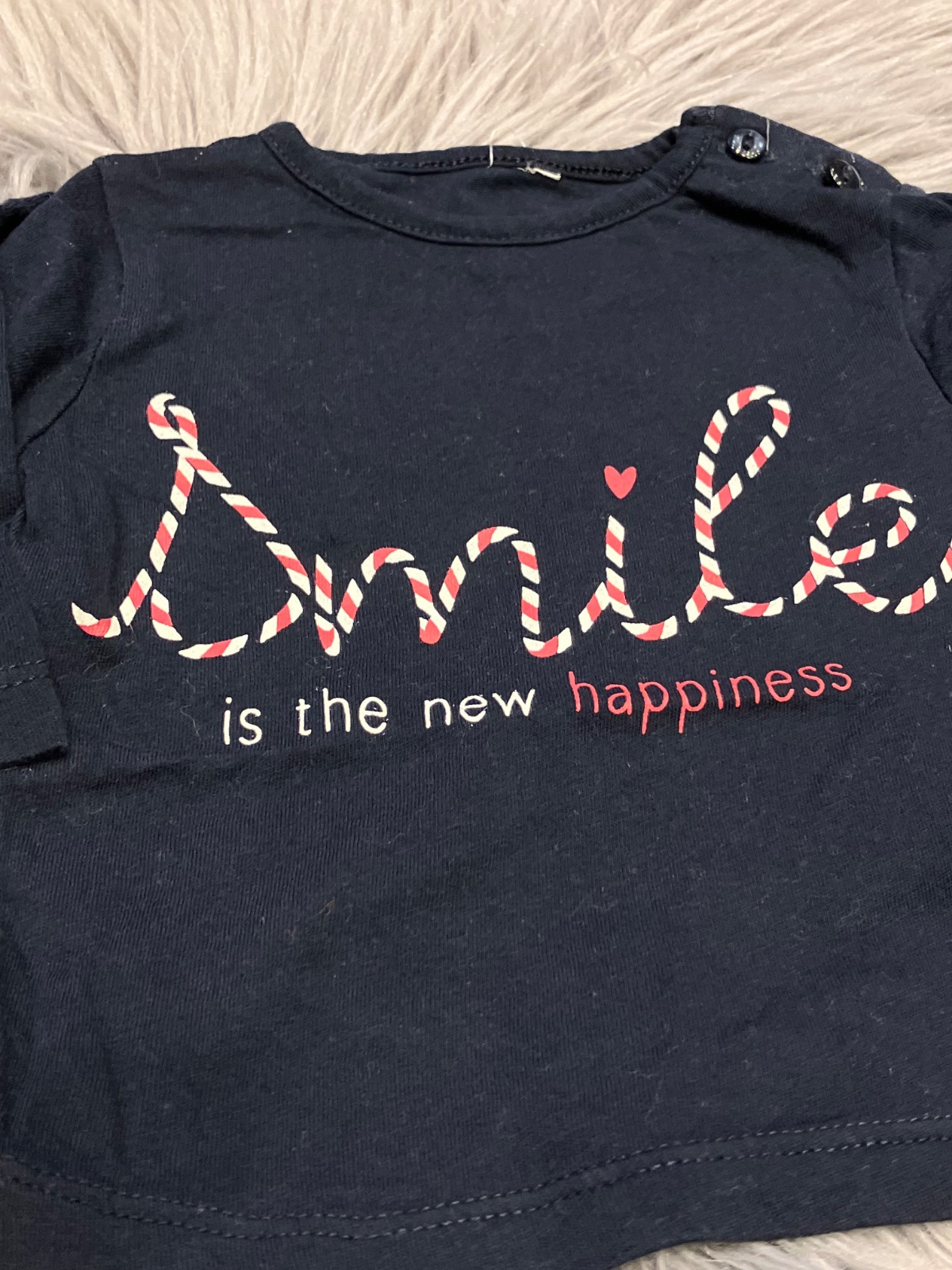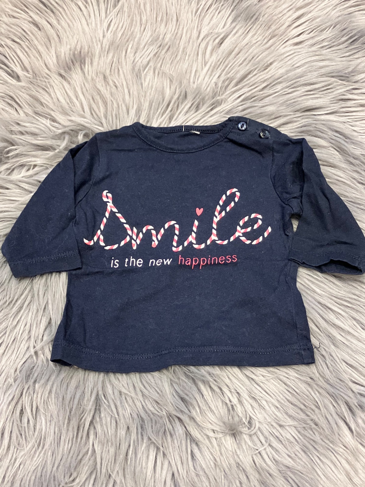 Dievčenské tričko s dlhým rukávom, s nápismi, elastické, zapínanie na ramene na dve gombíky, veľkosť cca 56.