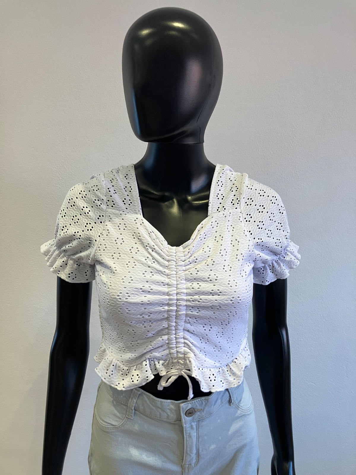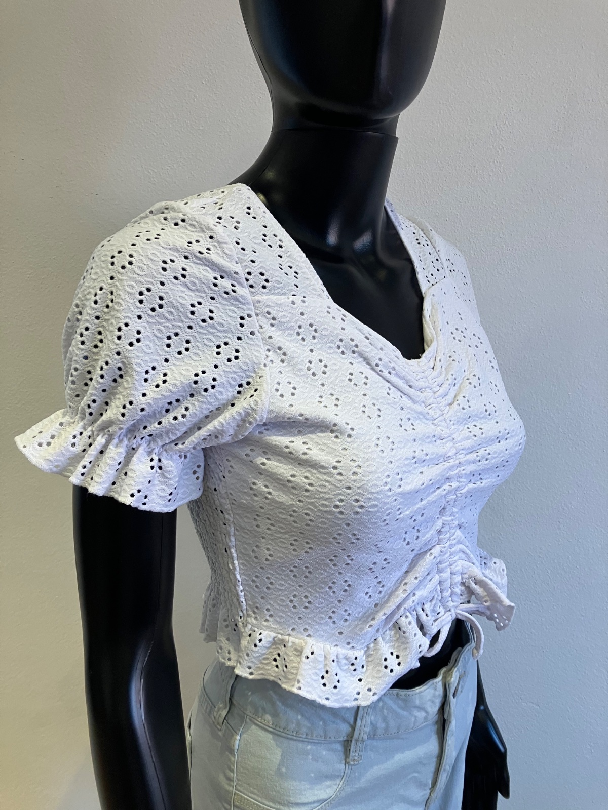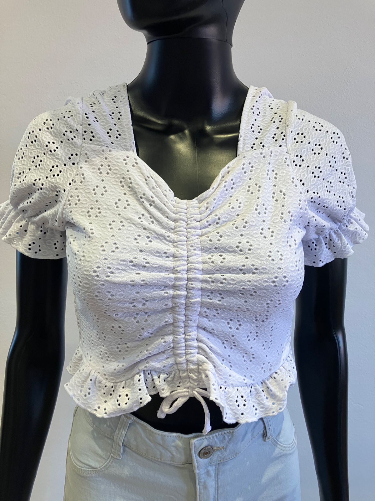 Dievčenské madeirové tričko s krátkym rukávom, so sťahovacou šnúrkou vpredu. krátke, elastické, materiál 96%polyester 4%elastan.