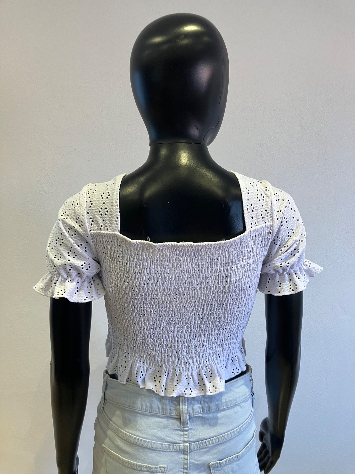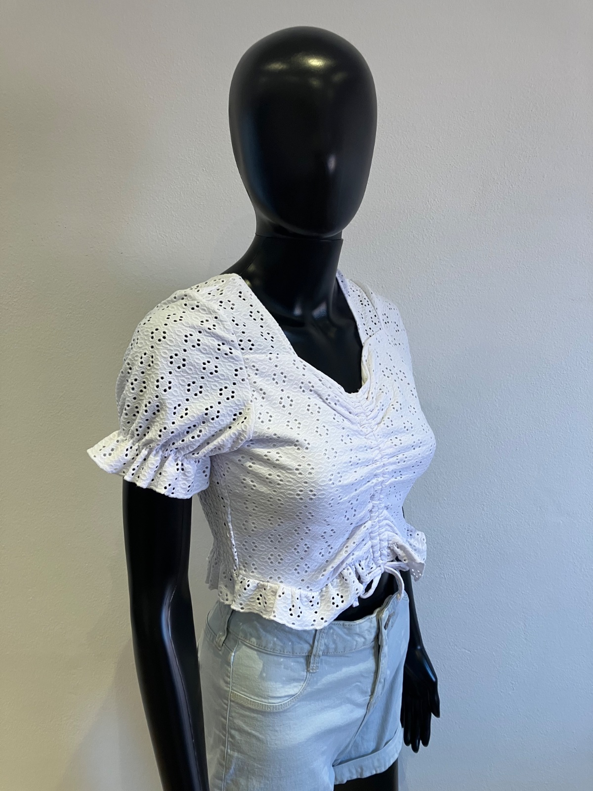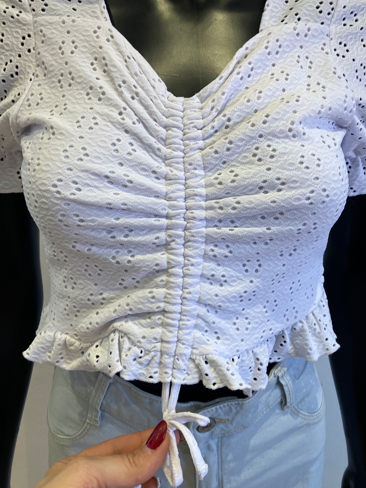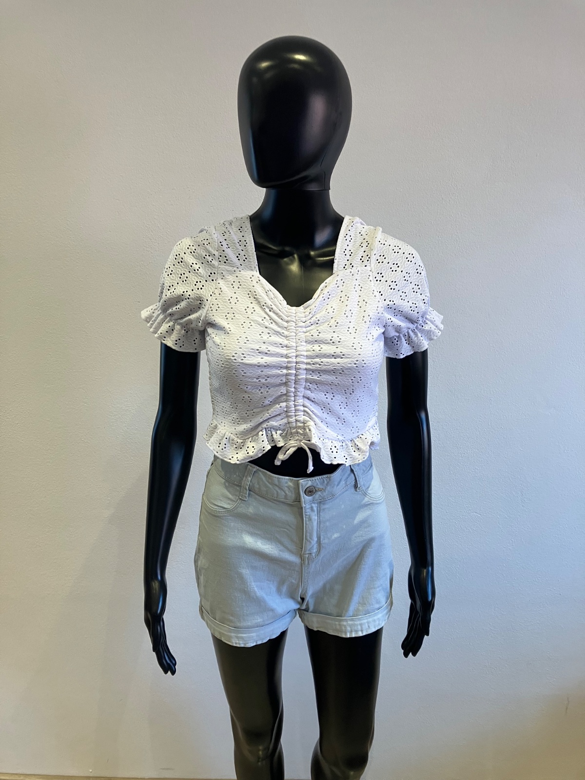 Dievčenské madeirové tričko s krátkym rukávom, so sťahovacou šnúrkou vpredu. krátke, elastické, materiál 96%polyester 4%elastan.