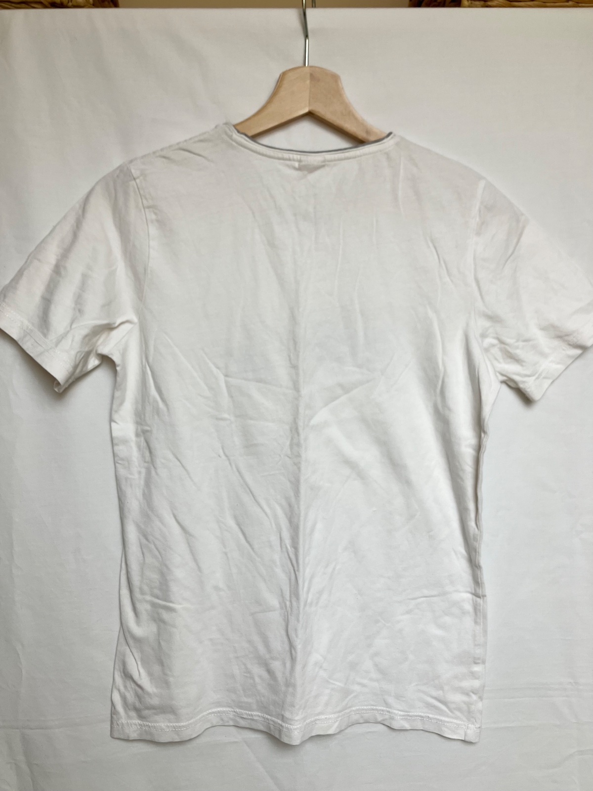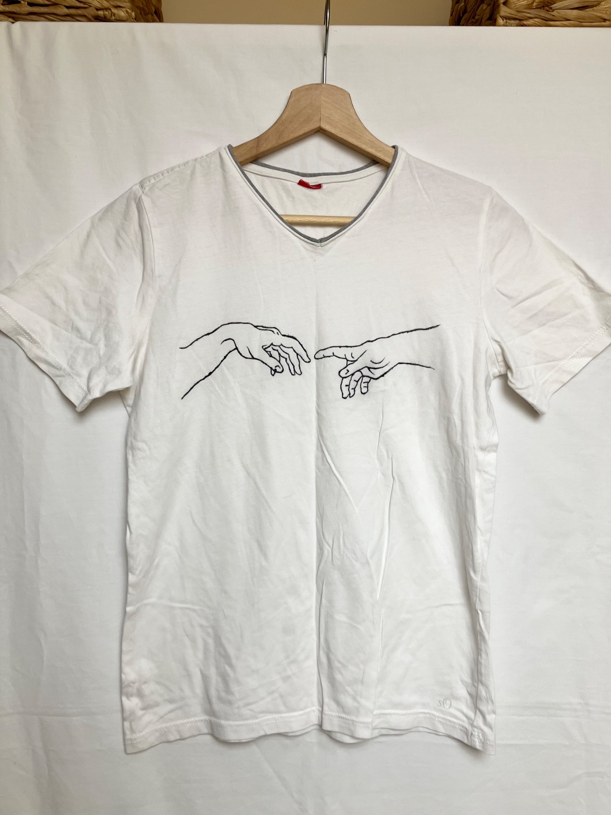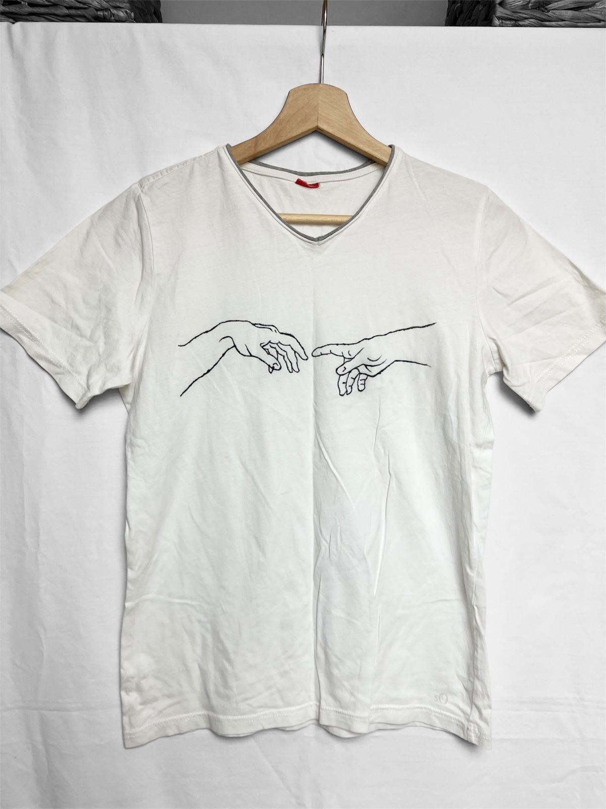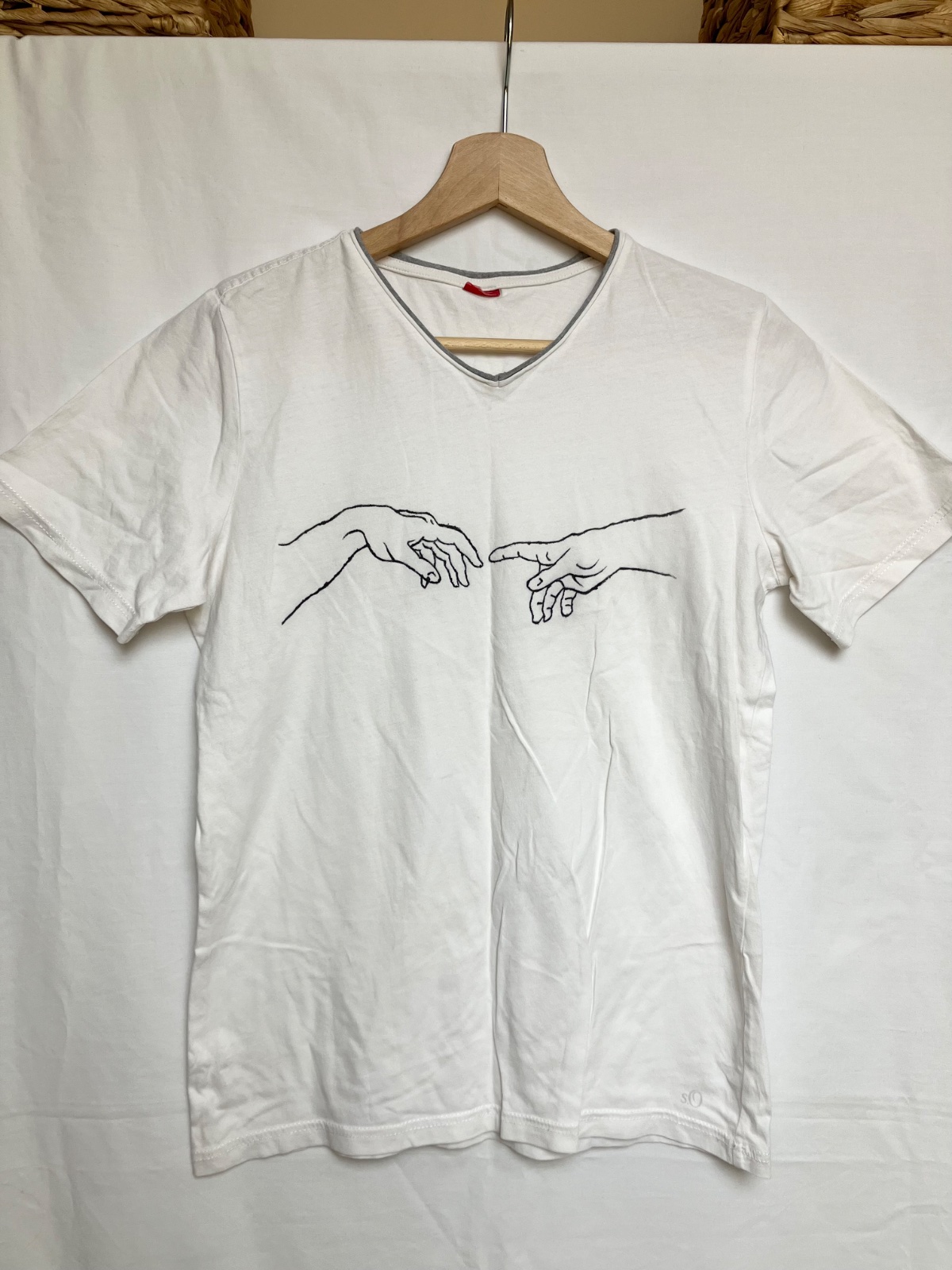 Jedinečný ručne maľovaný kúsok, ktorý spája klasické umenie a moderný streetwear. Toto biele unisex tričko vzniklo upcyklovaním originálu značky s.Oliver a nesie minimalistický motív ikonického obrazu Stvorenie Adama od Michelangela – jemná line-art kresba rúk, ktorá okamžite pritiahne pozornosť.