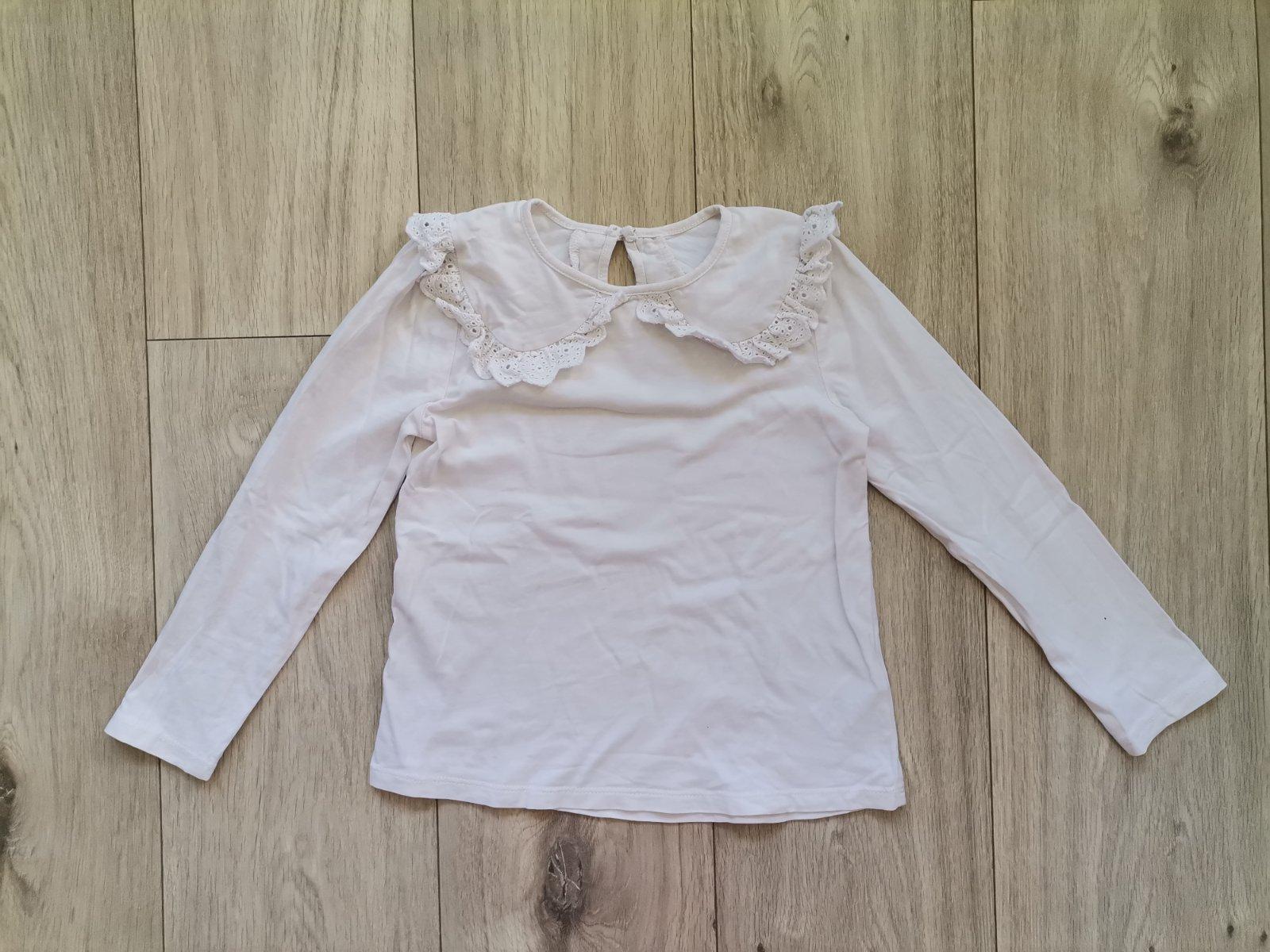 Perfektné bavlnené tričko s krajkou a vreckom! Veľk. 122, 128, 134. Farba bielo-béžová.