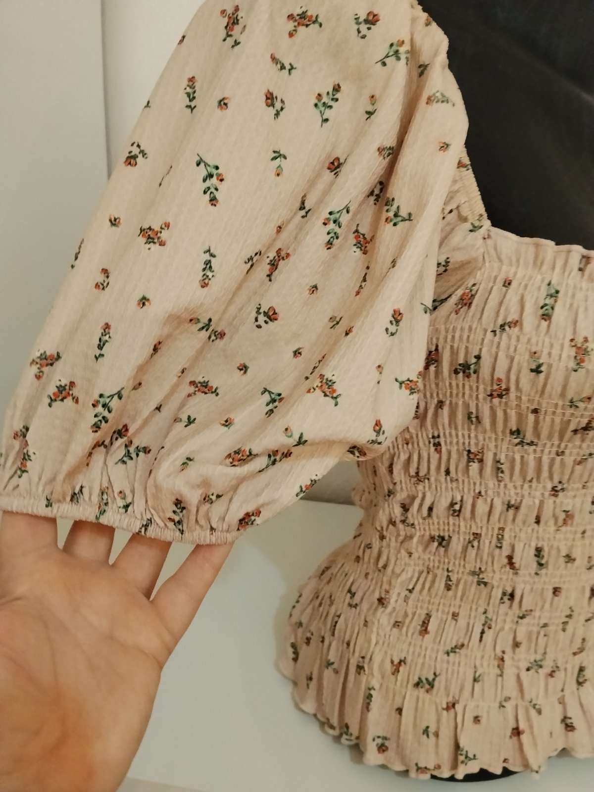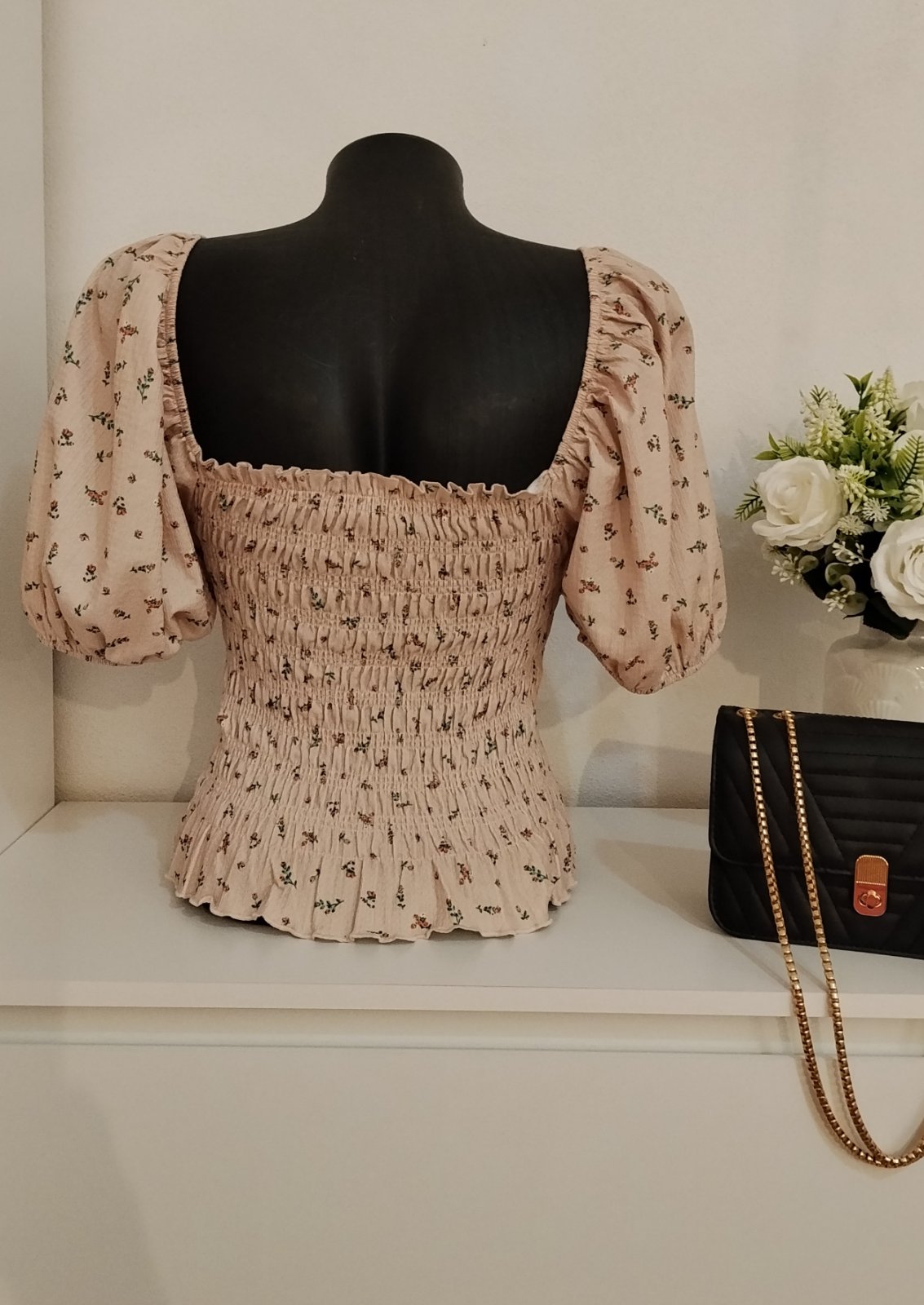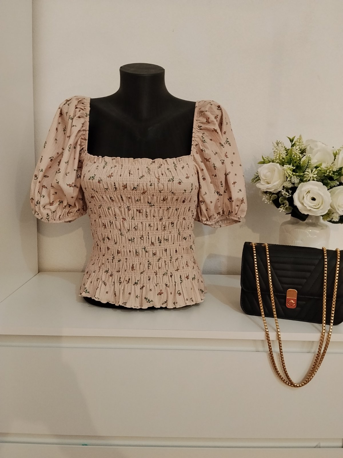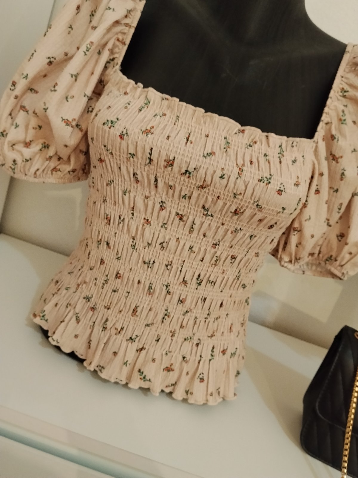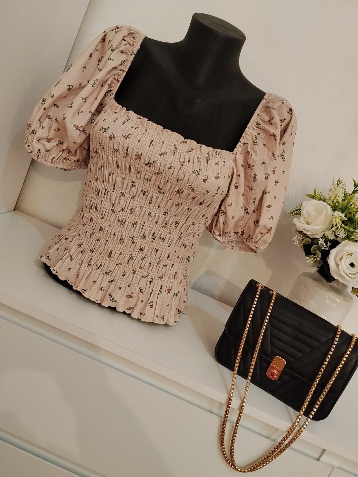 Top má elastické riasenie po celej dĺžke, ktoré sa krásne prispôsobí postave a zvýrazní pás. Výrazné puff rukávy dodávajú outfitu ženskosť a trendy nádych. Štvorcový výstrih pôsobí elegantne a veľmi lichotivo 💫