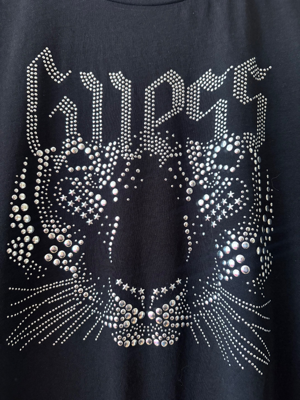 Krásne sýtočierne padavé tričko kvalita od Guess,strieborné aplikácie v podobe tigra..top stav.PC 70€.