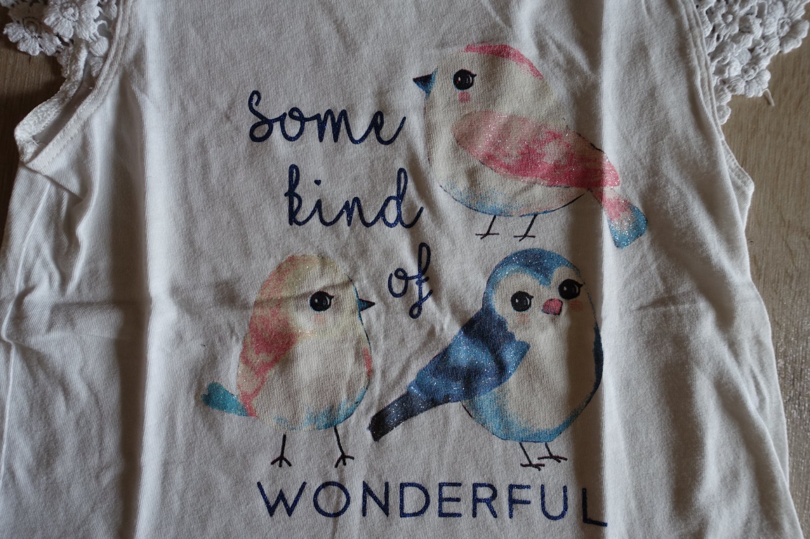 Predám krásne tričenko s trblietajúcimi sa vtáčikmi a čipkovanými rukávikmi vo veľkosti 110/116. Rukáviky sú bavlnené, čipkovanie neožiera. Bolo nosené na striedačku aj s inými tričkami, ale je v peknom nosenom stave. Nemá fľaky, ani dierky. Trošička sa mi zdá pri naklonení, že sa chce začať tvoriť chĺpoček z prania, ale ešte nie je žmolkavé. Je veľmi príjemné na nosenie, ak len po doma určite ešte poslúži. Dĺžka predného dielu je 43 cm, zadný diel je ešte o 1 cm predĺžený, šírka 32 cm. (G)