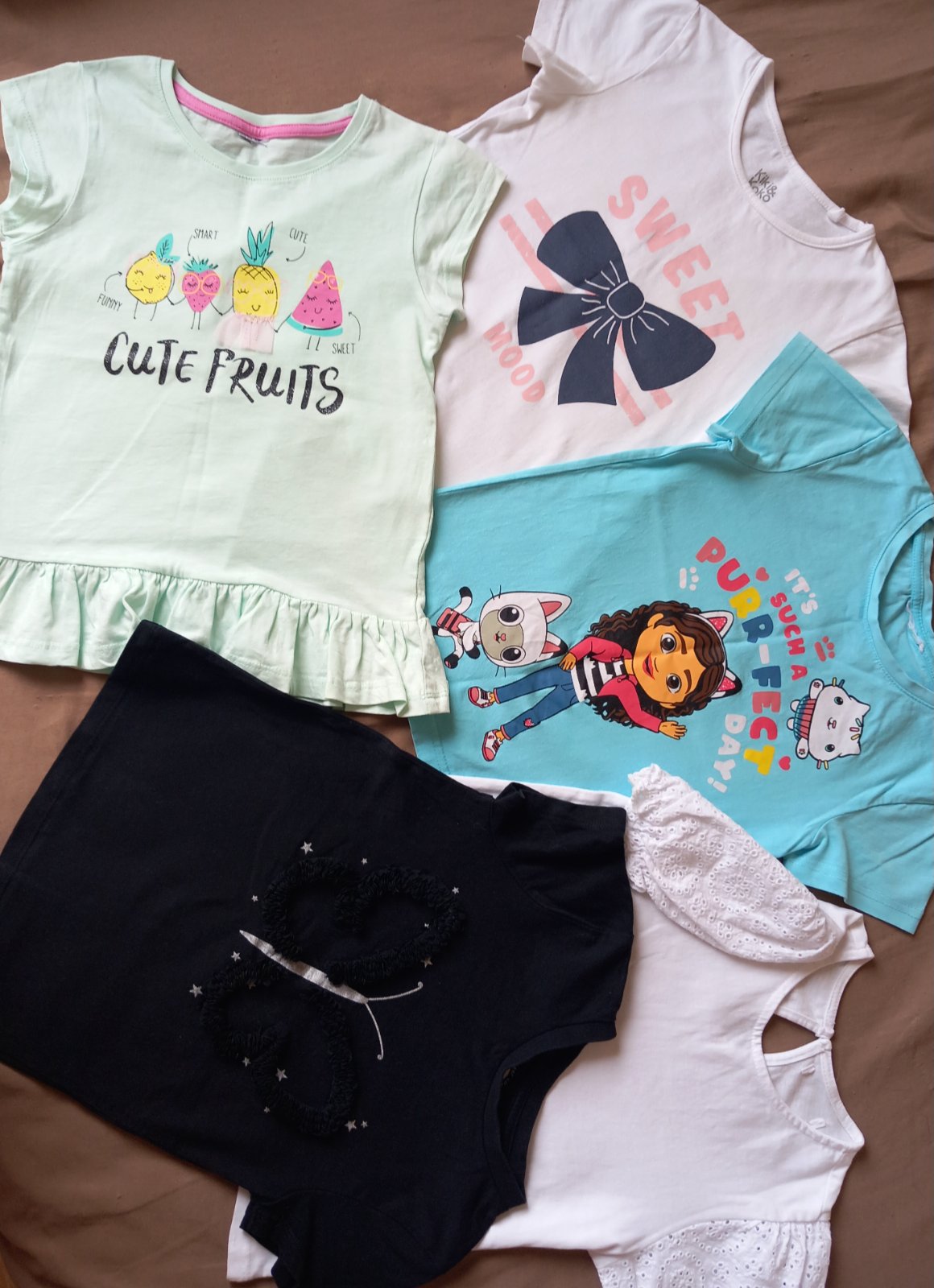 Obe tričká sú pre 5-6 ročné dievčatko. Rôznofarebné modro-zeleno-žlto-ružové je zn. Marks Spencer, celková dĺžka je 40cm. Dvojfarebné tričko je zn. Cherokee, celková dĺžka 45 cm.