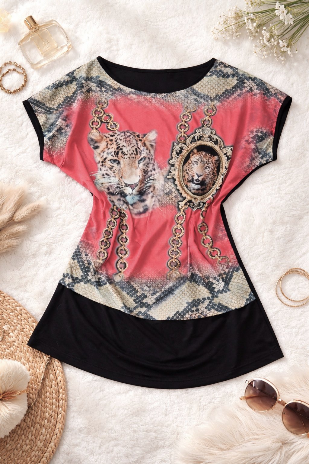 Štýlová a originálna tunika s výraznou potlačou leoparda a zlatých detailov. Kombinácia koralovej červenej, čiernej a zvieracieho vzoru pôsobí luxusne a trendy.