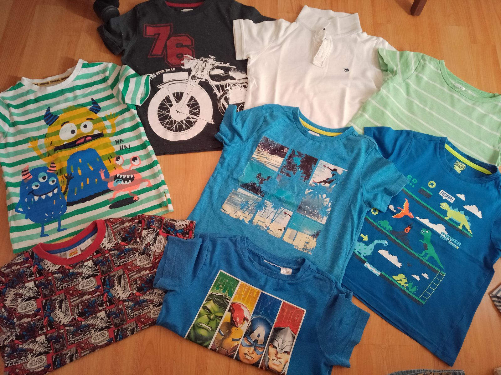 Sada 6ks chlapcenskych triciek s kratkym rukavom, znacka F&F, visacka velkost 4-5 rokov. Zelene a zvieratkove 100% bavlna. Kriklavo oranzova 60% bavlna.Biele s napisom,modro-cervene,bielo-modro-bie...