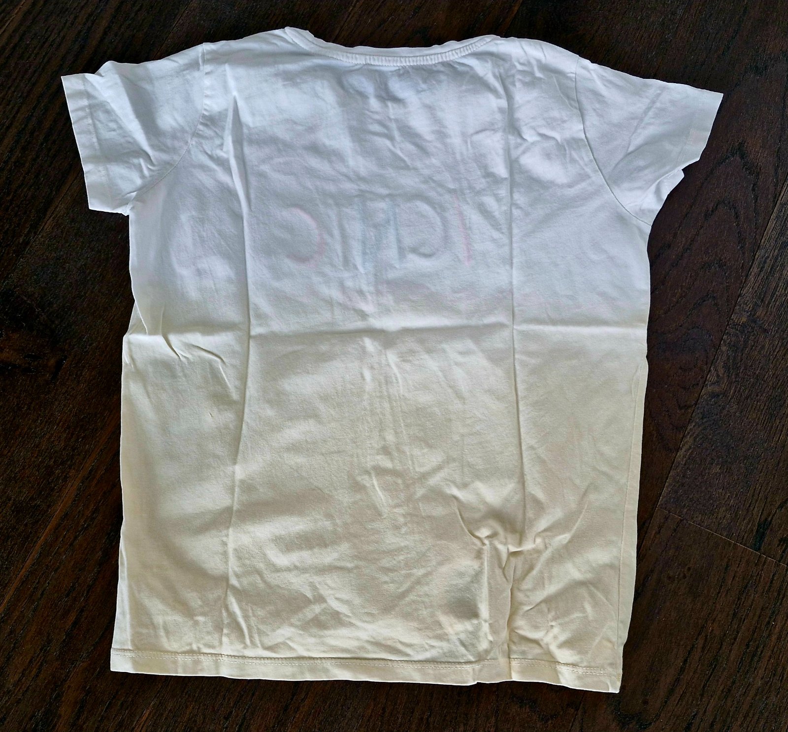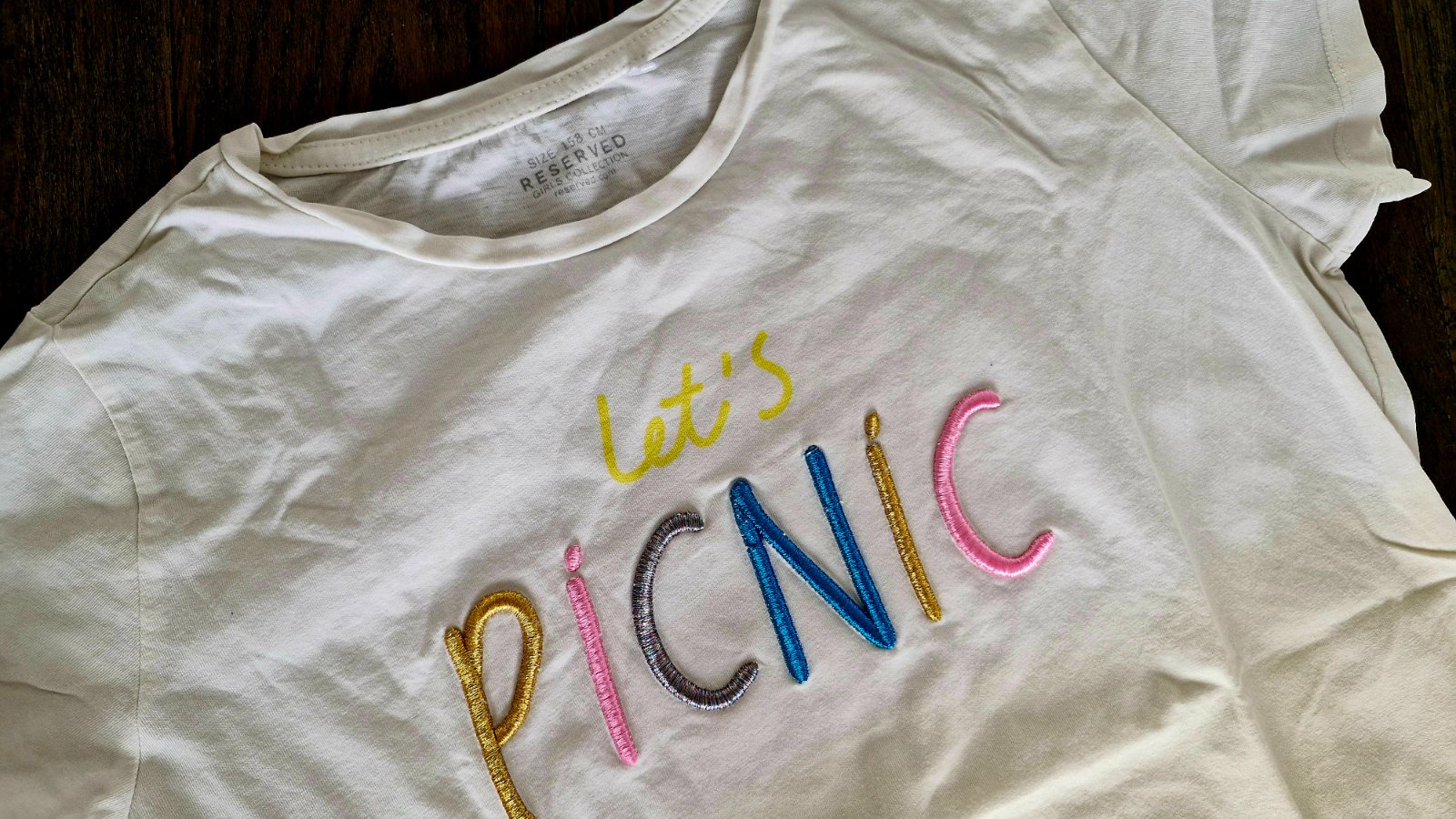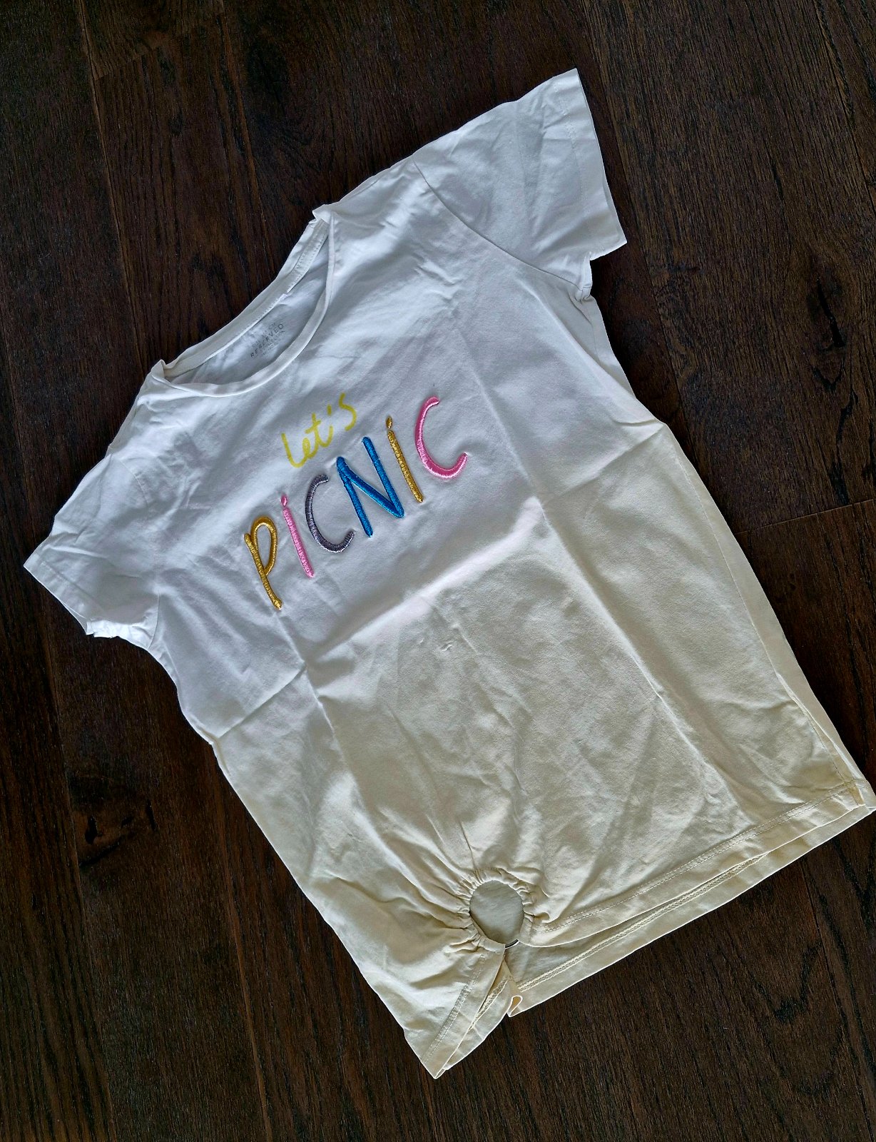 Nadherne svetlozlte tricko s prechodom do bielej s vysivanym napisom Let's PICNIC,vyborny stav,v.158,cena LEN 5eur je fixna,odporucam