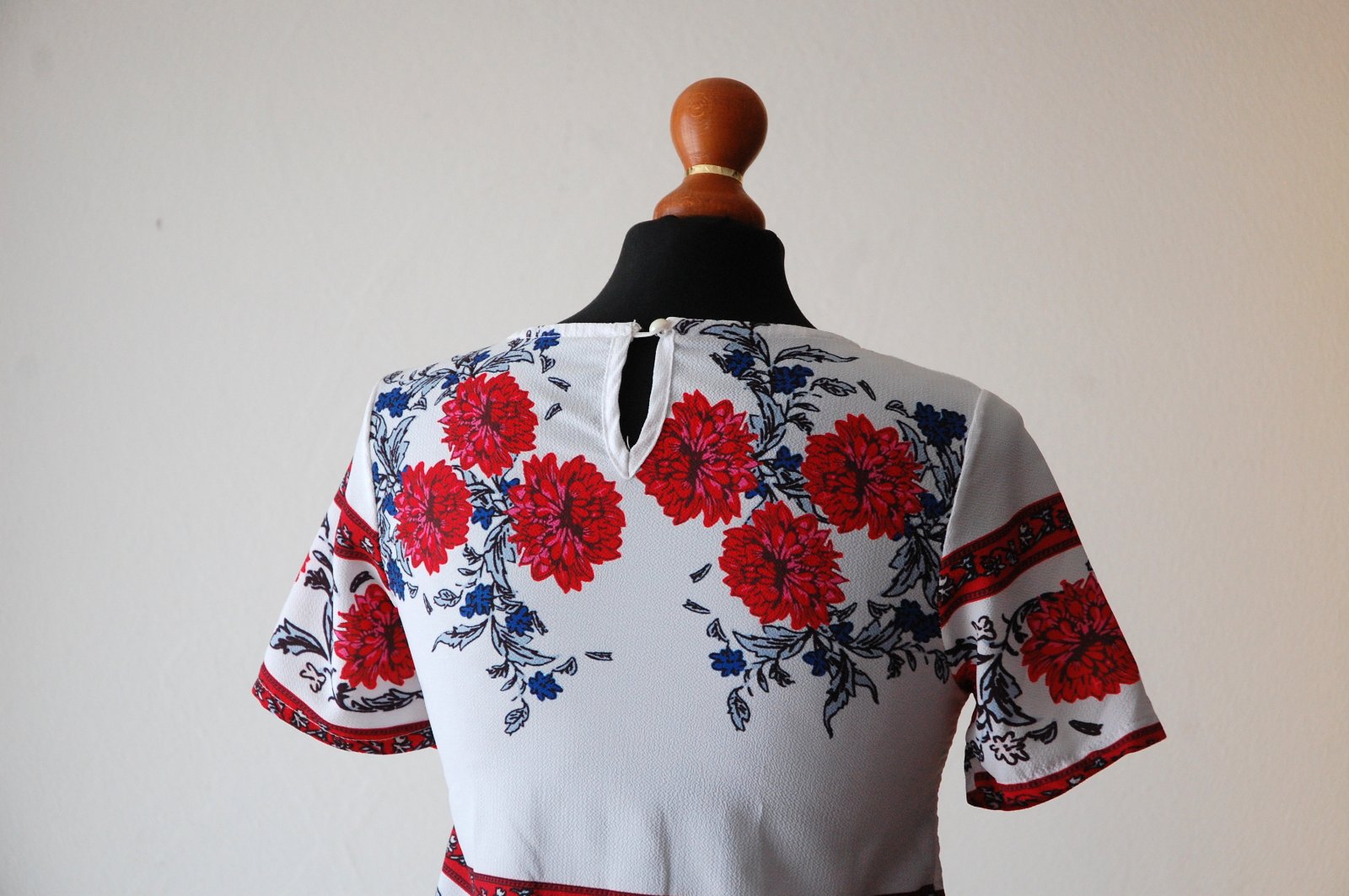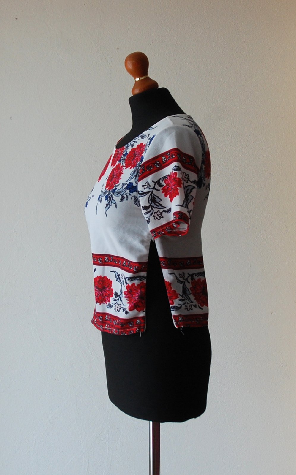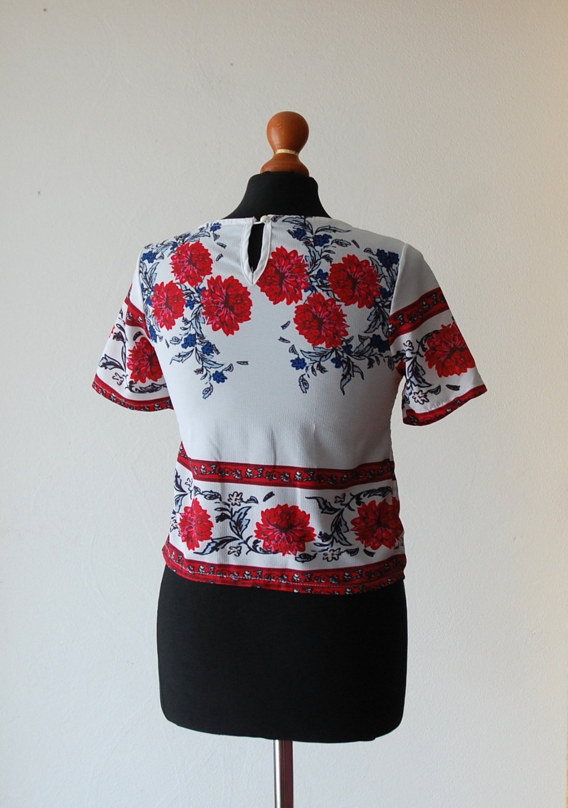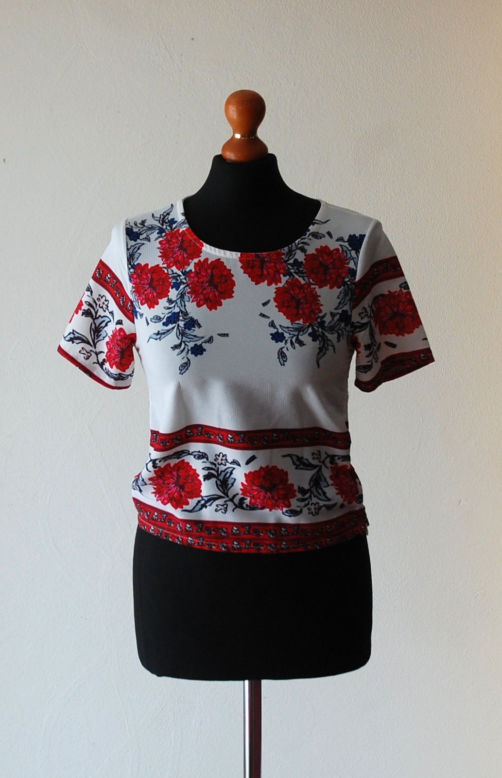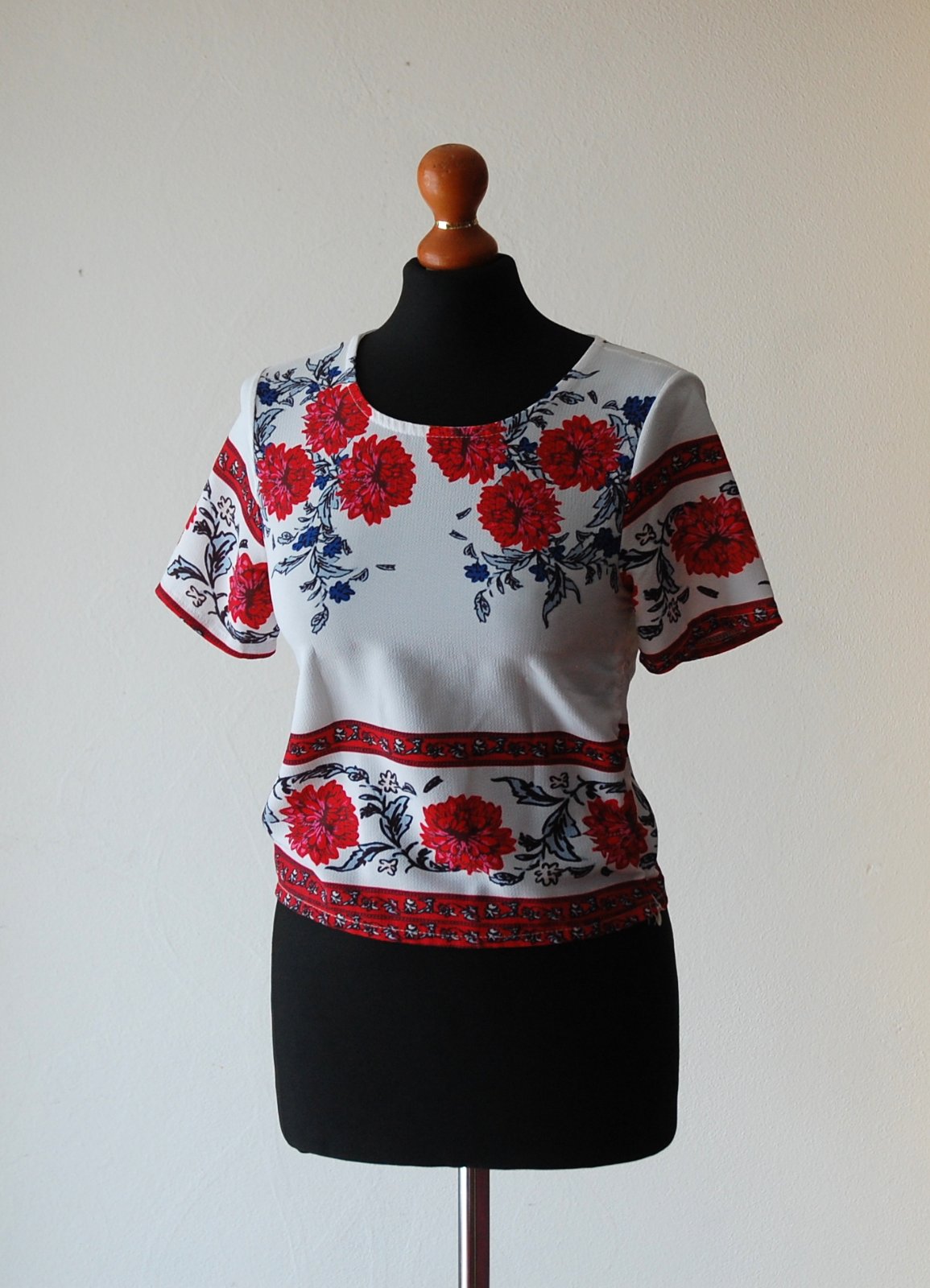 Predám tento krásny dámsky top s krátkym rukávom, ktorý okamžite rozžiari váš letný outfit. Top má biely podklad s výraznou červenou kvetinovou potlačou a jemnými tmavomodrými detailmi. Strih je moderný, mierne kratší (crop), ideálny k vysokým džínsom, šortkám alebo sukni. Okrúhly výstrih, ozdobný folklórny lem na rukávoch a spodnej časti.