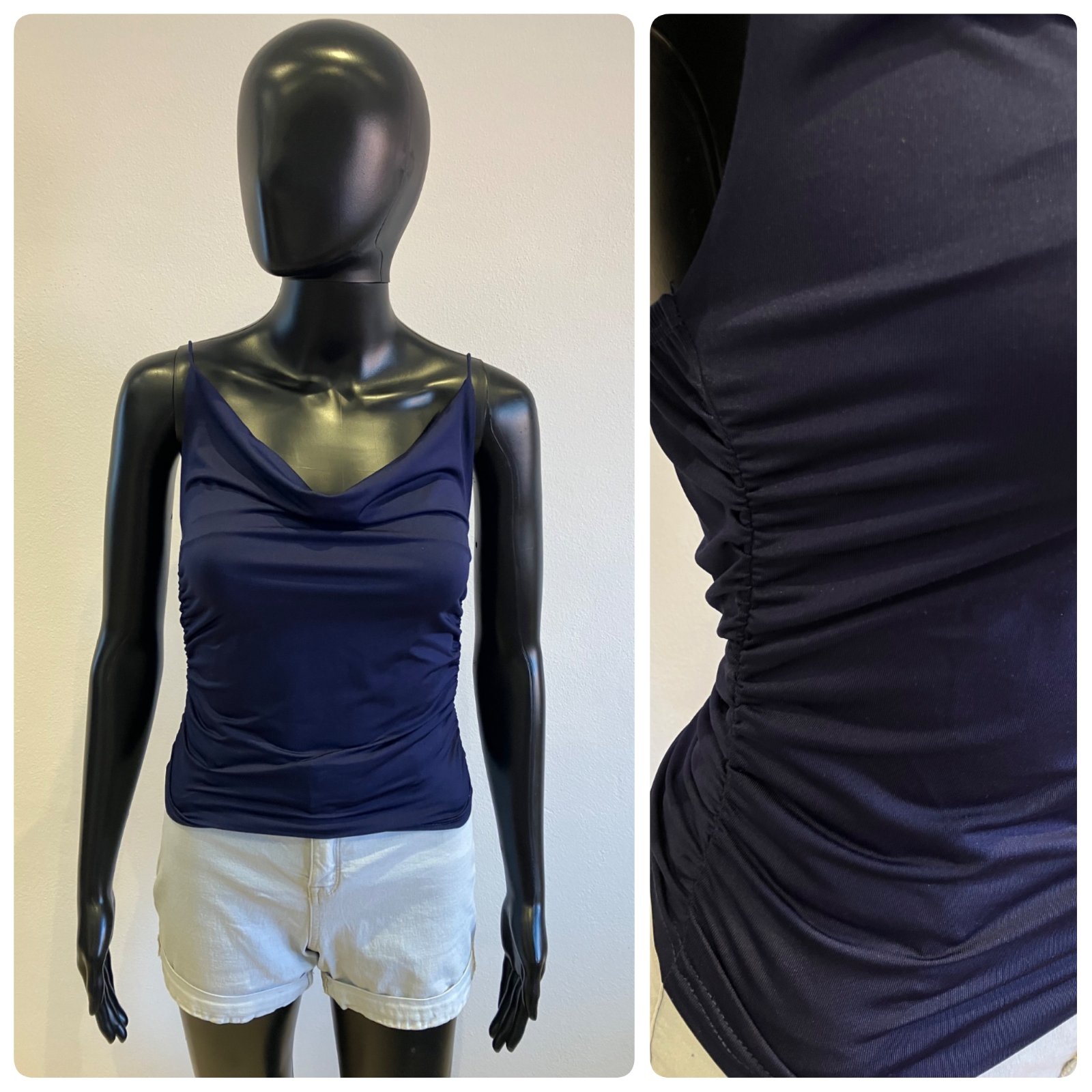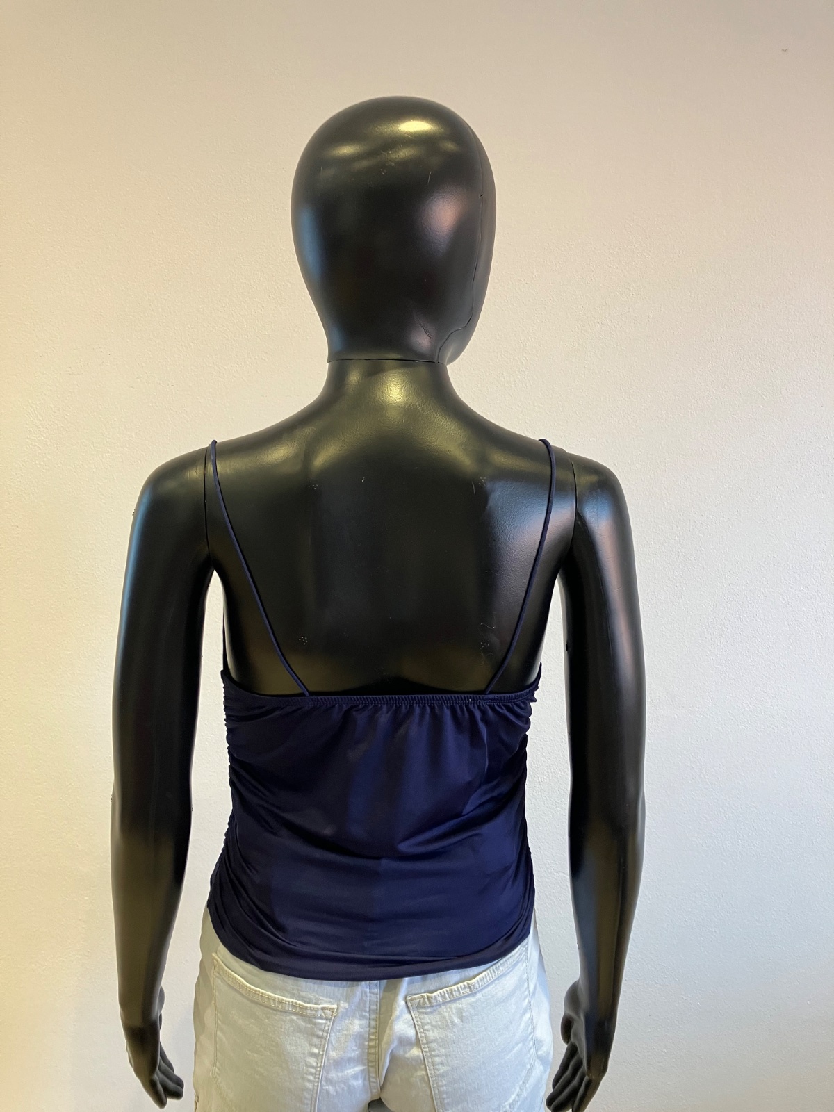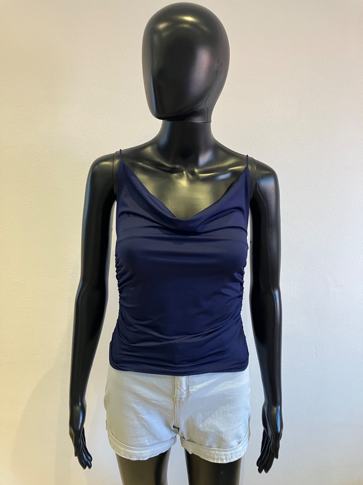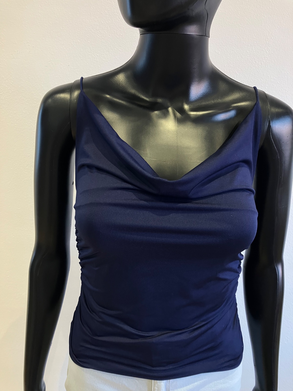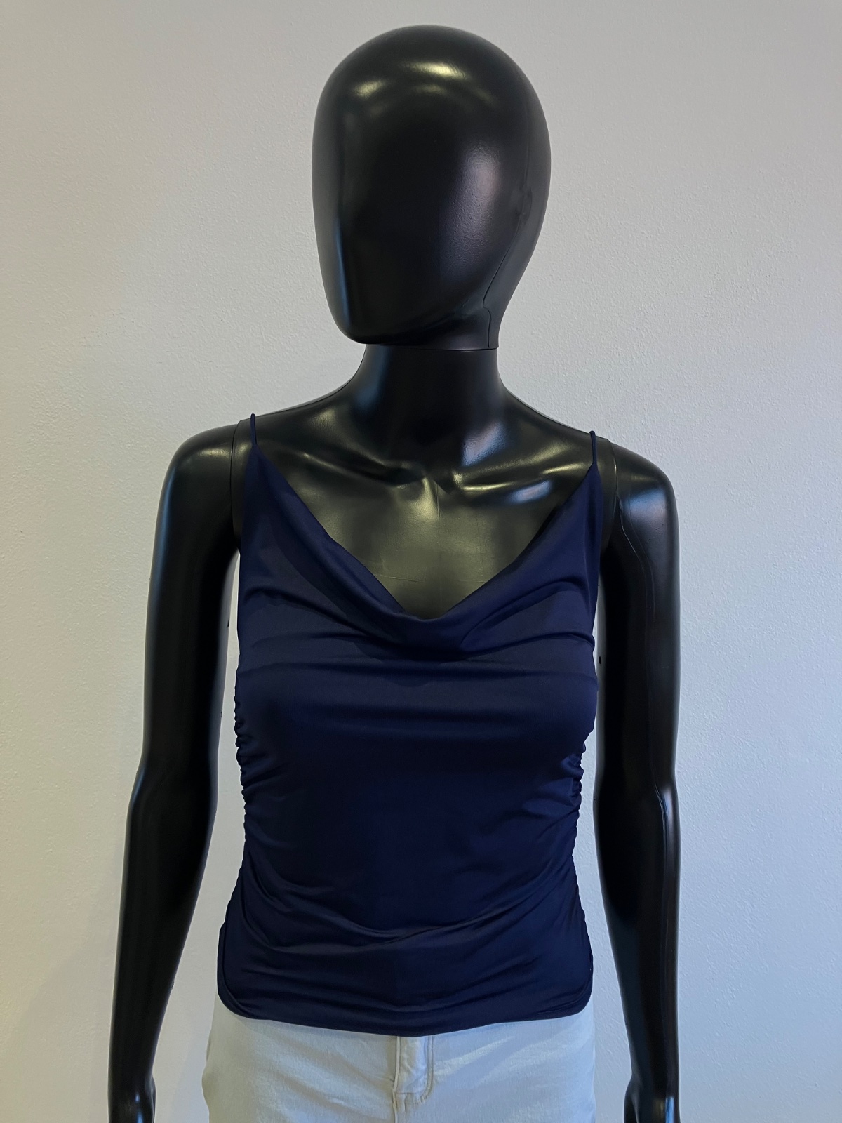 Dámsky tmavomodrý top na tenké ramienka, nazberkaný na bokoch, elastický, materiál 95%polyester 5%elastan.