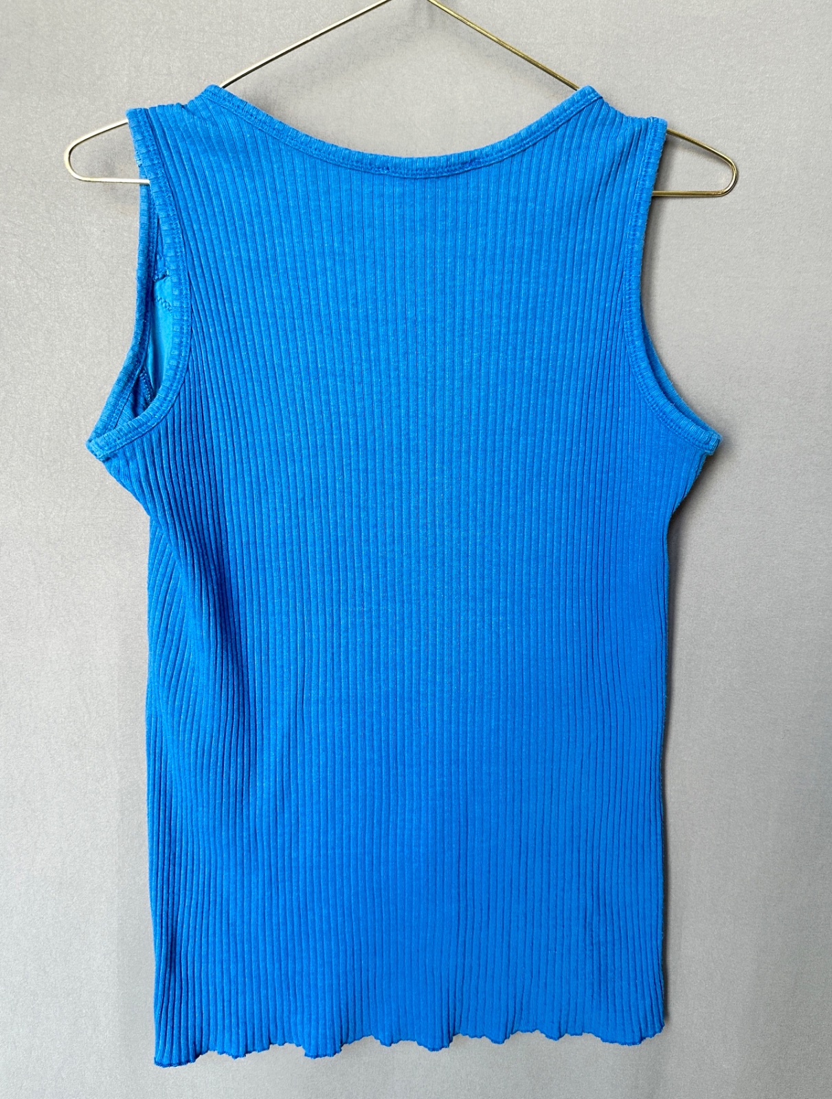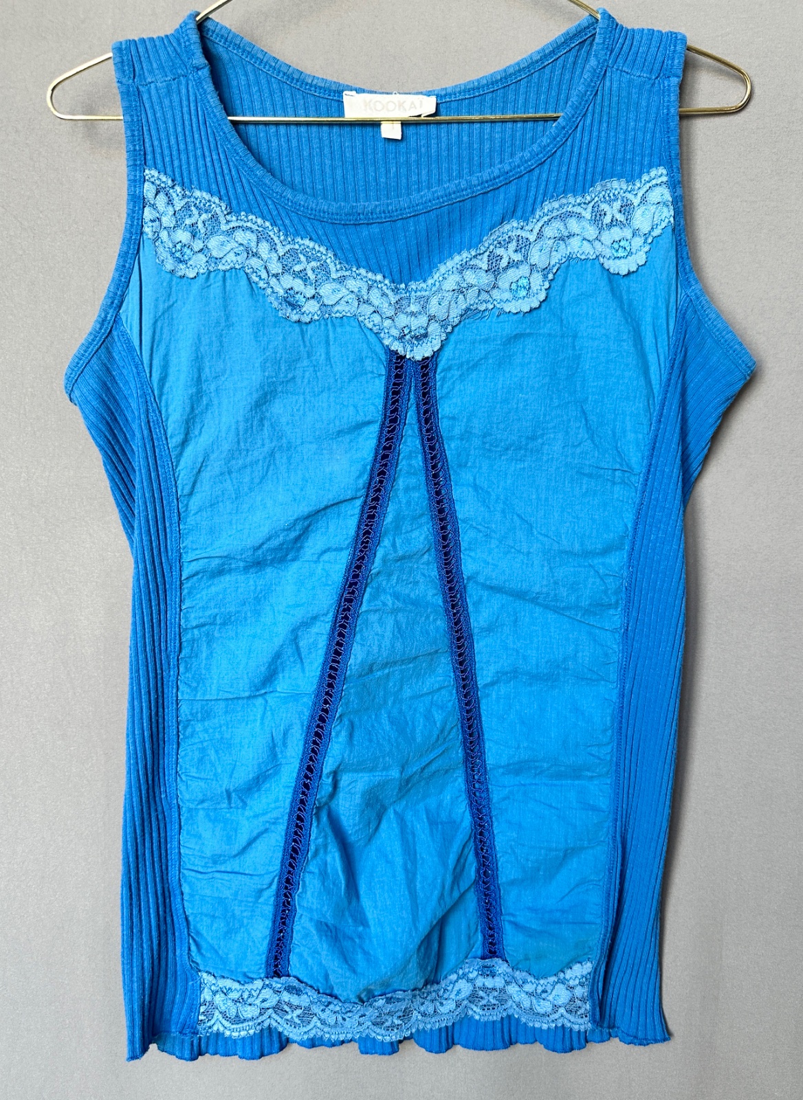 Top na leto v žiarivej modrej farbe z hebkého vrúbkovaného úpletu a vzdušnej bavlnenej látky s čipkou na prednom diele. Vo veľmi peknom stave, bez poškodení.