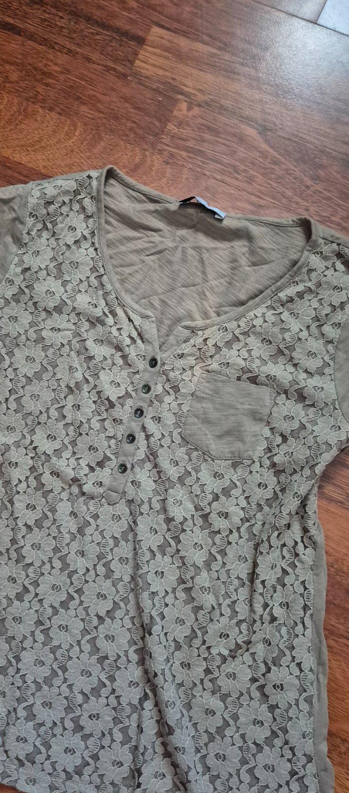 Mäkučké tričko s čipkou, na prednej strane, zaujímavá šedo zeleno-hnedá farba, top stav, raz oblečené.