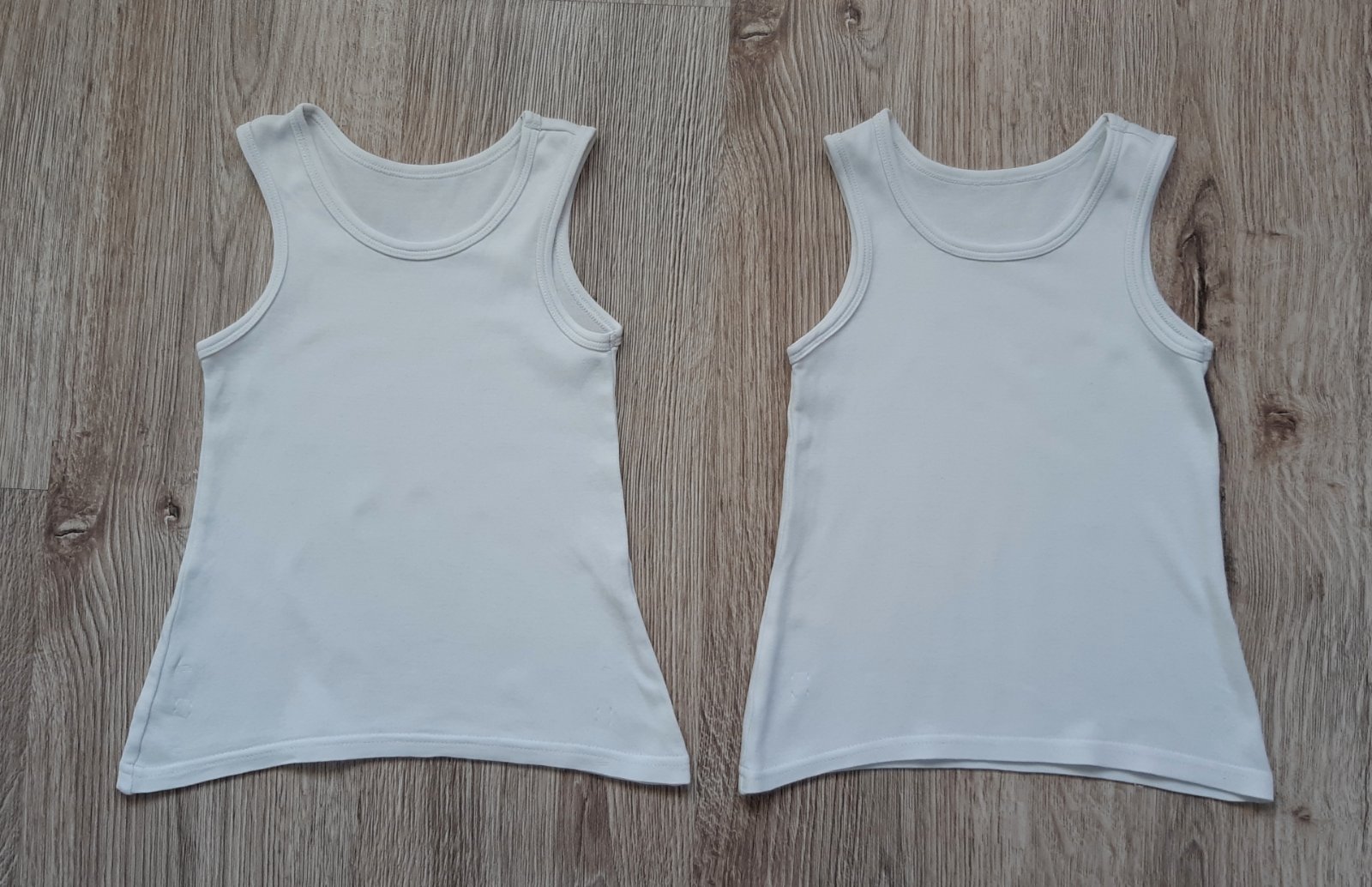 Balíček obsahuje 2 ks bavlnených tielok vo veľmi dobrom nosenom stave (bez dierok, fliačikov a žmolkov; sem-tam trčiaca nitka). Značka: neznáma (odstrihnuté vnútorné štítky); veľkosť: 110 (4 - 5 rokov). Celková dĺžka: 38 cm (merané od pleca).