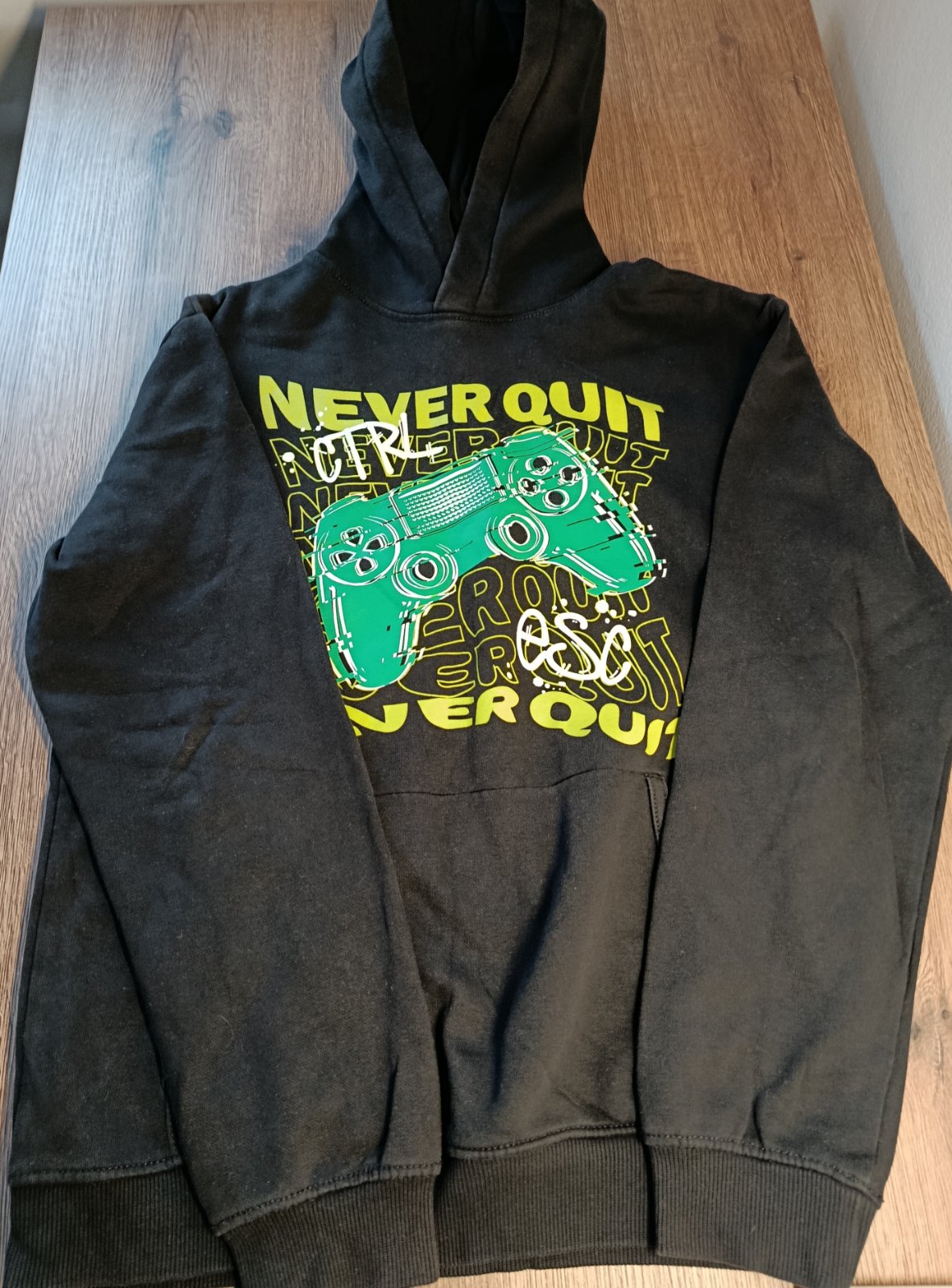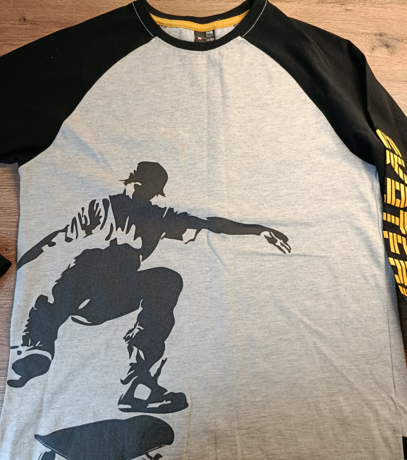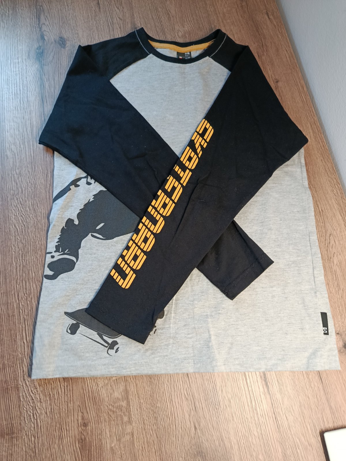 Pekné tričko s dlhým rukávom v.146/152. Farba sivá, s čierno-žltým nápisom. 100% bavlna. Stav ako na fotkách. Cena: 2.50e -pozrite aj ostatné moje inzeráty, možno si niečo vyberiete, ďakujem