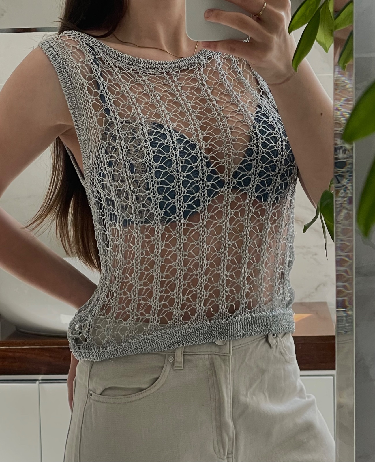 Štýlový sieťovaný top ZARA v strieborno-sivej farbe, ideálny na vrstvenie. Jemný mesh/pletený efekt vytvára moderný a zároveň sexy look – perfektný na leto, festivaly, večerné outfity alebo ako statement kúsok cez podprsenku, bandeau či tielko.