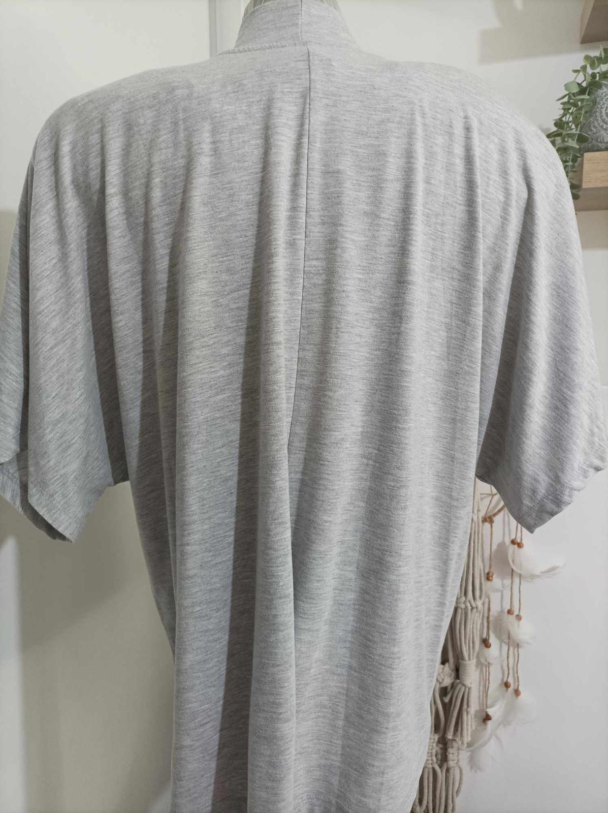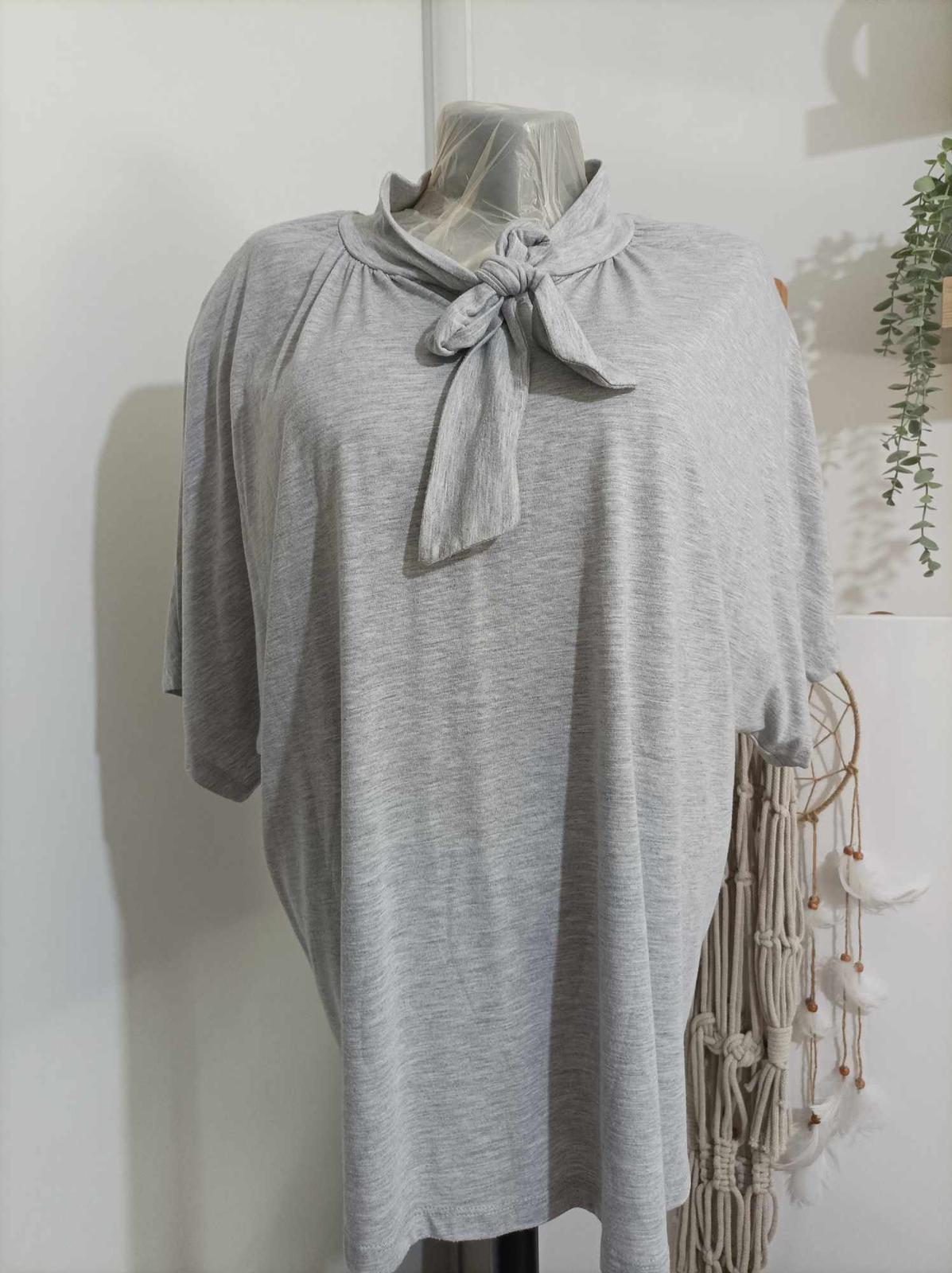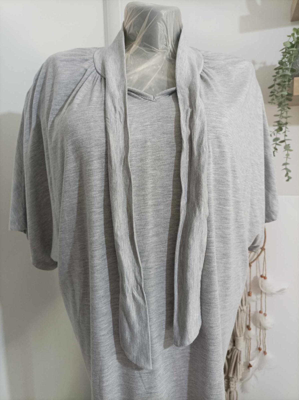 Sivé bussiness tričko, skvele vyzera pod ciernym sakom a slim nohaviciam. na krku je viazanka, neodnímateľna. Je to trickovina, velkost je pisana 48/50. Oblecené 2 krát.