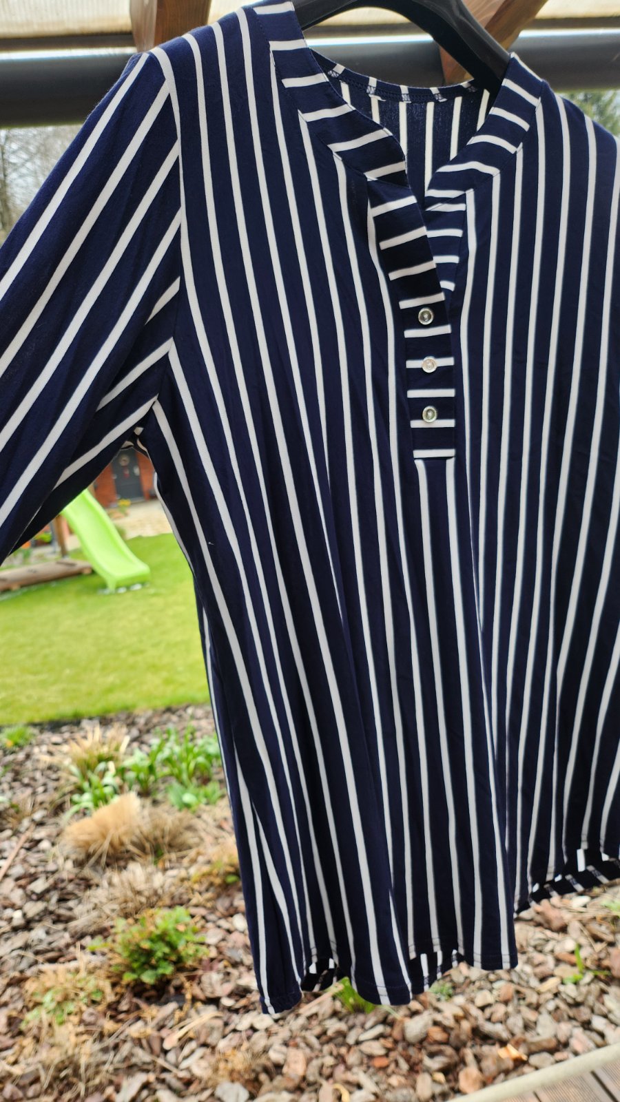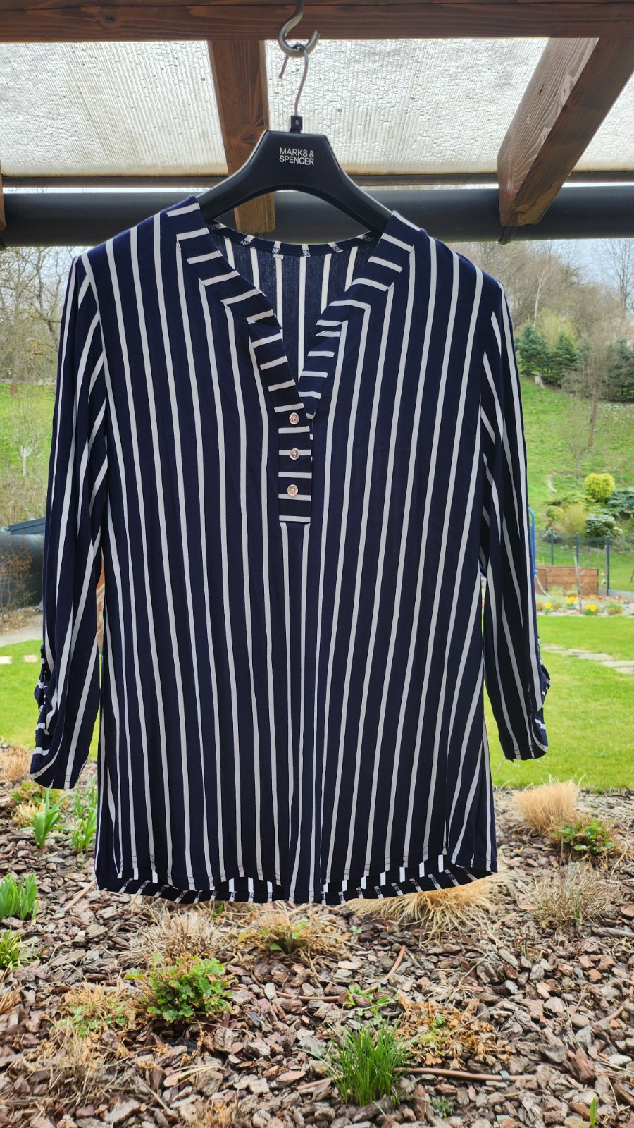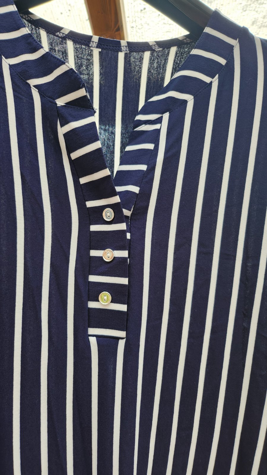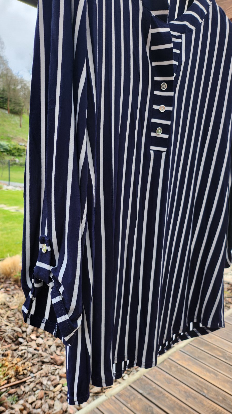 Výrazná elegantná tunika s podielom elastanu, vzdušná látka, ideálna na leto. Rukávy ukončené gombíkovou légou, rovnakou aká je použitá v dekolte. Kupovaná v talianskom obchode, žiadna lacná Čína.
