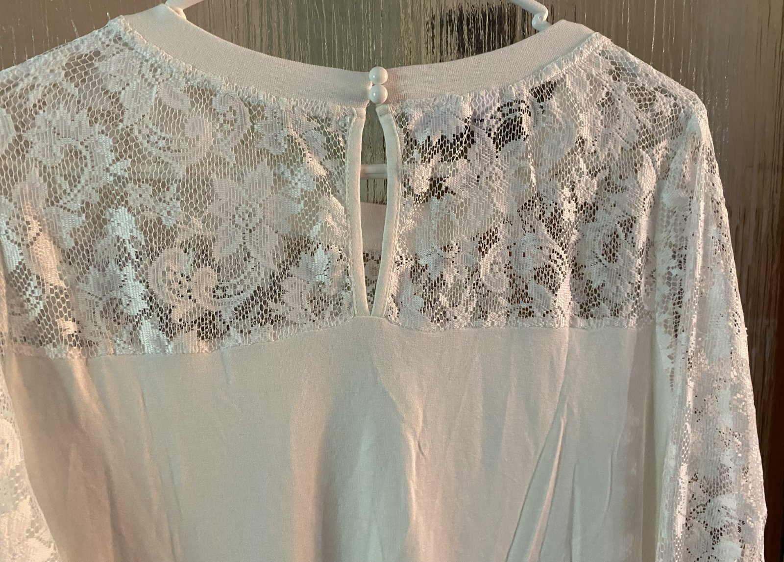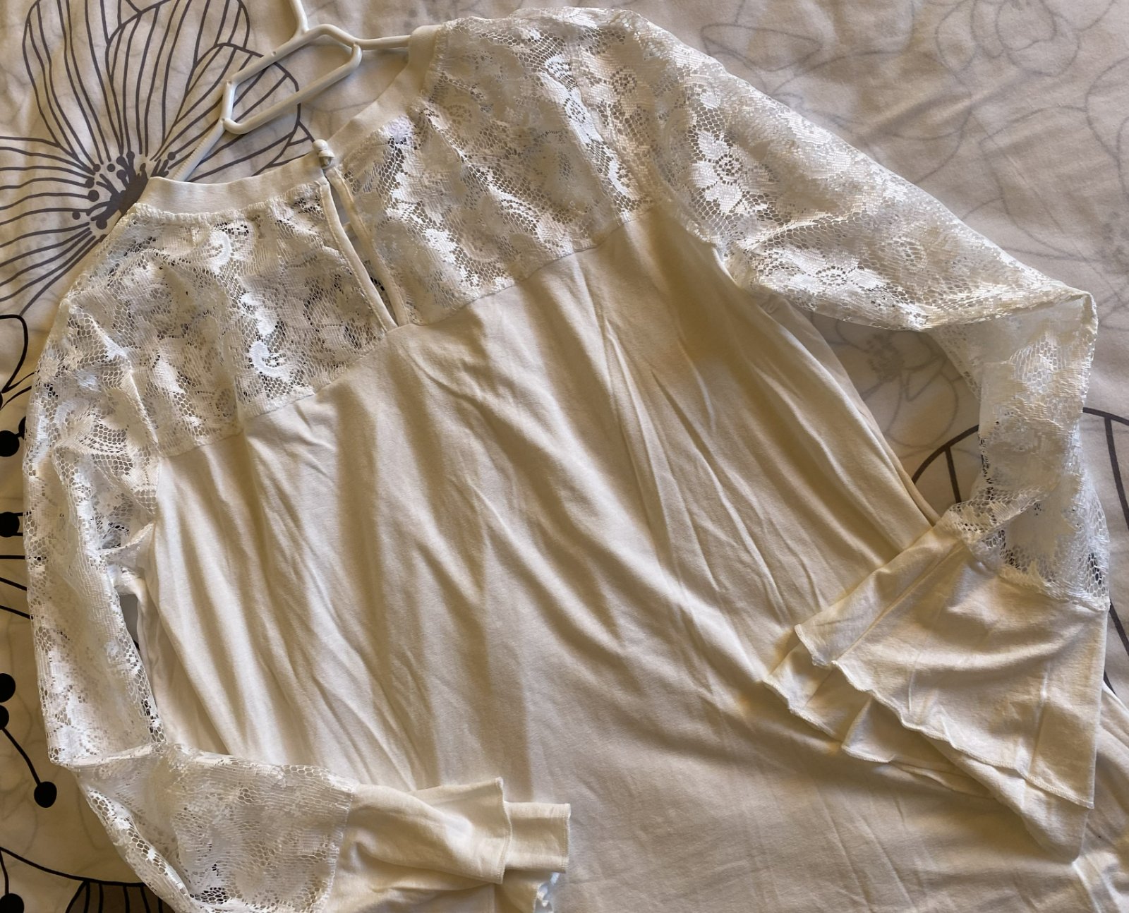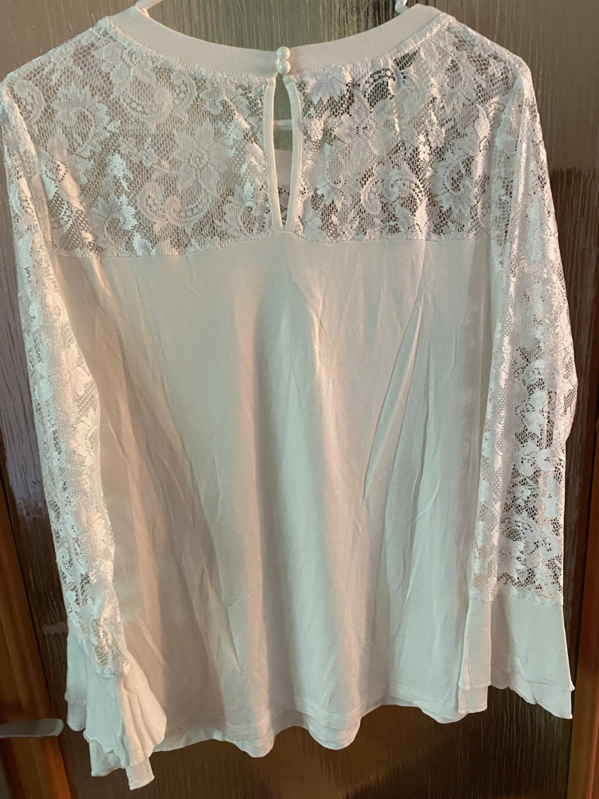 Tričko - top s čipkou Bodyflirt v. 42, materiál elastický "tričkový" materiál 95% viskóza, 5% elastan - tričkový elastický materiál, veľmi pekná čipka, pekná snehobiela farba, raz oblečený, v top stave. Miery: dĺžka 65cm, šírka v podpazuší: 55cmx2.