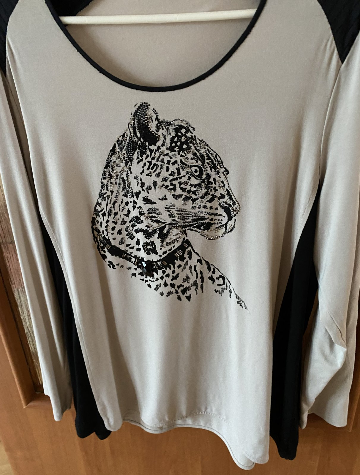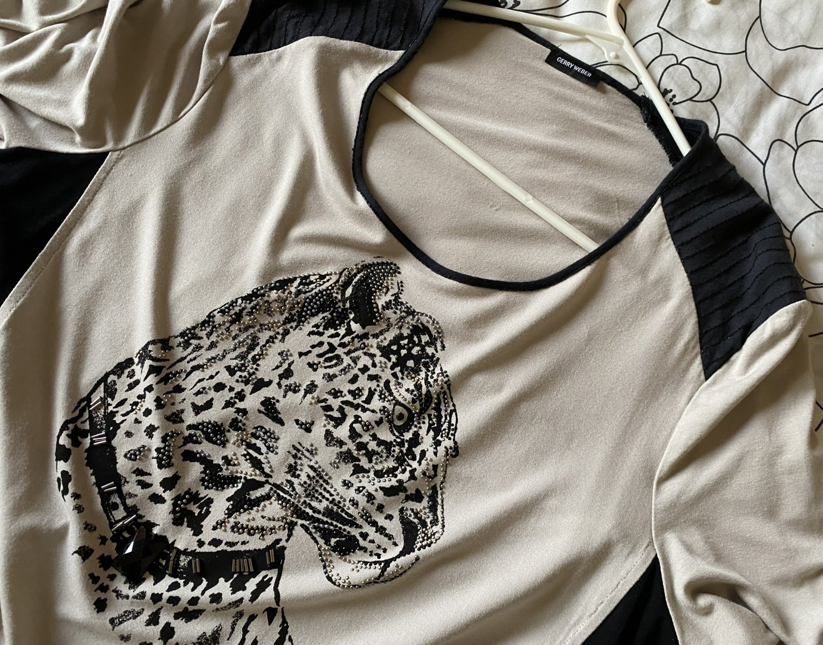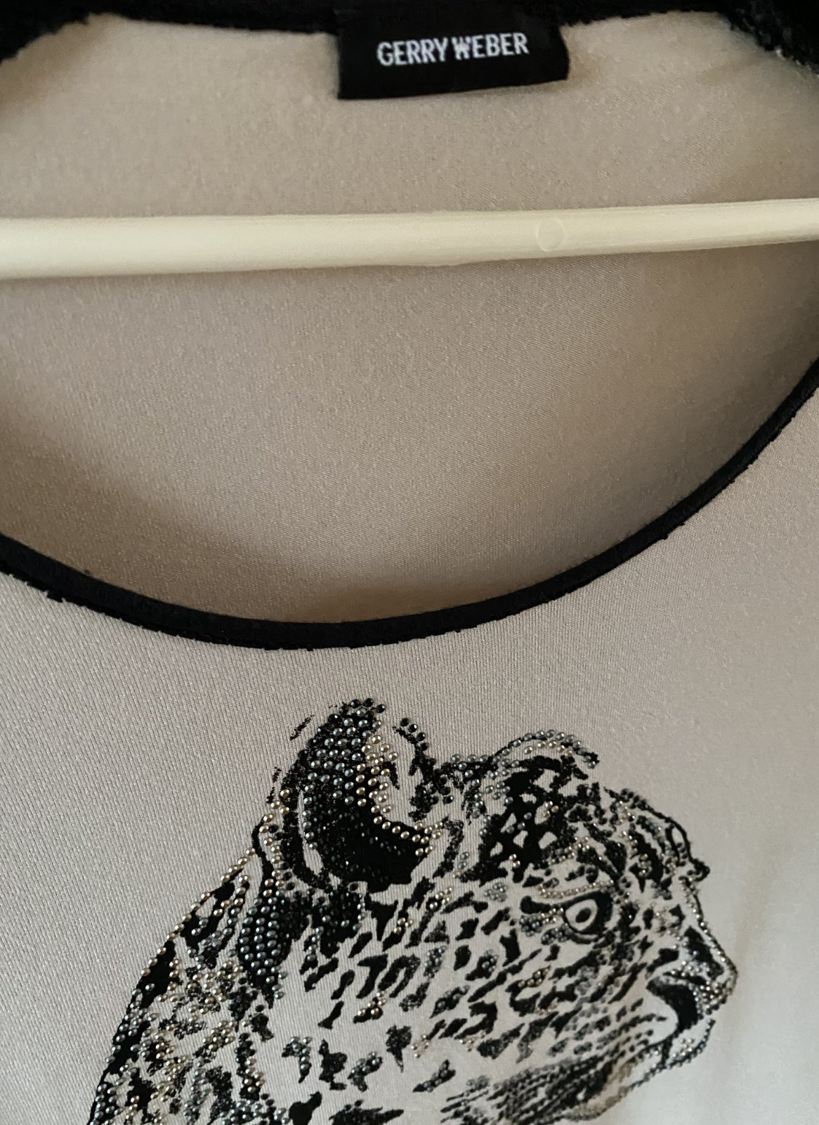 Tričko s aplikáciou kamienkami GERRY WEBER, už bez označenia a visačky, dávam v. XL - premerajte, farba béžová kombinácii s čiernou a kamienkami, veľmi príjemný materiál na nosenie, málo nosený na striedačku s inými. Miery merané v kľude, je pružné, všade povolí: dĺžka od krku dolu: 70, šírka v podpazuší: 55cmx2, šírka dolu - spodná časť: 60cm, rukáv od ramena: 59cm + 12cm plece - rameno vrátane lemu okolo krku.