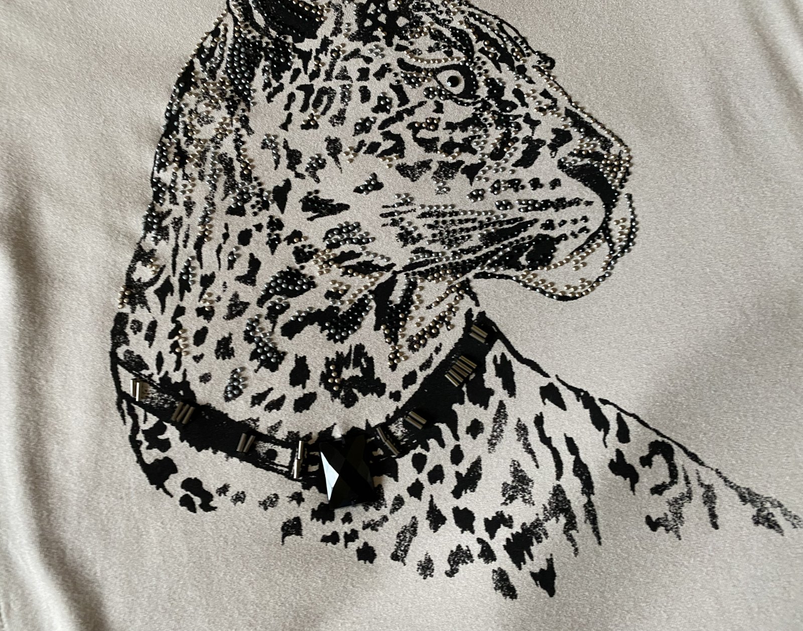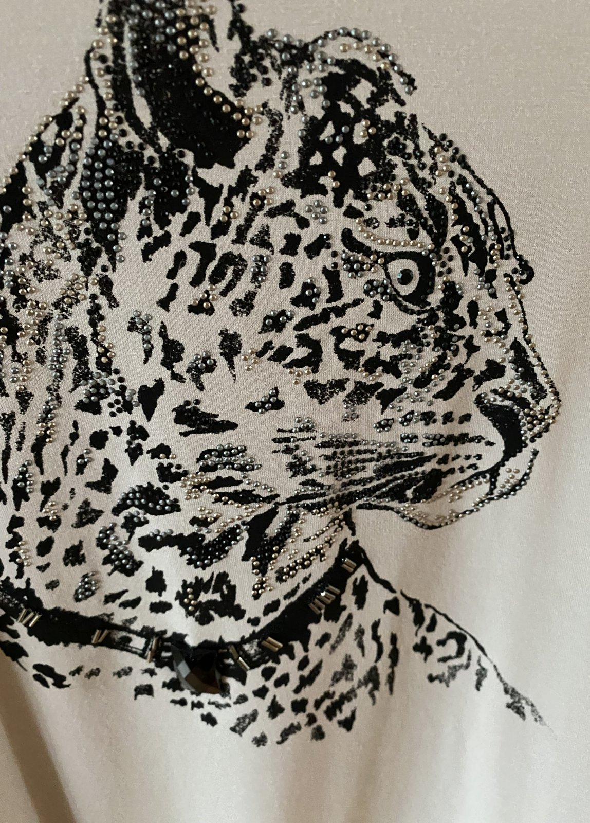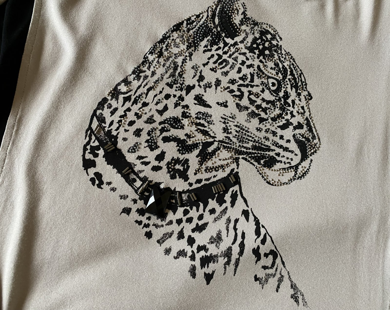 Tričko s aplikáciou kamienkami GERRY WEBER, už bez označenia a visačky, dávam v. XL - premerajte, farba béžová kombinácii s čiernou a kamienkami, veľmi príjemný materiál na nosenie, málo nosený na striedačku s inými. Miery merané v kľude, je pružné, všade povolí: dĺžka od krku dolu: 70, šírka v podpazuší: 55cmx2, šírka dolu - spodná časť: 60cm, rukáv od ramena: 59cm + 12cm plece - rameno vrátane lemu okolo krku.