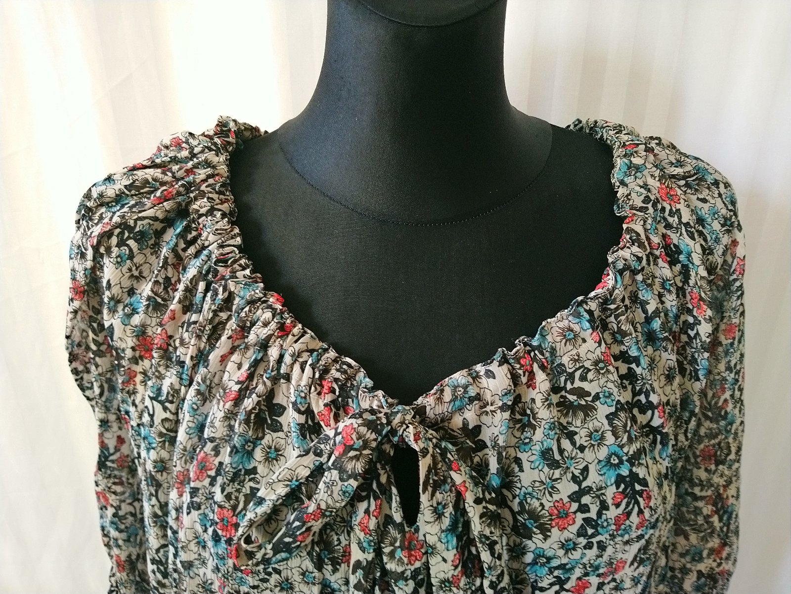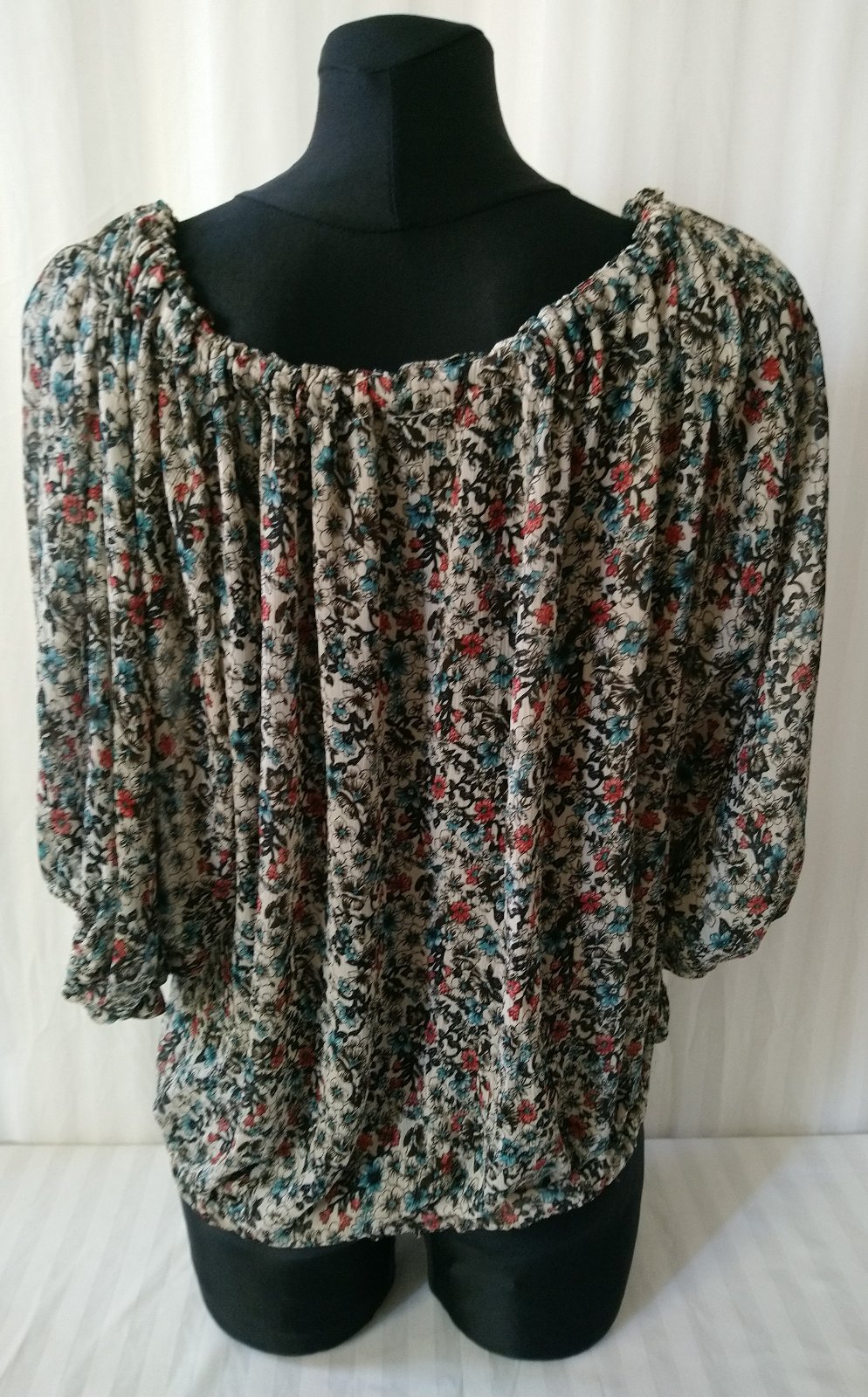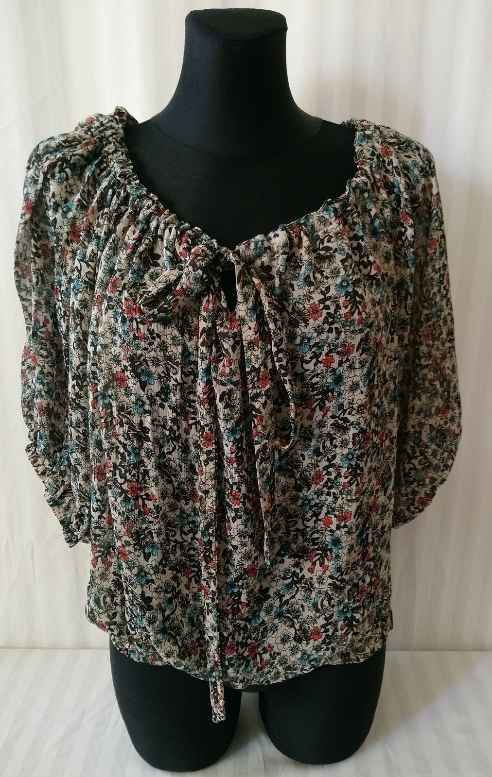 dámsky top s farebným kvetinovým vzorom, rukávy a spodok zakončený do gumičky, výstrih nariasený do šnúrky na zaviazanie,