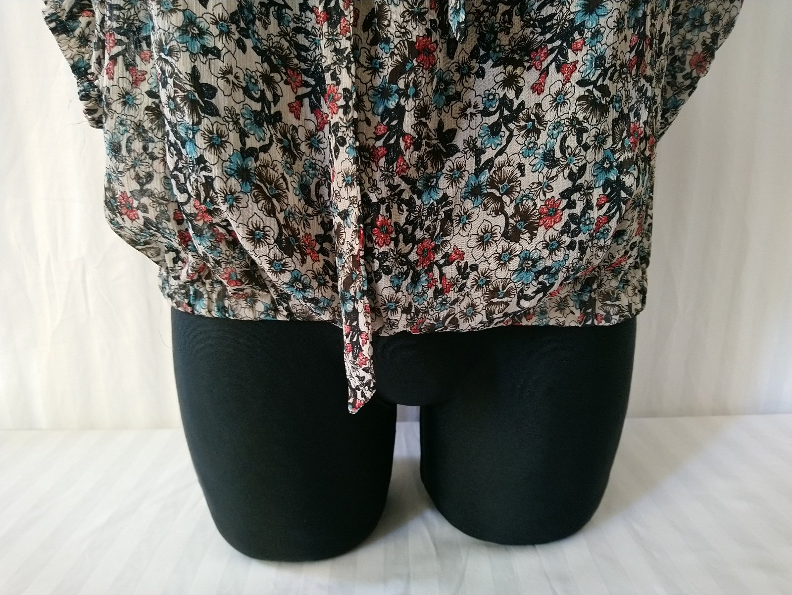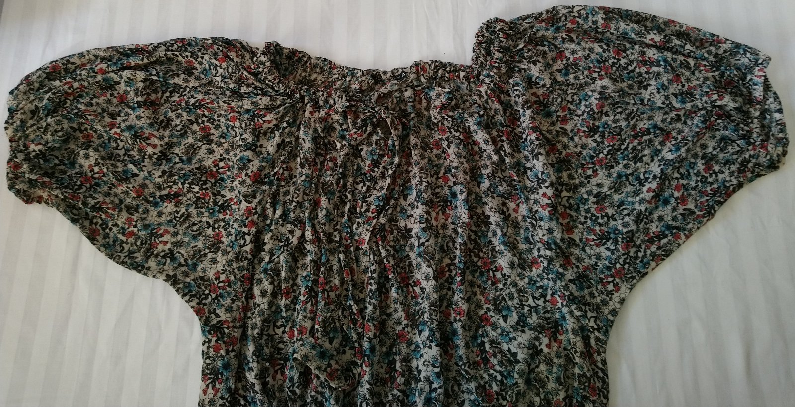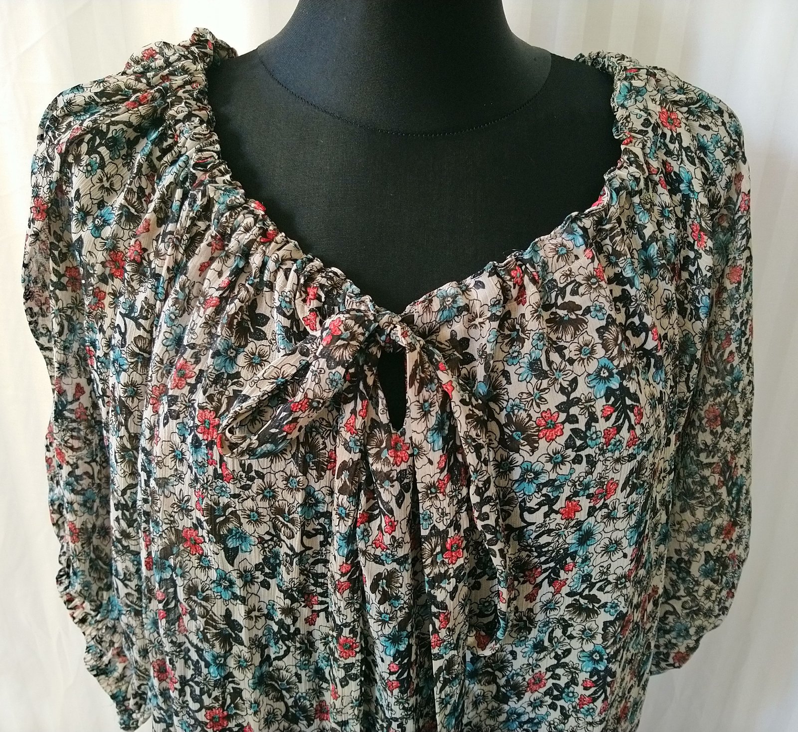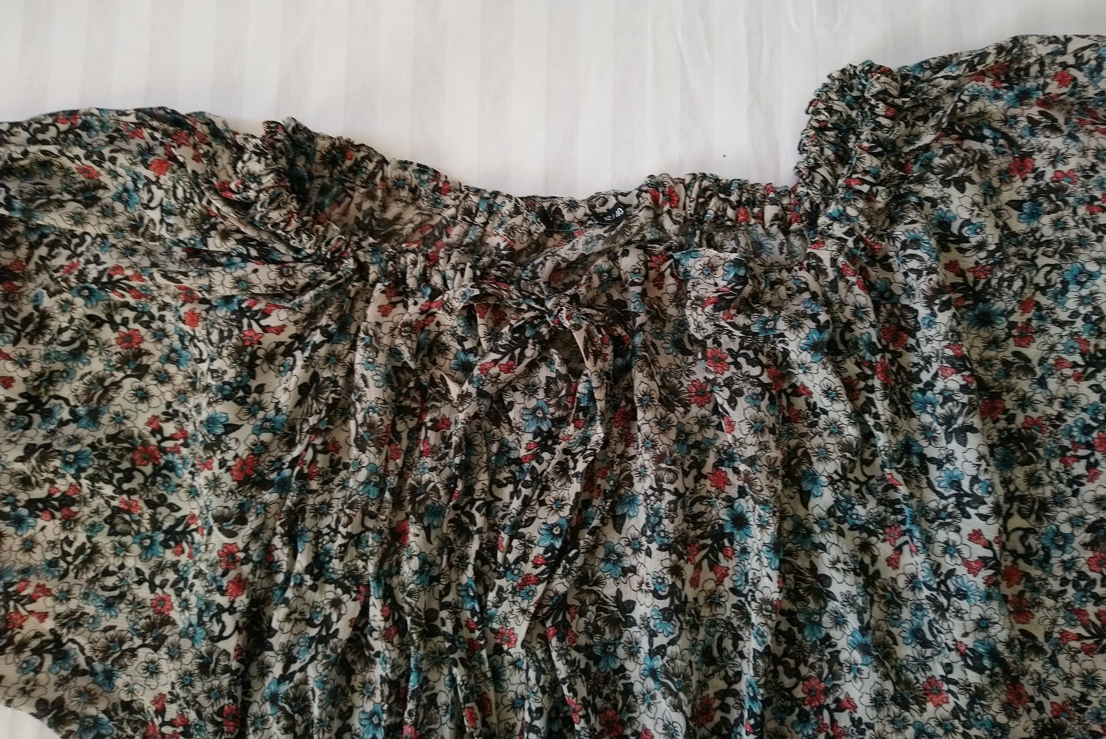 dámsky top s farebným kvetinovým vzorom, rukávy a spodok zakončený do gumičky, výstrih nariasený do šnúrky na zaviazanie,