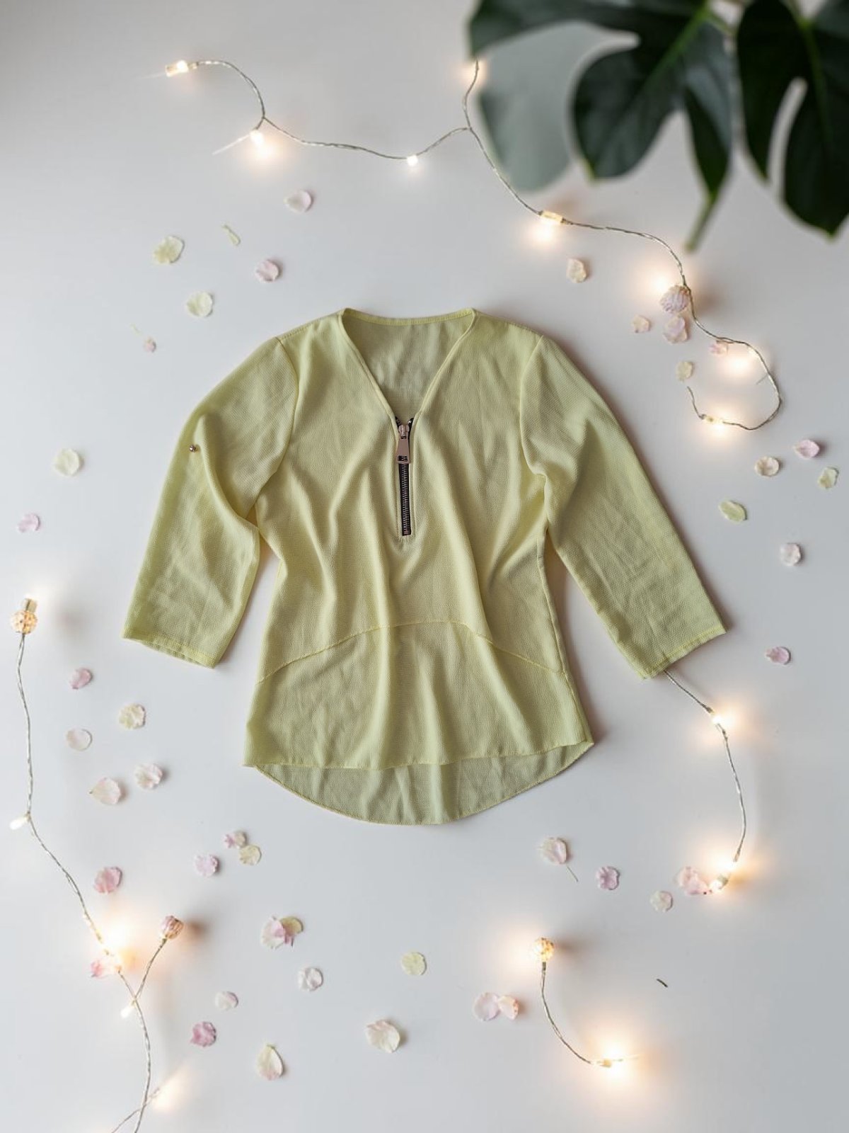 dámsky žltý top so zipsom a zaujímavým strihom