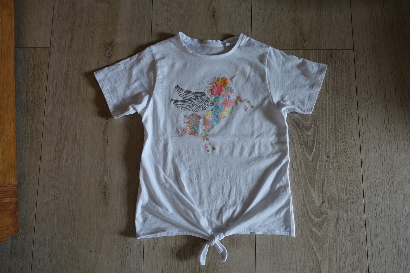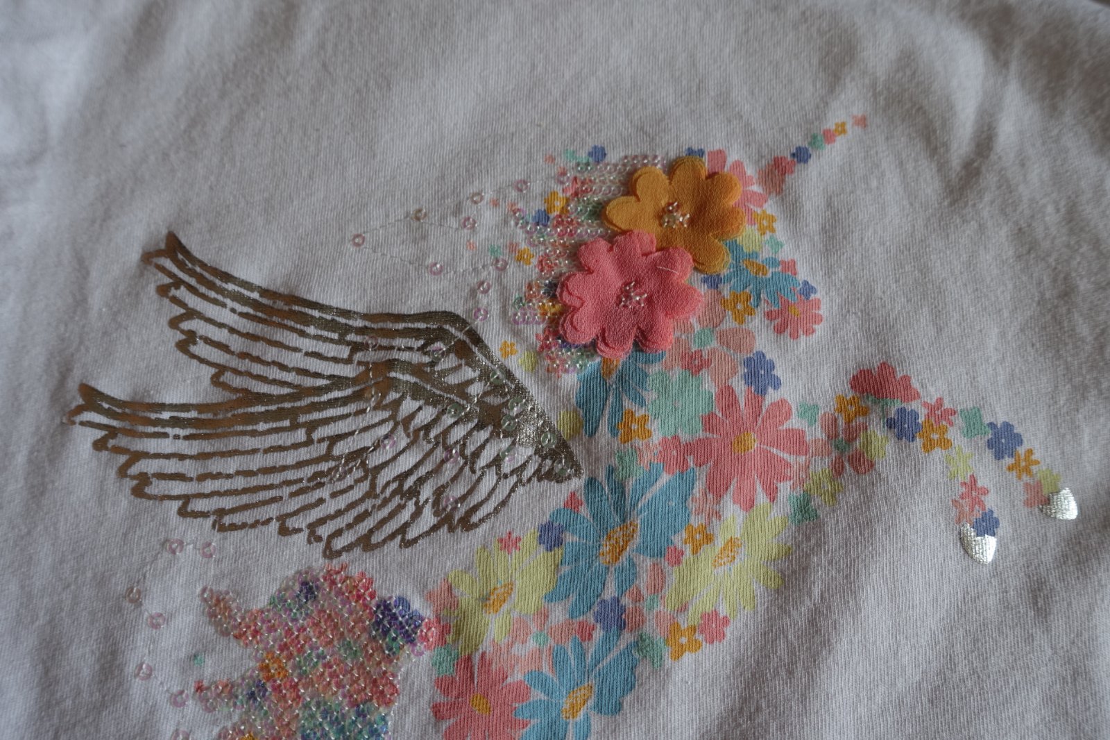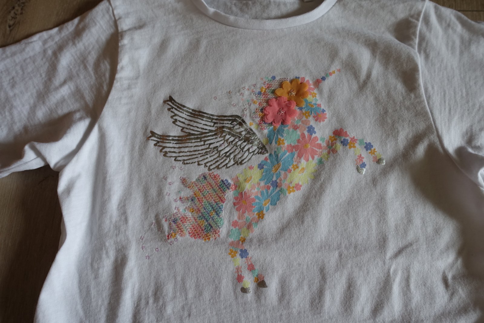 Predám krásne biele tričenko s jednorožcom. Prekrásne, v skutočnosti krajšie ako na foto. Flitre sa nepretáčajú, sú na pevno. Z opaku je koník podšitý. Mali sme ho max 2x, nestihli sme využiť, kúpené žiaľ neskoro. Je top stav. Nemá fľaky, ani žmolky, ani iné poškodenie. Celková dĺžka tričenka od pliecka po spodok je 48 cm. (G)