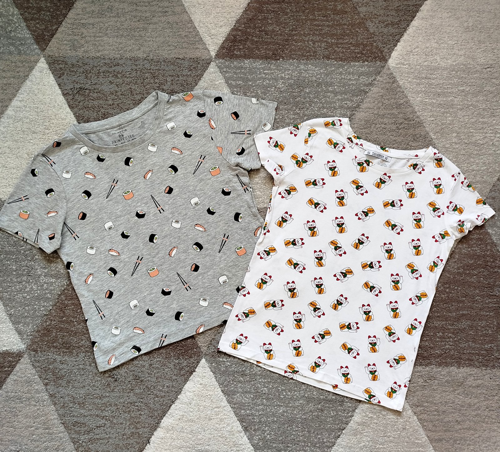Milé tričká v peknom stave, veľkosť XS. Sivé tričko Sushi z Primarku má širší pohodlný strih, dĺžka 51cm, šírka 43cm. Biele tričko Mačka šťastia z Pull&Beat dĺžka 54cm, šírka 39cm. Cena a predaj LEN SPOLU + pošta.