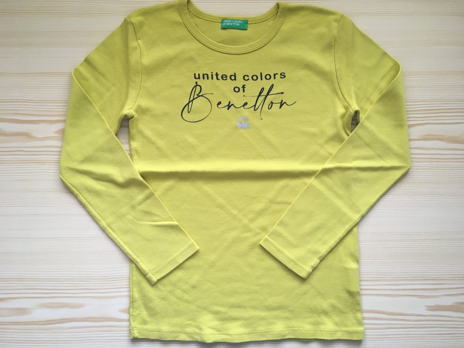 Limetkovo žlté bavlnené tričko s dlhým rukávom vo výbornom nosenom stave značky Benetton. Uvedená veľkosť L (140), zodpovedá veľkosti 134/140.